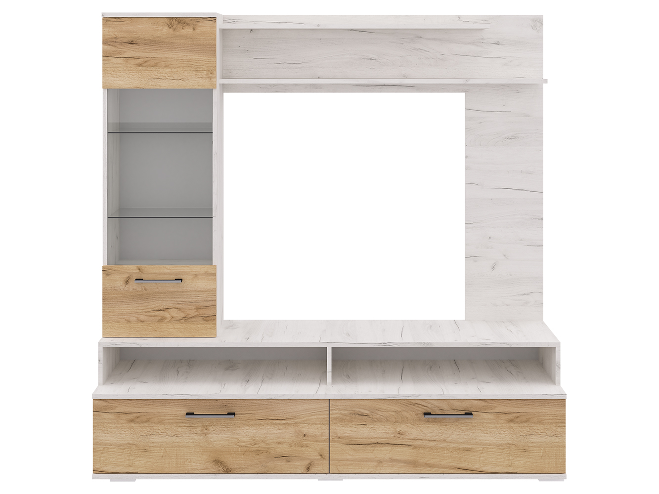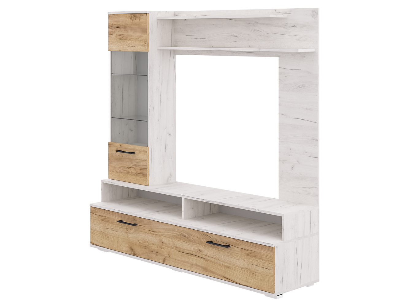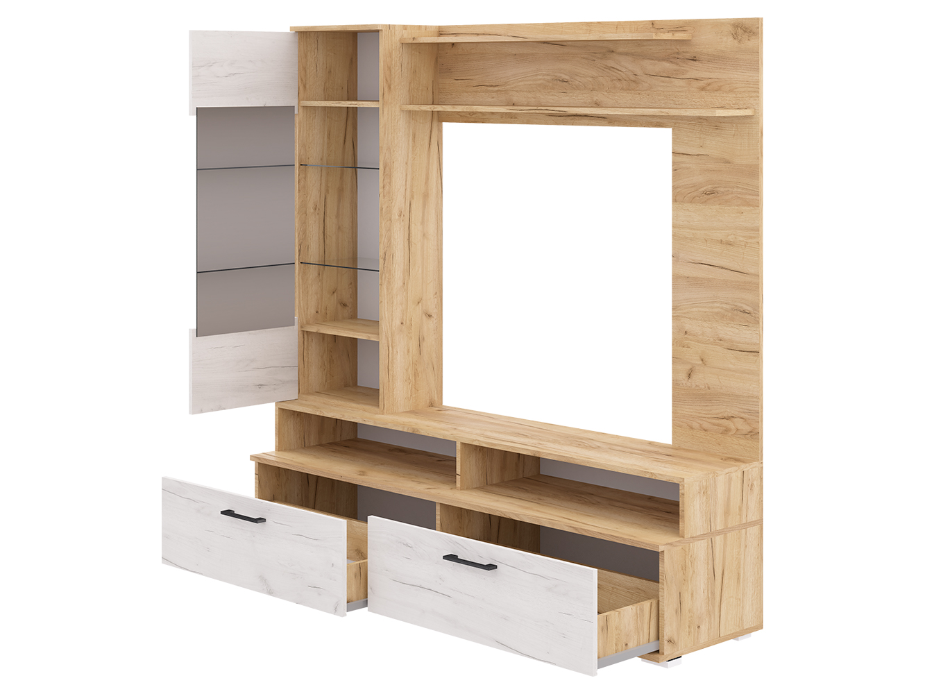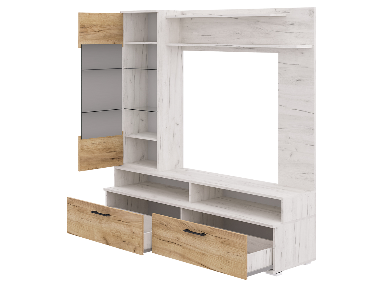 Стенку поддерживают шесть регулируемых опор цвета «хром», имеется пять ниш открытого типа для хранения и семь закрытого типа, включая фасад, вмещающий четыре полки за стилизованной дверцей.