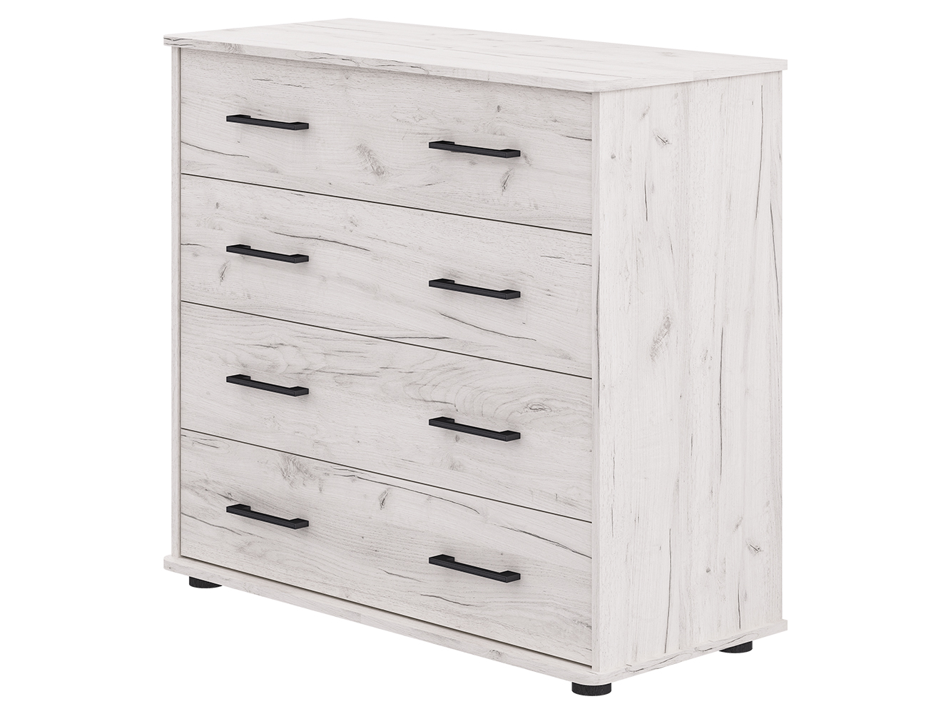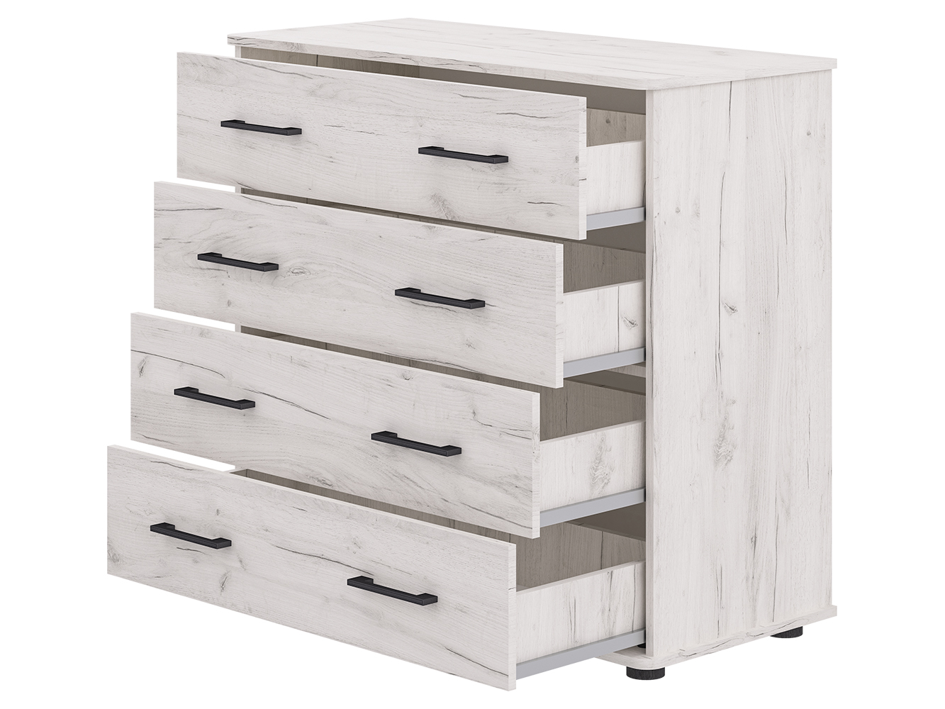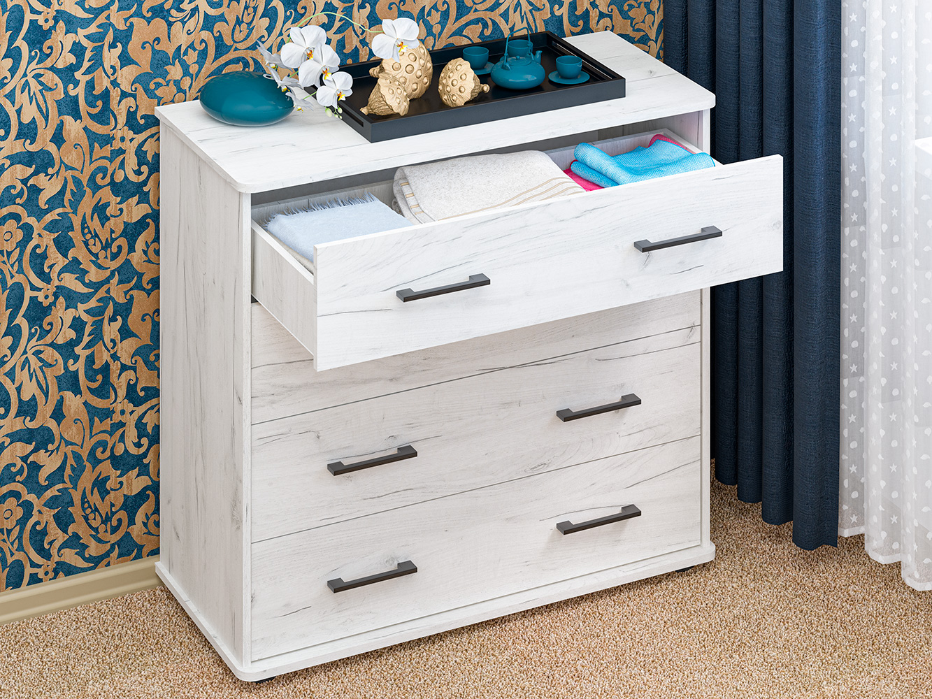 Модель оснащена четырьмя выдвижными ящиками с шариковыми направляющими полного выдвижения. Плавный и бесшумный ход обеспечивает комфортное использование каждый день, а полный доступ к содержимому упрощает хранение одежды, белья, документов и других вещей.
