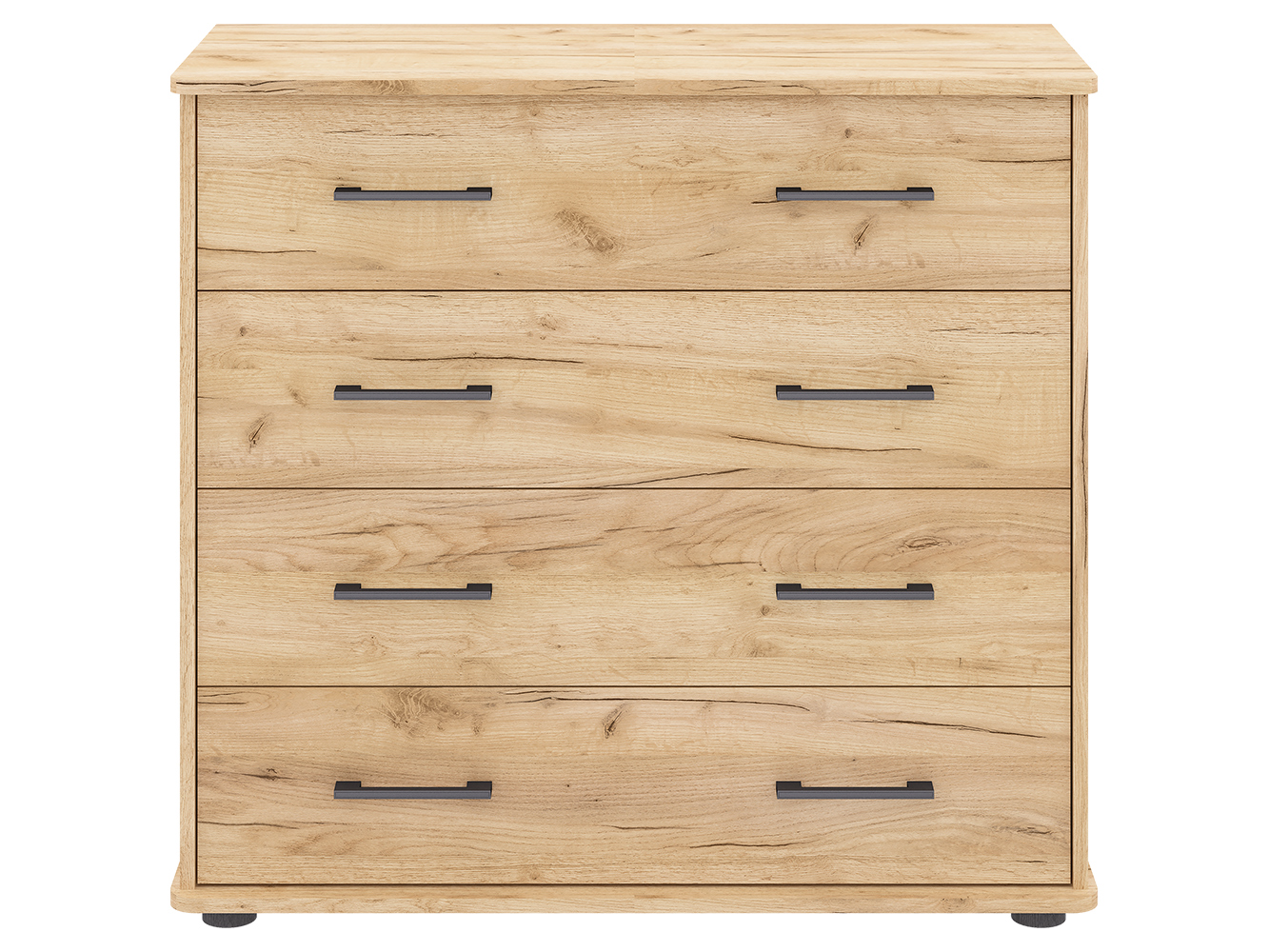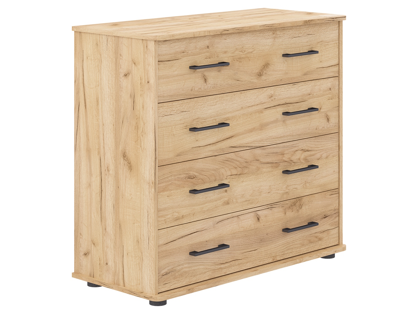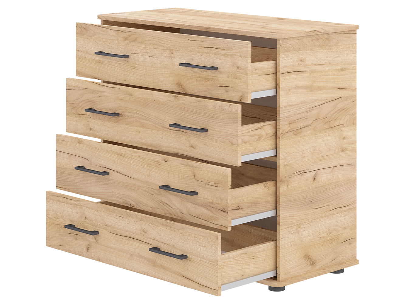 Модель оснащена четырьмя выдвижными ящиками с шариковыми направляющими полного выдвижения. Плавный и бесшумный ход обеспечивает комфортное использование каждый день, а полный доступ к содержимому упрощает хранение одежды, белья, документов и других вещей.