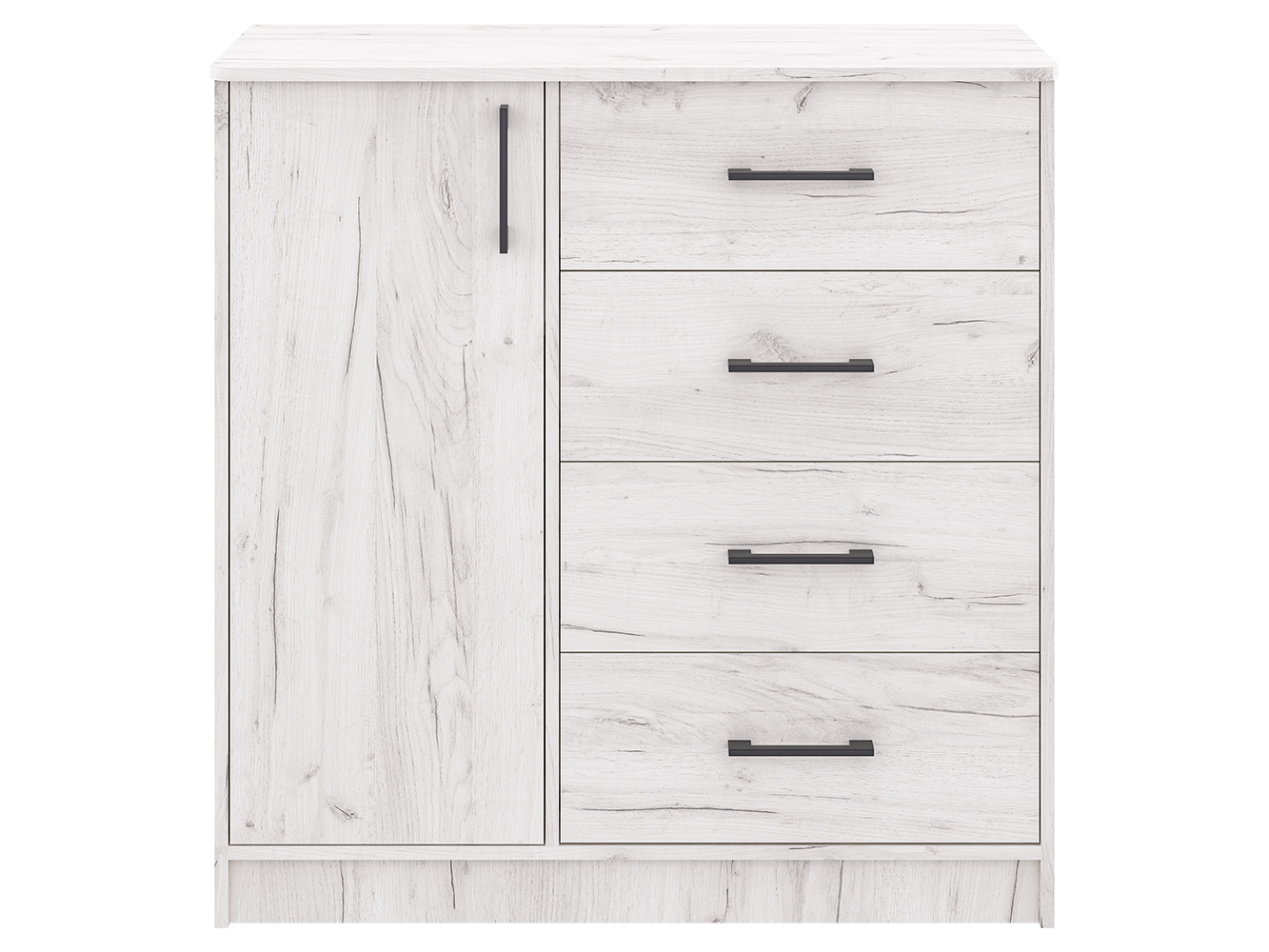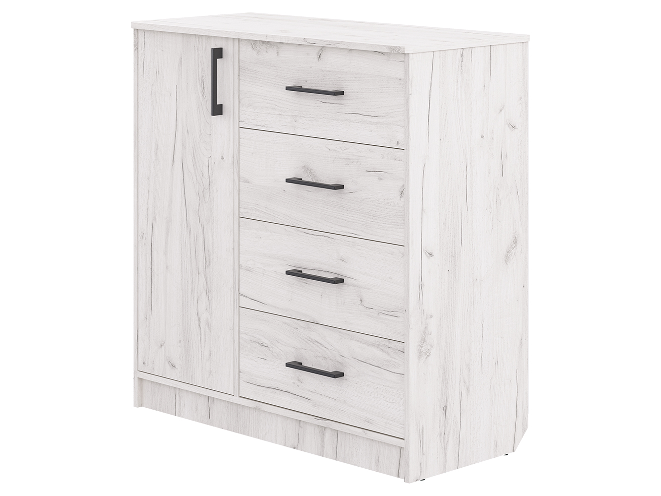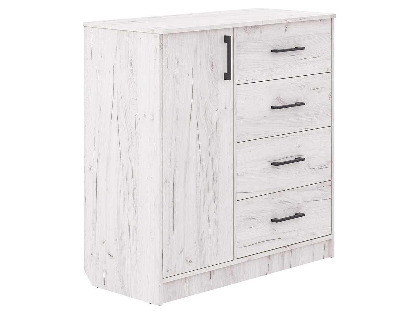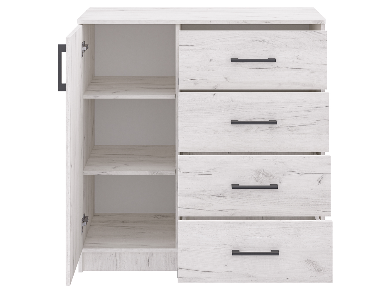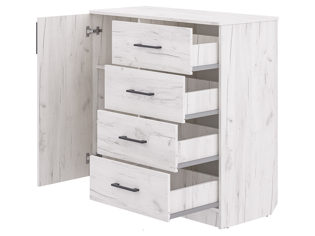 Модель сочетает два формата хранения: выдвижные ящики и закрытую секцию. Четыре ящика на шариковых направляющих полного выдвижения обеспечивают плавный и бесшумный ход, что делает использование удобным в повседневной жизни. В левой части расположен шкафчик с распашной дверцей, внутри которого предусмотрены три дополнительные ниши для хранения вещей, которые лучше держать вне зоны видимости.