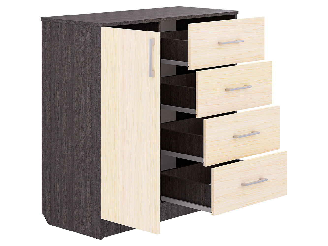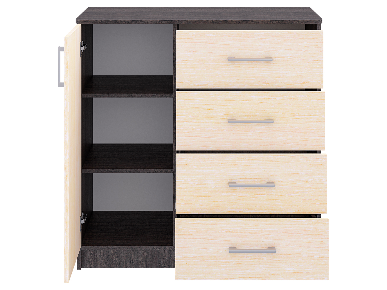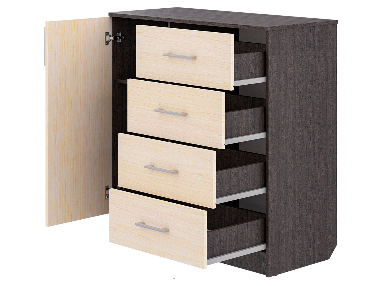 Модель сочетает два формата хранения: выдвижные ящики и закрытую секцию. Четыре ящика на шариковых направляющих полного выдвижения обеспечивают плавный и бесшумный ход, что делает использование удобным в повседневной жизни. В левой части расположен шкафчик с распашной дверцей, внутри которого предусмотрены три дополнительные ниши для хранения вещей, которые лучше держать вне зоны видимости.