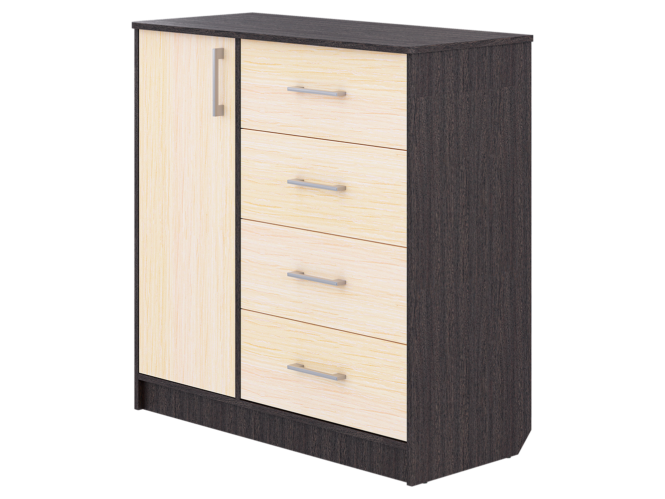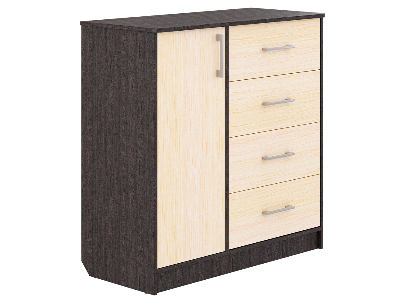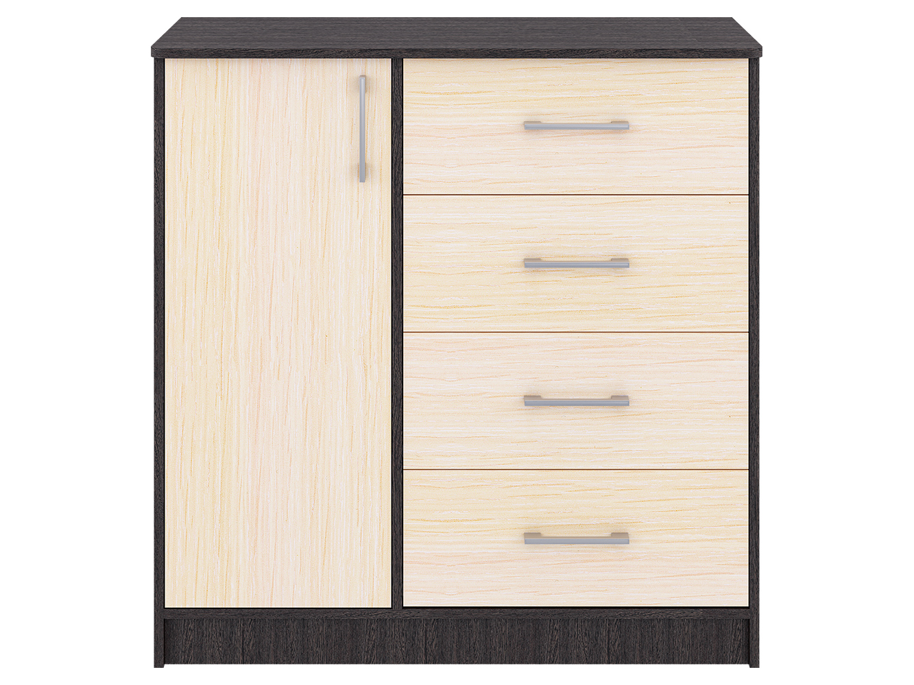 Модель сочетает два формата хранения: выдвижные ящики и закрытую секцию. Четыре ящика на шариковых направляющих полного выдвижения обеспечивают плавный и бесшумный ход, что делает использование удобным в повседневной жизни. В левой части расположен шкафчик с распашной дверцей, внутри которого предусмотрены три дополнительные ниши для хранения вещей, которые лучше держать вне зоны видимости.