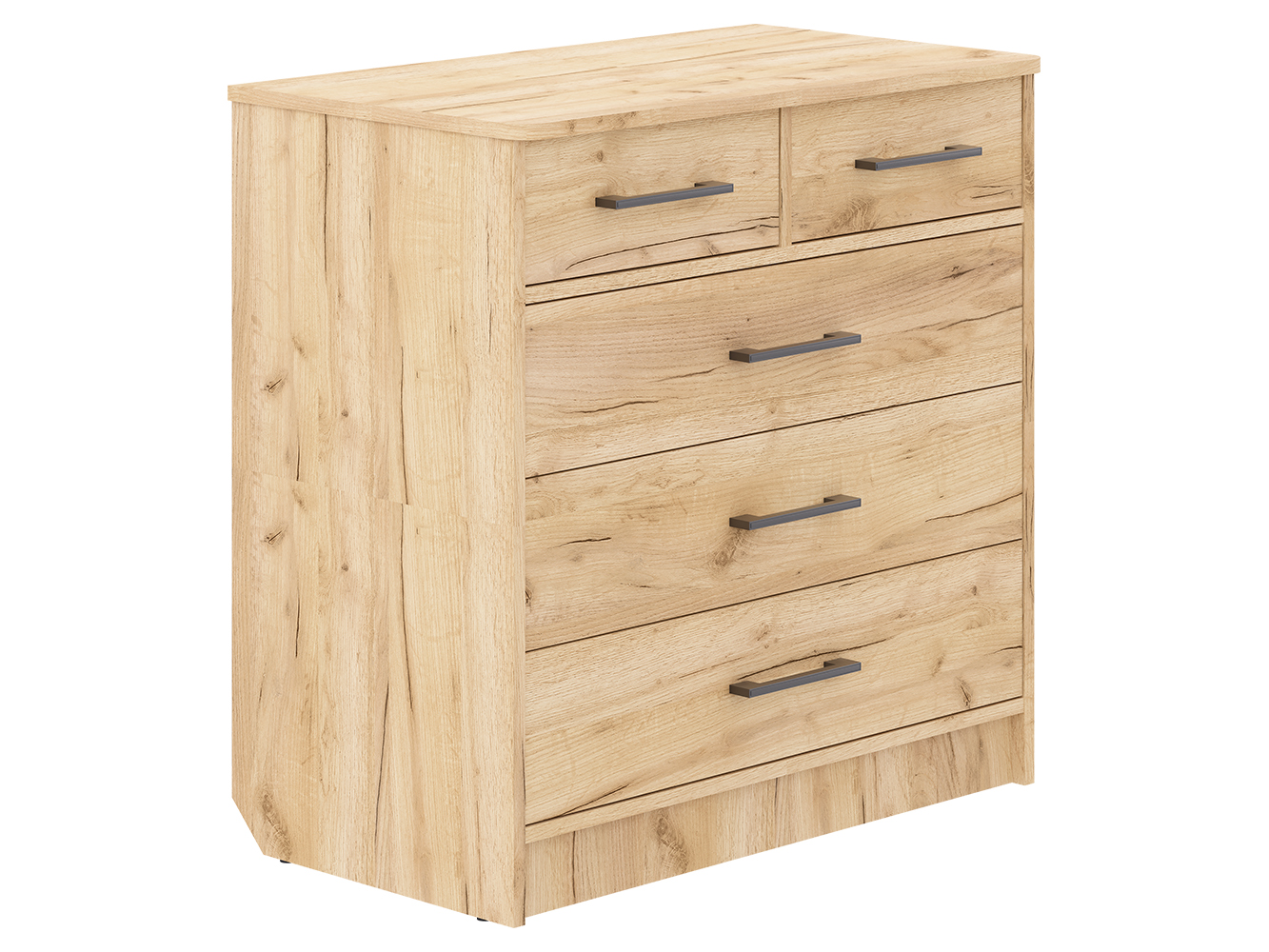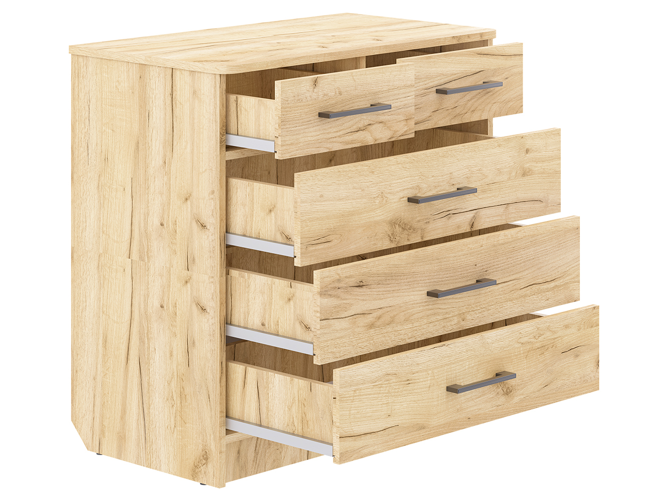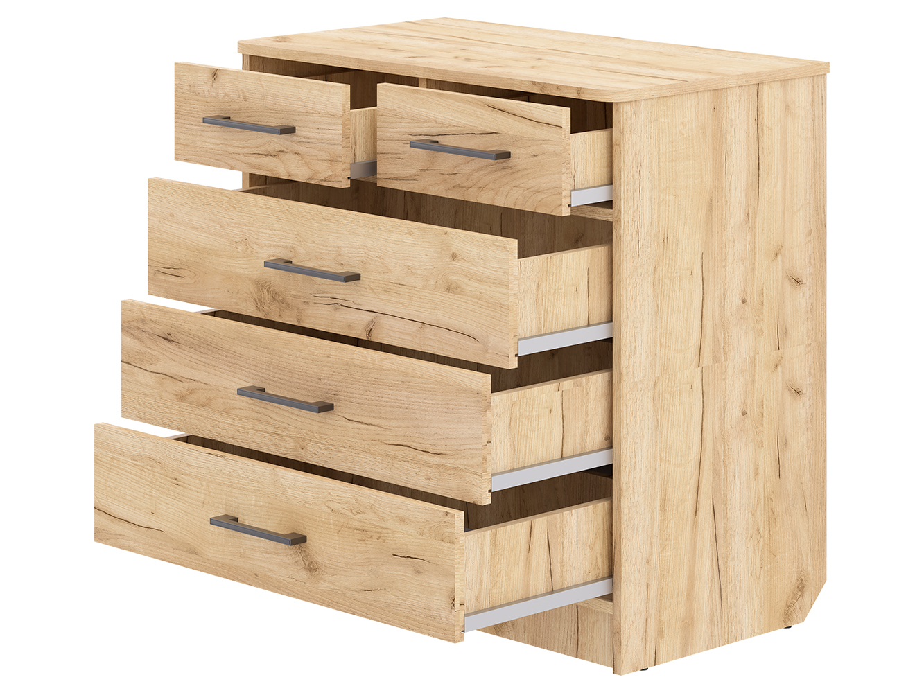 Модель оснащена пятью вместительными ящиками с направляющими полного выдвижения. Плавный и бесшумный ход обеспечивает комфортное ежедневное использование, а продуманная конструкция позволяет удобно хранить одежду, белье, документы и другие вещи.