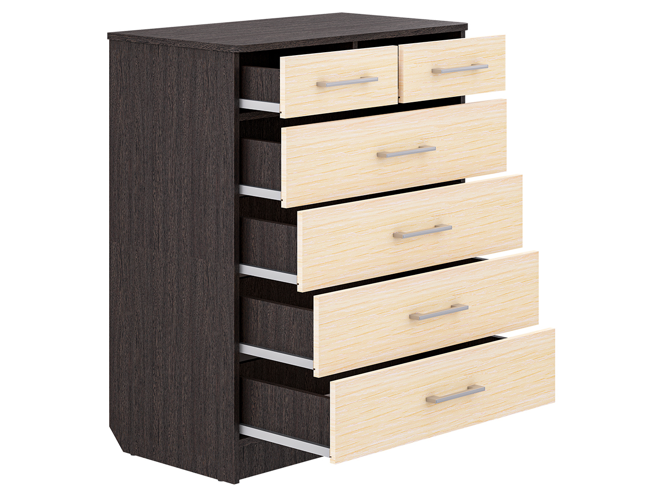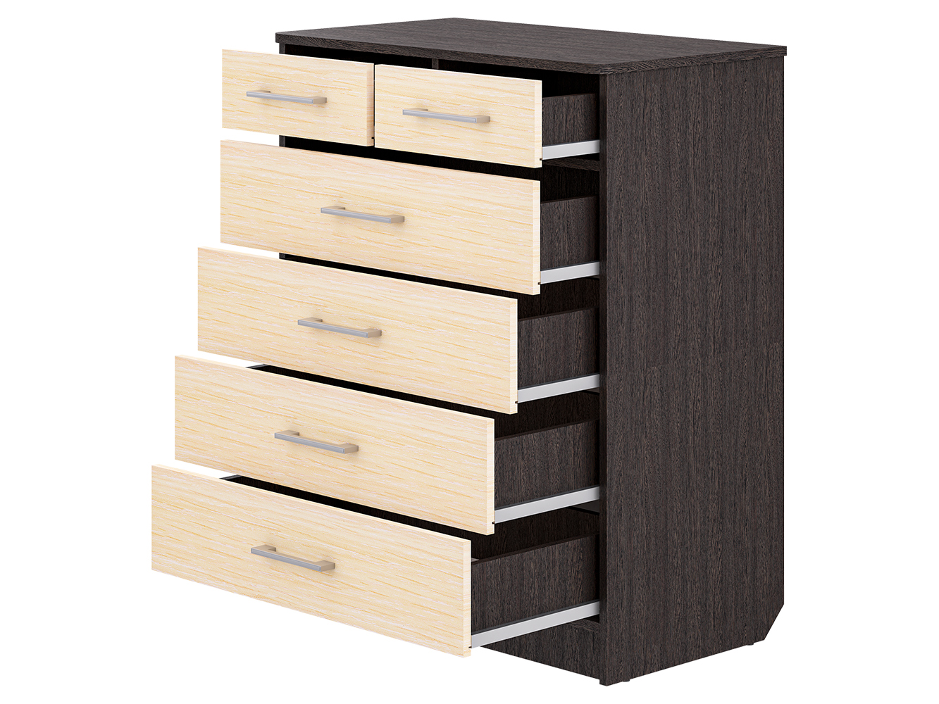 Комод оснащен шестью выдвижными ящиками, которые обеспечивают удобное размещение одежды, белья, документов и других вещей. Шариковые направляющие полного выдвижения гарантируют плавный и бесшумный ход, обеспечивая комфортное ежедневное использование и полный доступ к содержимому.