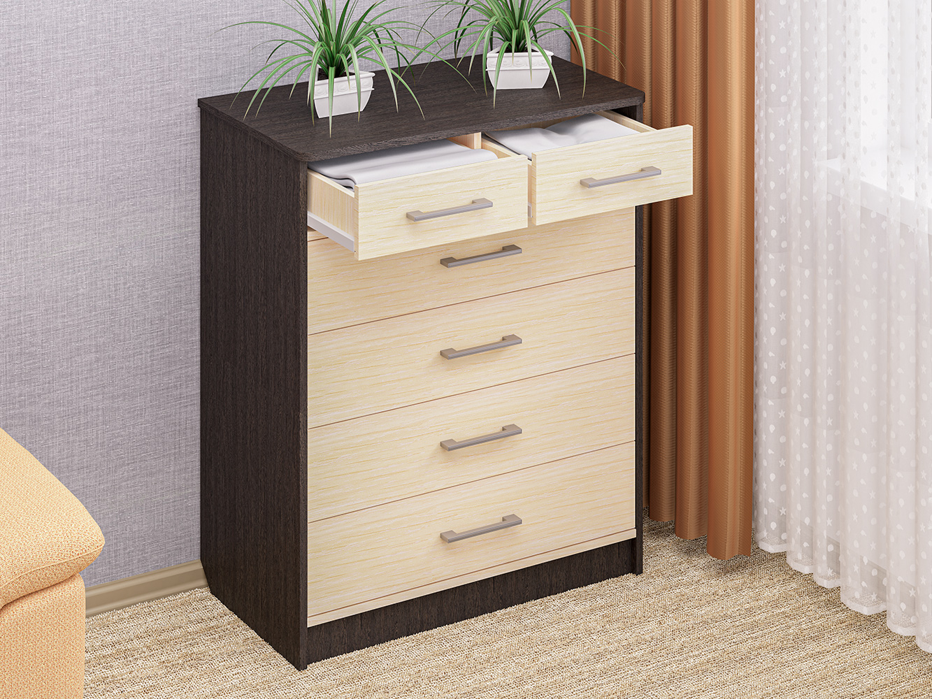 Комод для вещей №11 — практичное и вместительное решение для организации хранения в доме. Благодаря продуманной конструкции и компактным габаритам модель подходит для спальни, гостиной, прихожей или детской комнаты, не перегружая пространство.