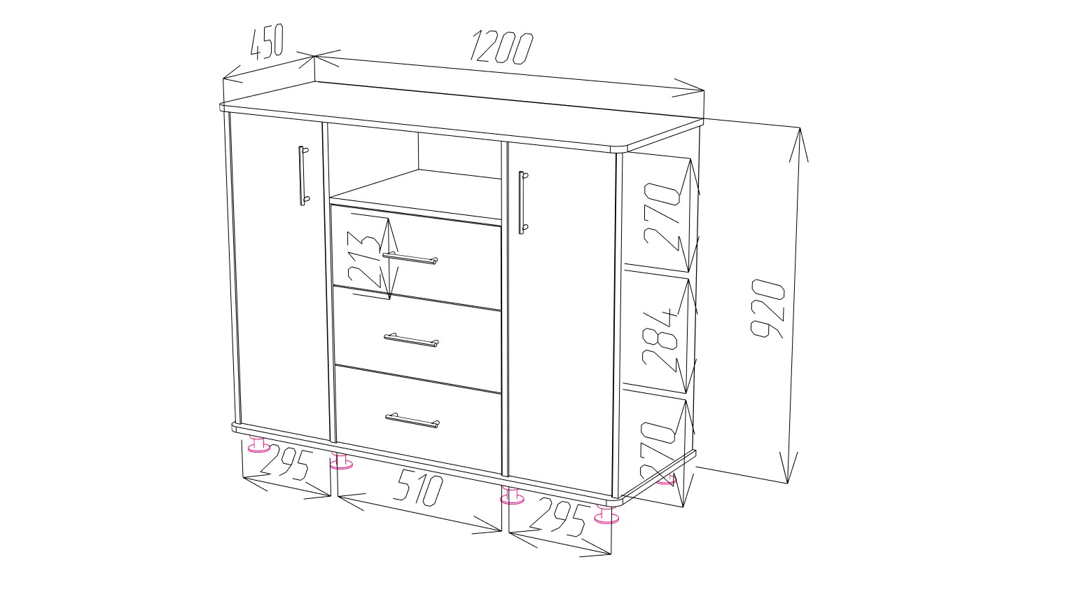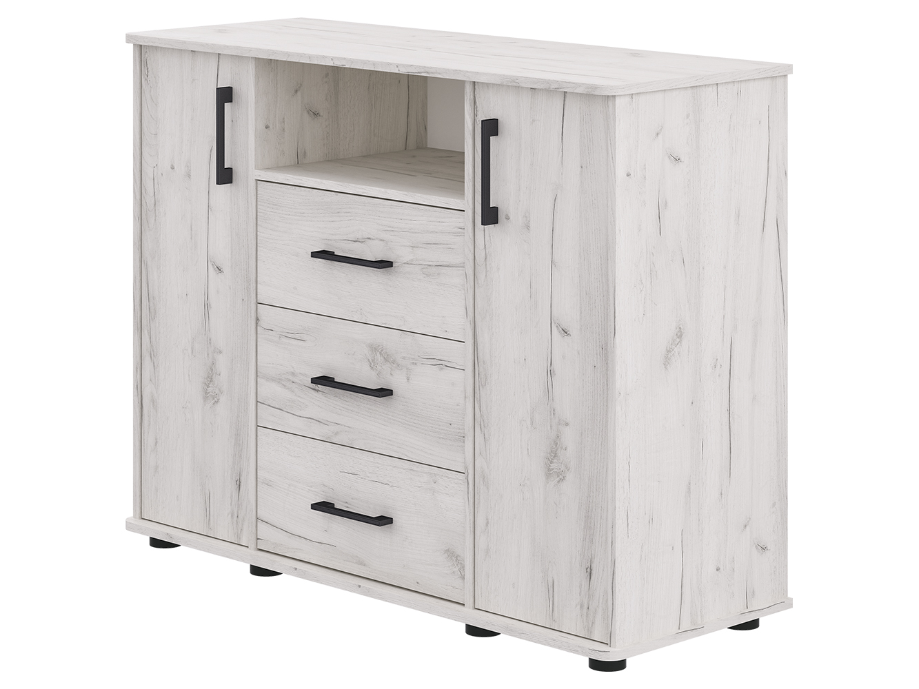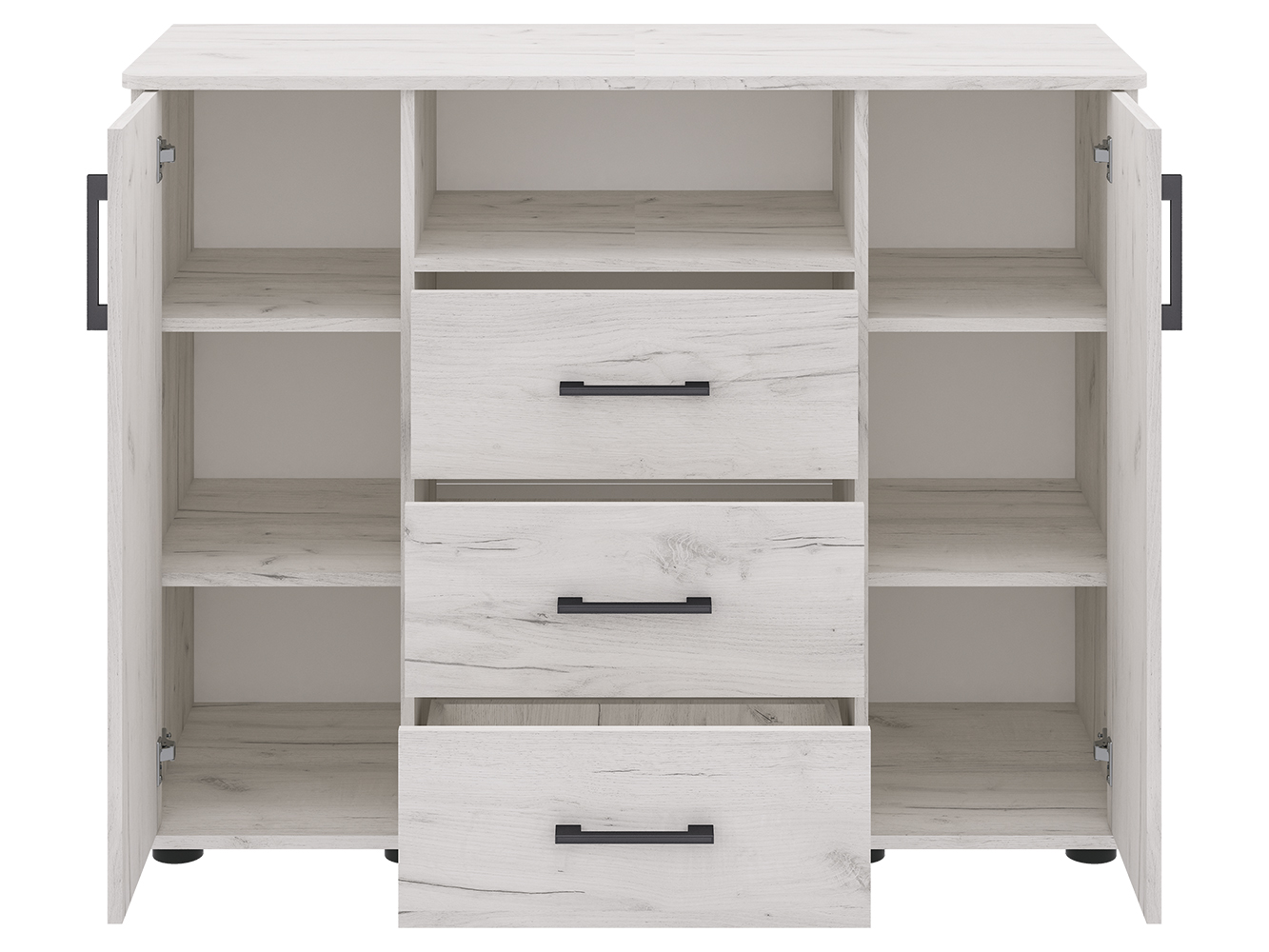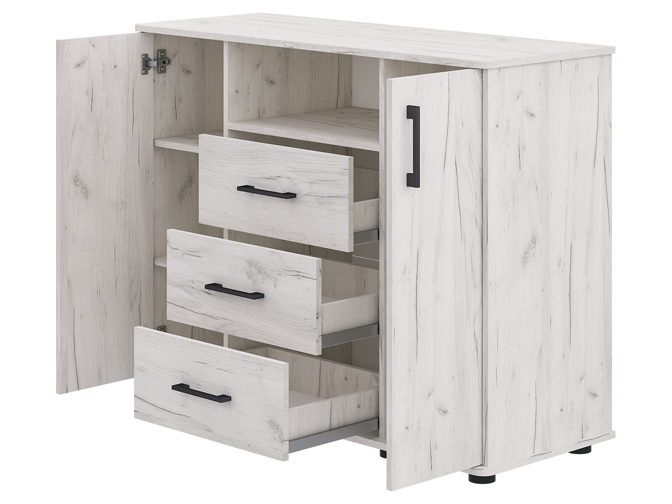 Модель сочетает несколько зон хранения. Три выдвижных ящика на шариковых направляющих полного выдвижения обеспечивают плавный и бесшумный ход, что делает использование комфортным каждый день. Под столешницей расположена открытая ниша для быстрого доступа к необходимым предметам. За двумя распашными дверцами находятся шесть вместительных полок — по три с каждой стороны, что позволяет удобно распределить вещи.