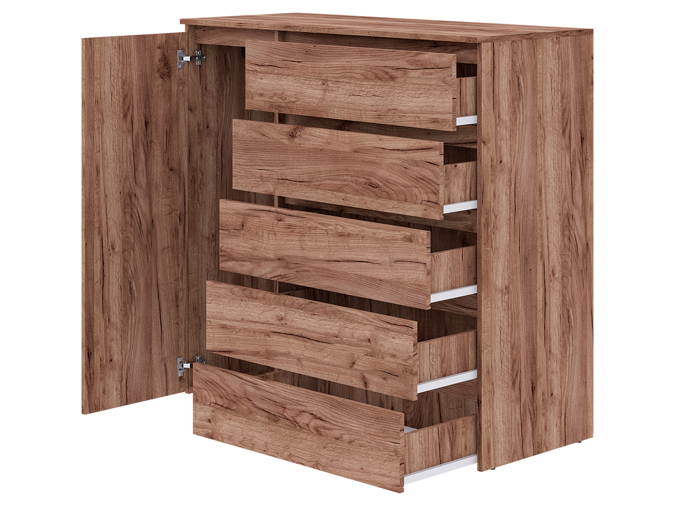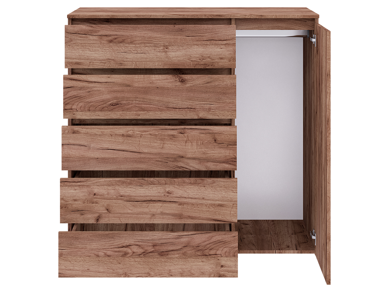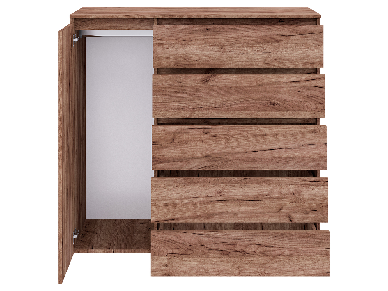 Конструкция включает пять выдвижных ящиков с шариковыми направляющими полного выдвижения. Плавный и бесшумный ход обеспечивает комфортное использование, а полный доступ к содержимому делает хранение более удобным. Дополнительно предусмотрен распашной шкафчик с вешалкой для одежды, что позволяет хранить вещи, требующие вертикального размещения.