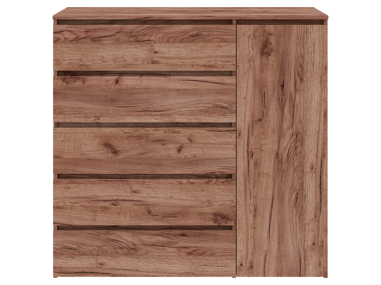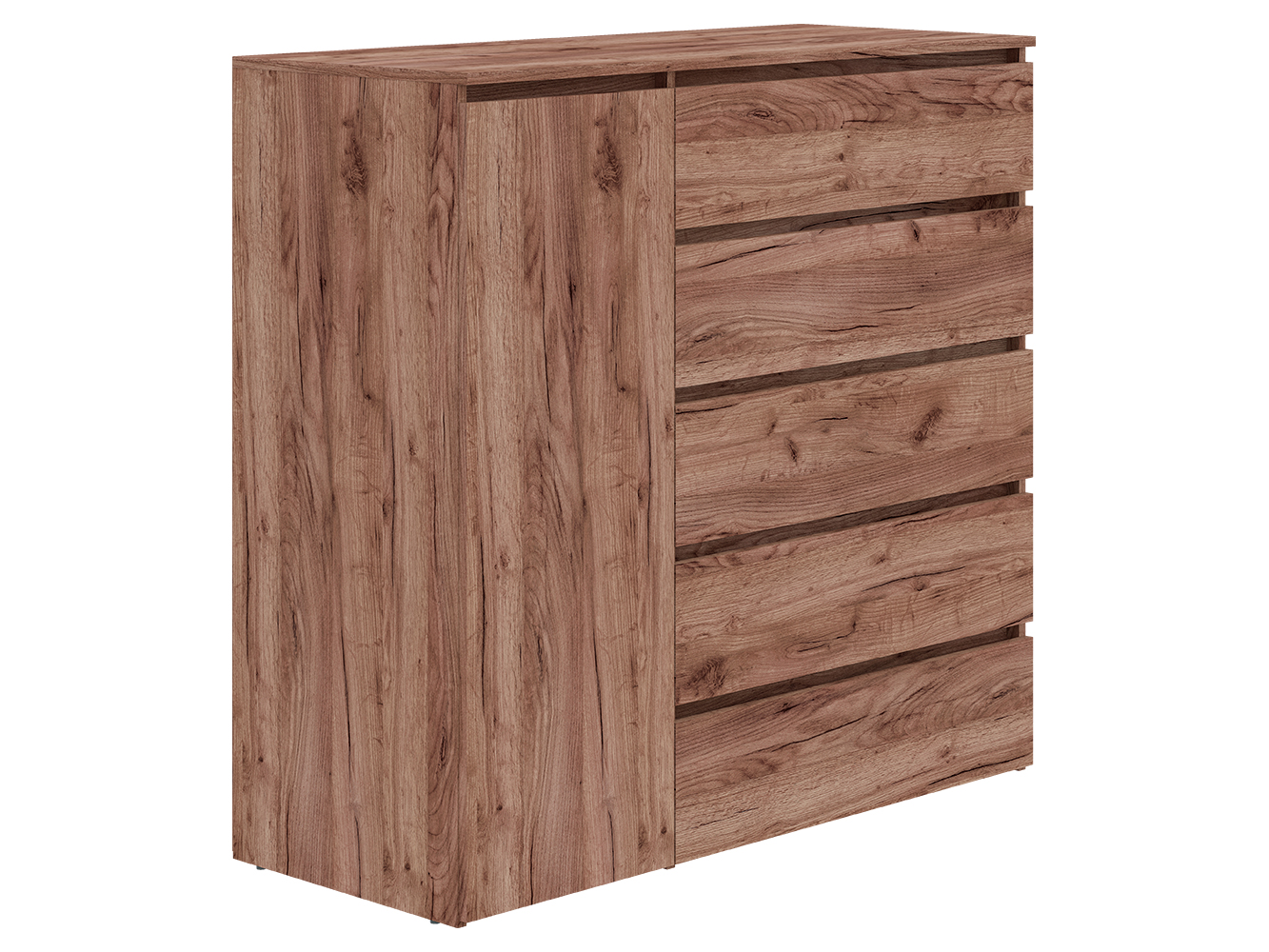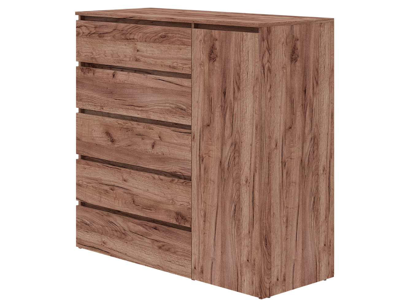 Конструкция включает пять выдвижных ящиков с шариковыми направляющими полного выдвижения. Плавный и бесшумный ход обеспечивает комфортное использование, а полный доступ к содержимому делает хранение более удобным. Дополнительно предусмотрен распашной шкафчик с вешалкой для одежды, что позволяет хранить вещи, требующие вертикального размещения.