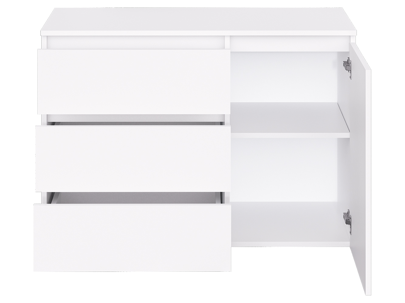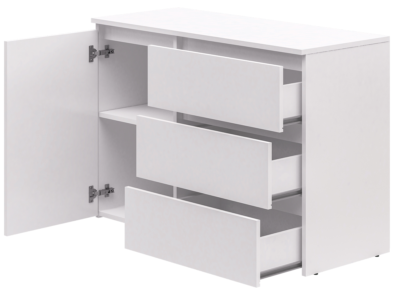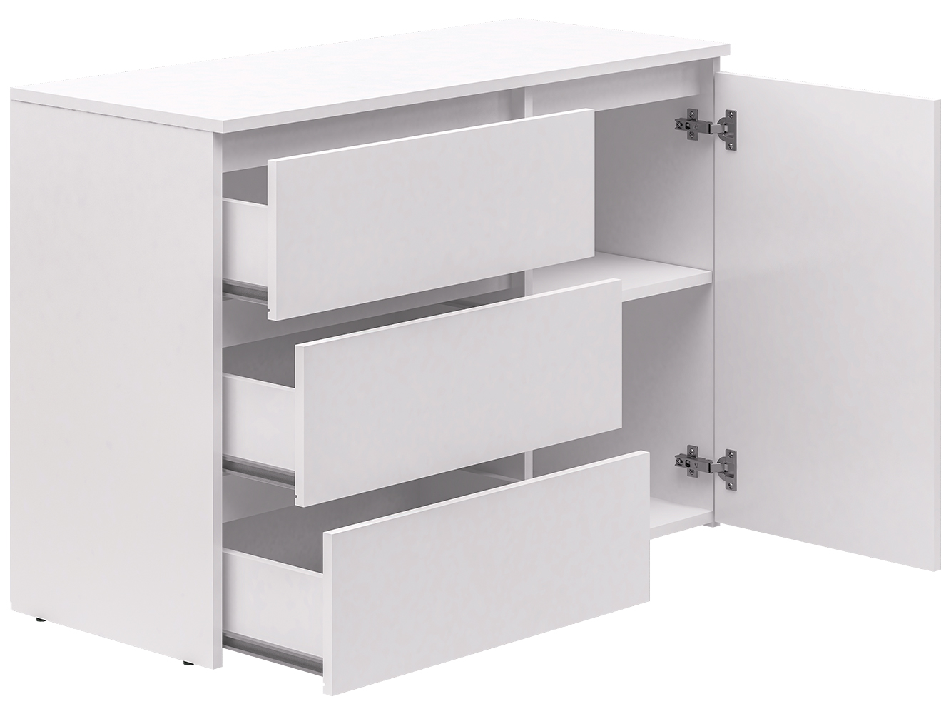 Конструкция включает три выдвижных ящика с шариковыми направляющими полного выдвижения. Плавный и бесшумный ход обеспечивает комфортное использование, а удобный доступ к содержимому делает хранение вещей простым и удобным. Дополнительно предусмотрен распашной шкафчик с двумя внутренними нишами для более объемных предметов.