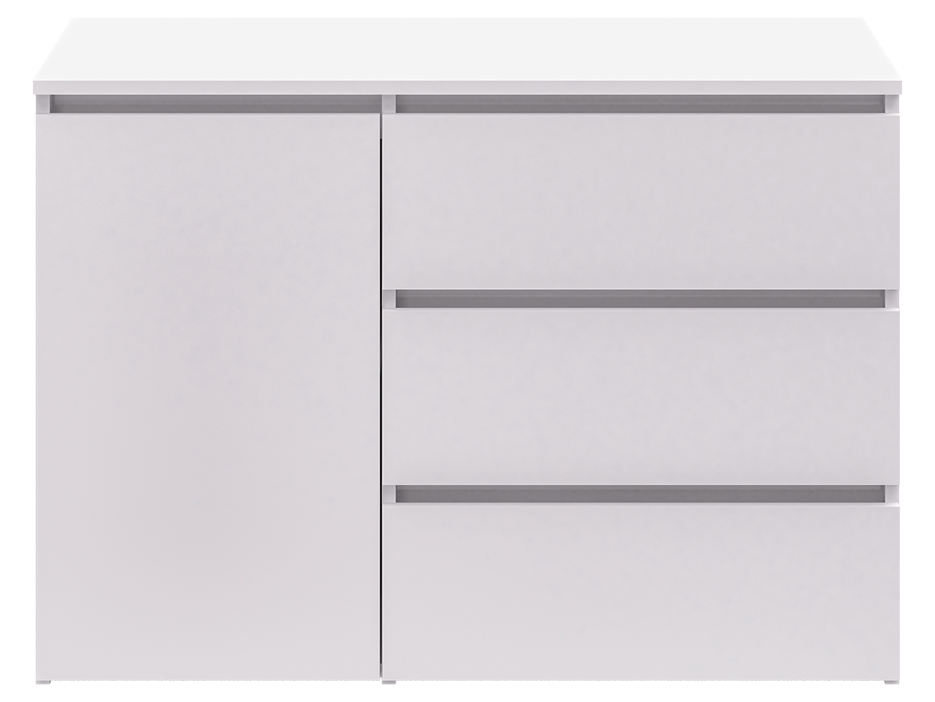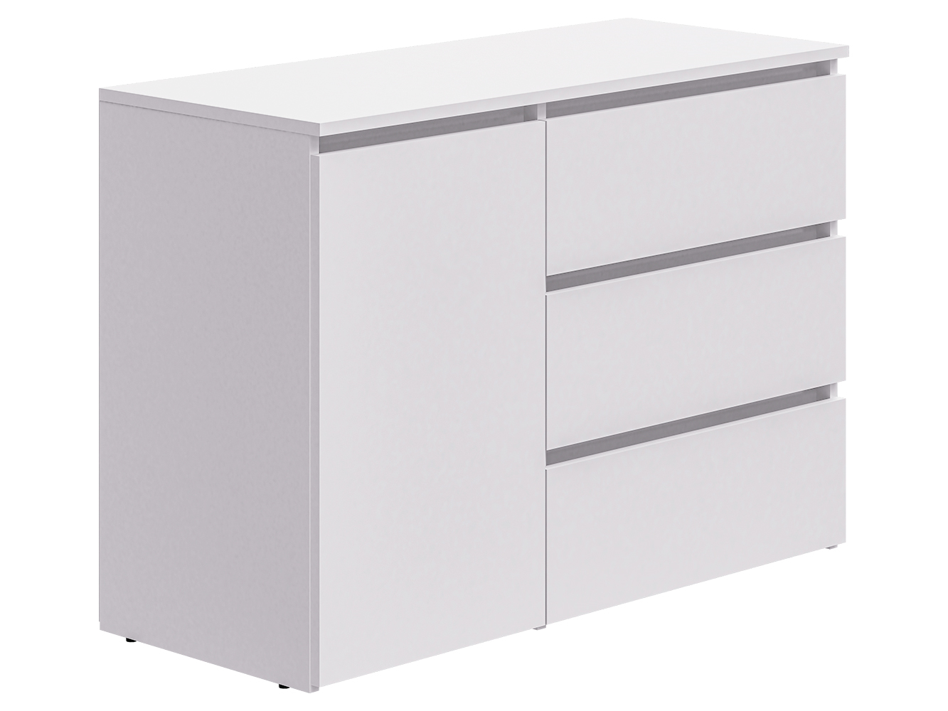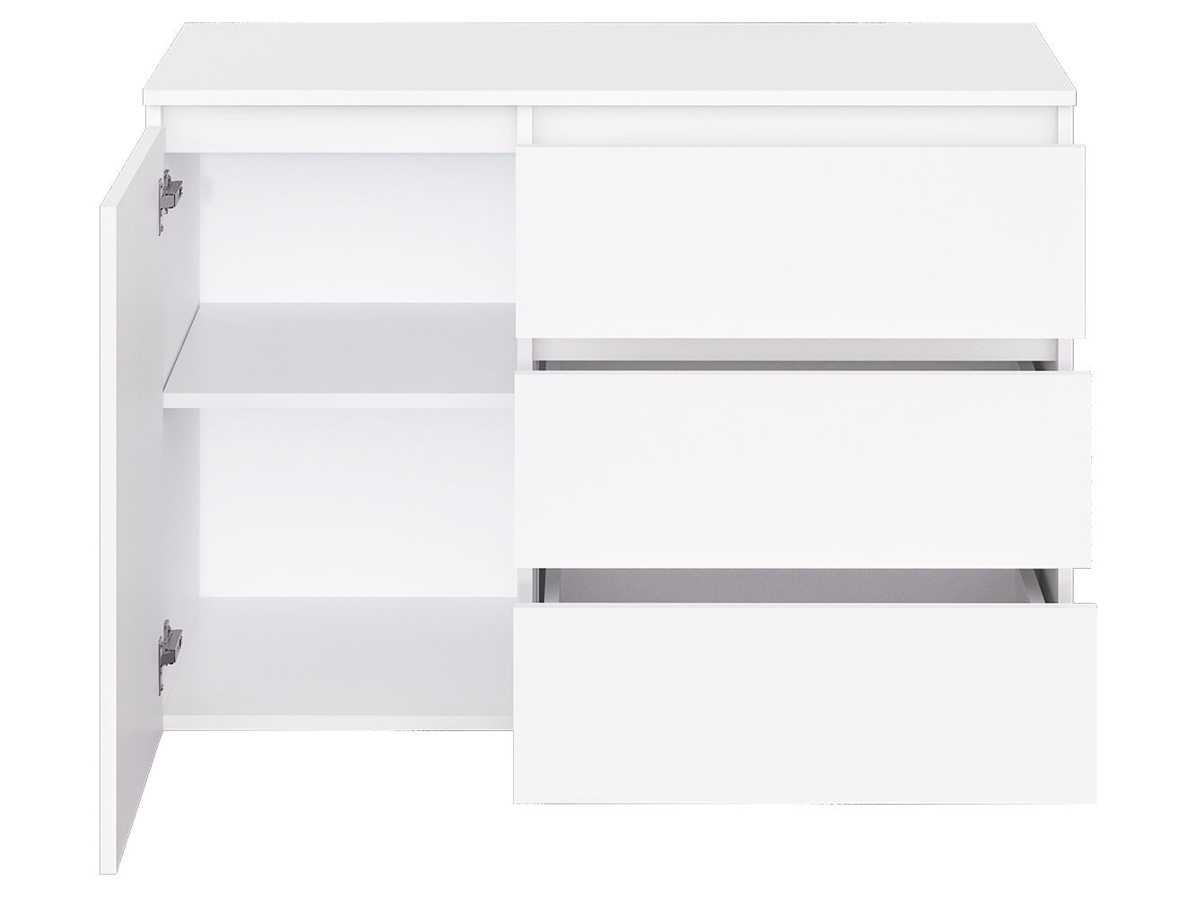 Конструкция включает три выдвижных ящика с шариковыми направляющими полного выдвижения. Плавный и бесшумный ход обеспечивает комфортное использование, а удобный доступ к содержимому делает хранение вещей простым и удобным. Дополнительно предусмотрен распашной шкафчик с двумя внутренними нишами для более объемных предметов.