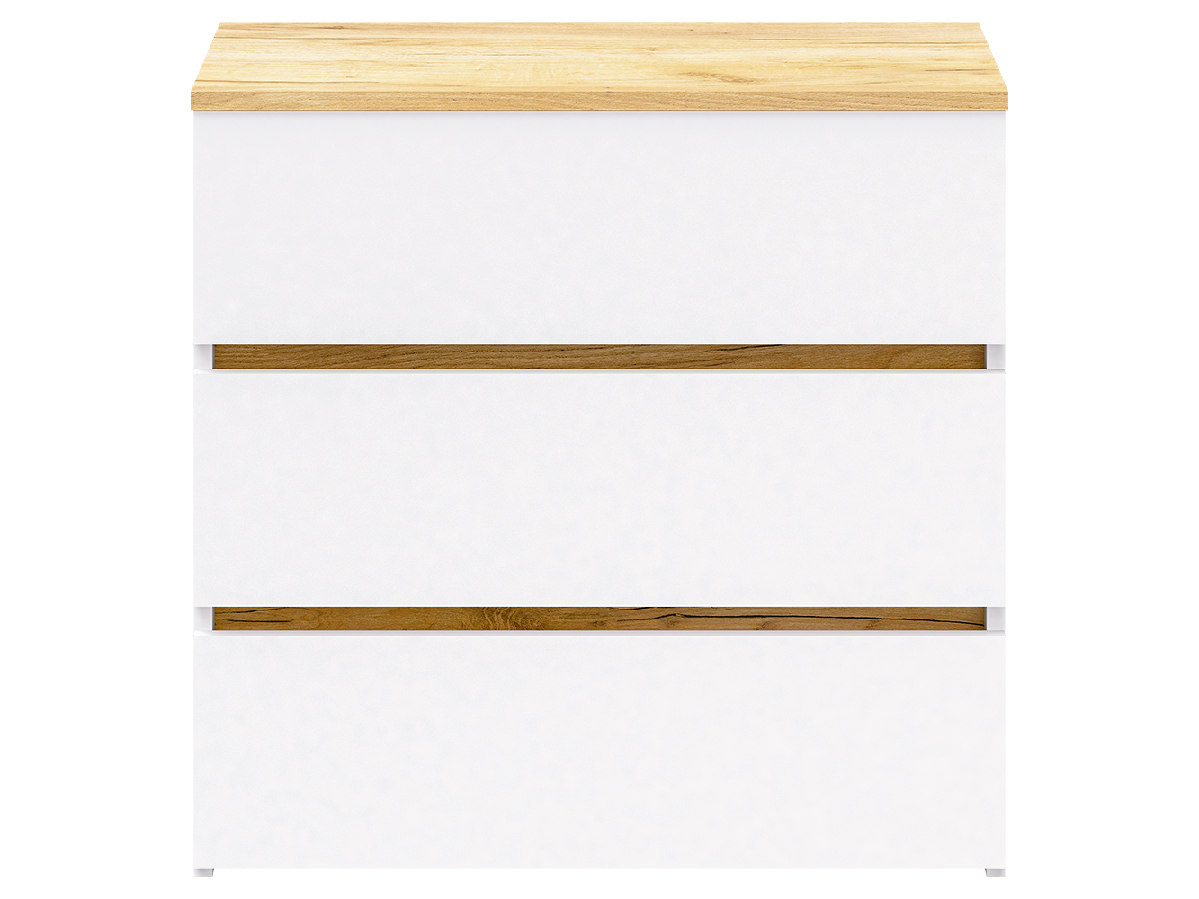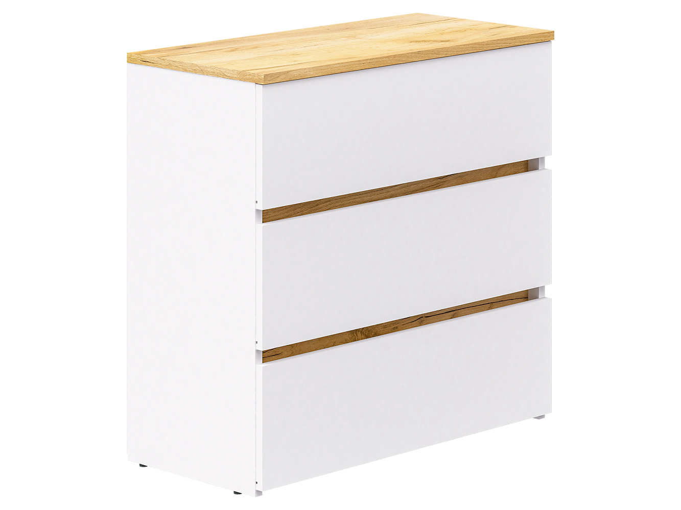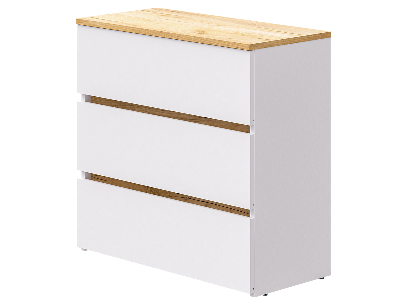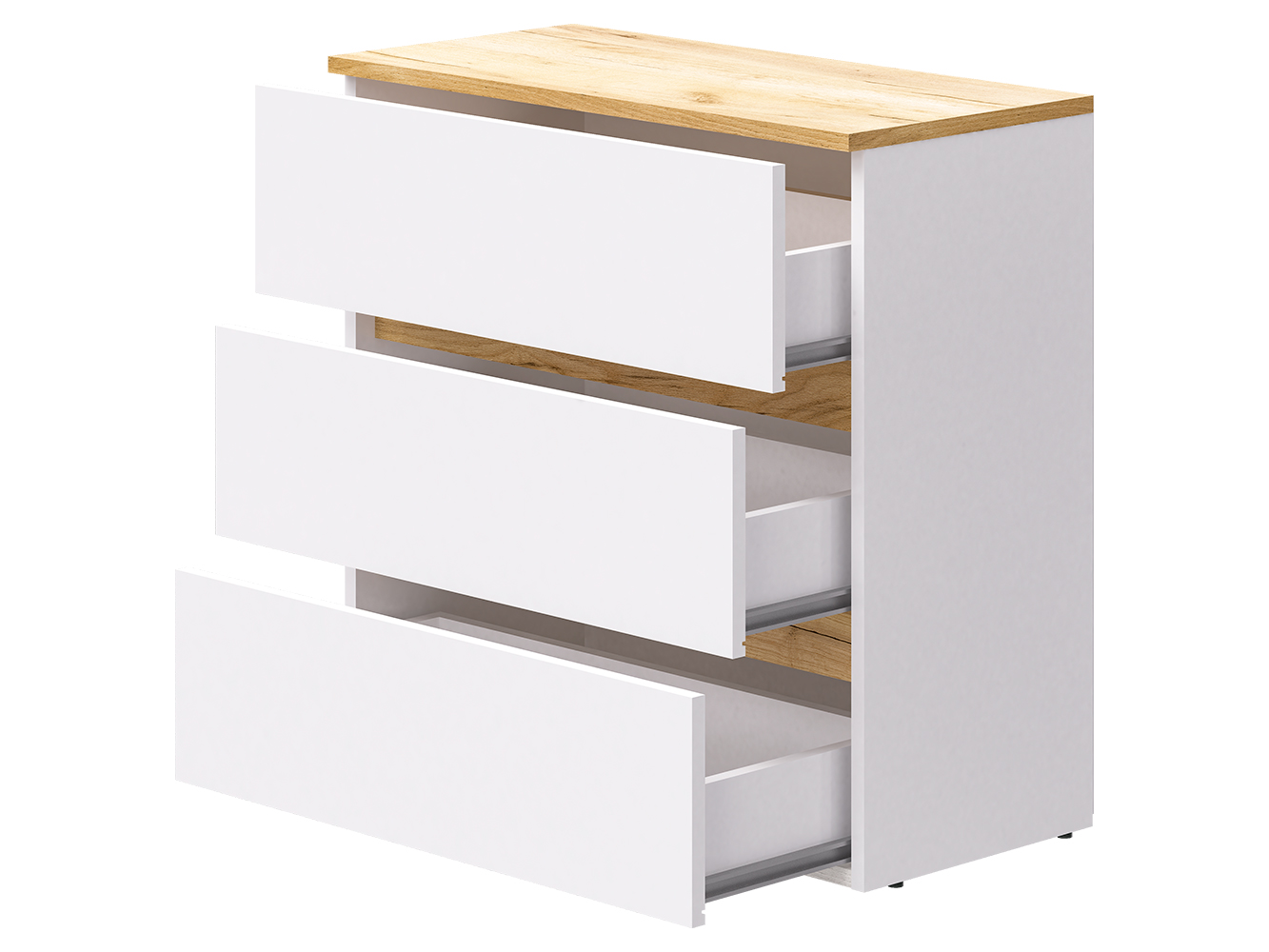 Конструкция оснащена тремя выдвижными ящиками на роликовых направляющих. Плавное и надежное выдвижение обеспечивает комфортное использование и удобный доступ к содержимому. Комод подходит для хранения одежды, белья, аксессуаров и других бытовых вещей.