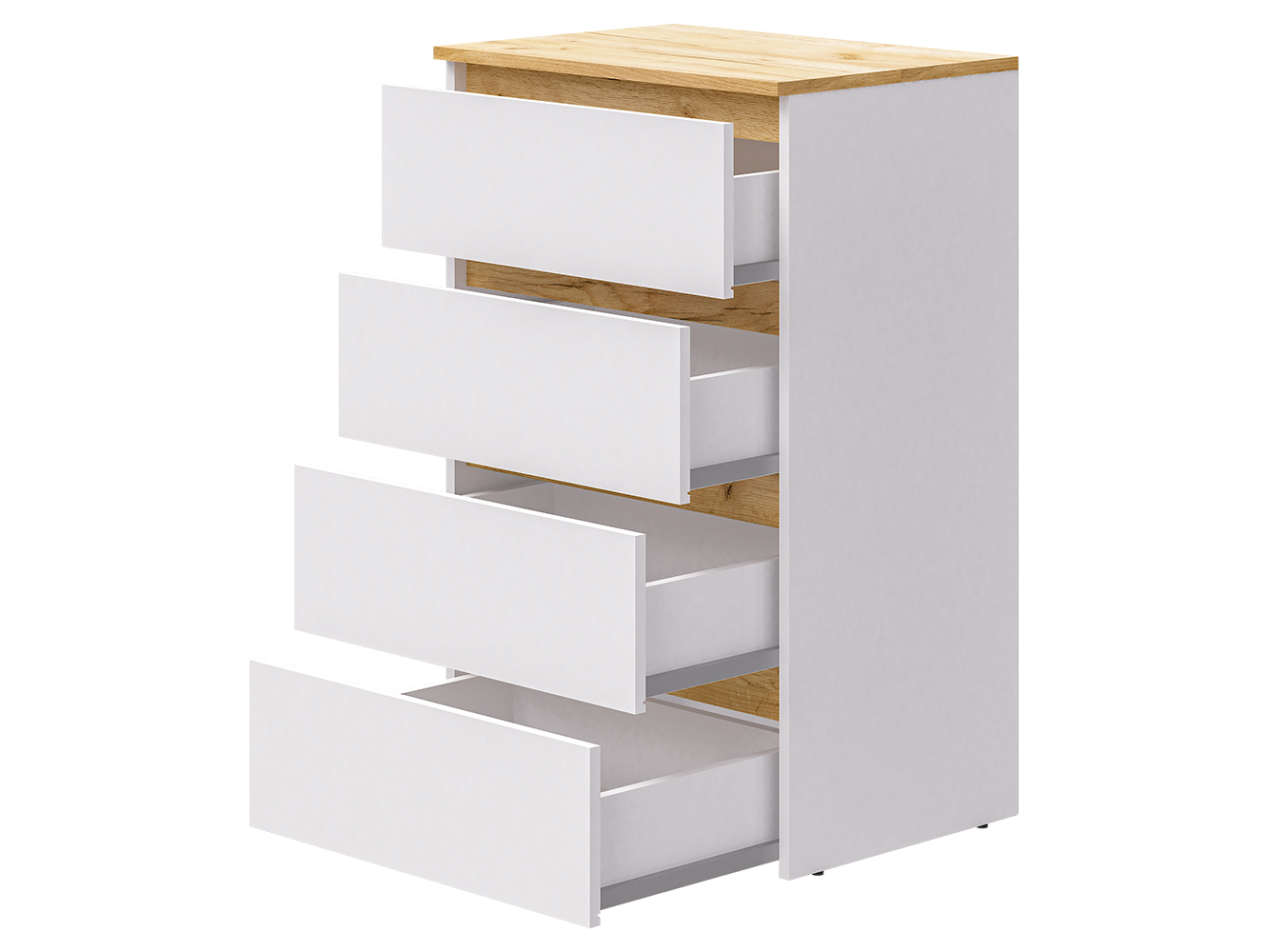 Вместительный комод обеспечит универсальную систему хранения. Оснащение: четыре ящика полного выдвижения бесшумного плавного хода. Скрытые опоры компенсируют возможные неровности пола, надёжный материл гарантирует долговечность. Лаконичная модель функциональна и может быть адаптирована под различные потребности и условия.