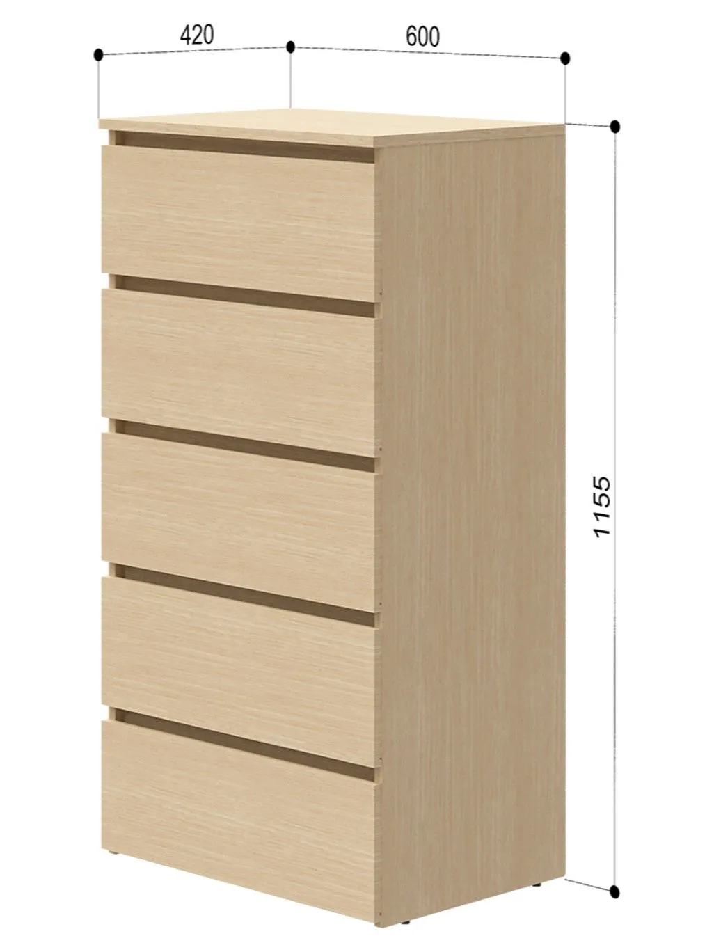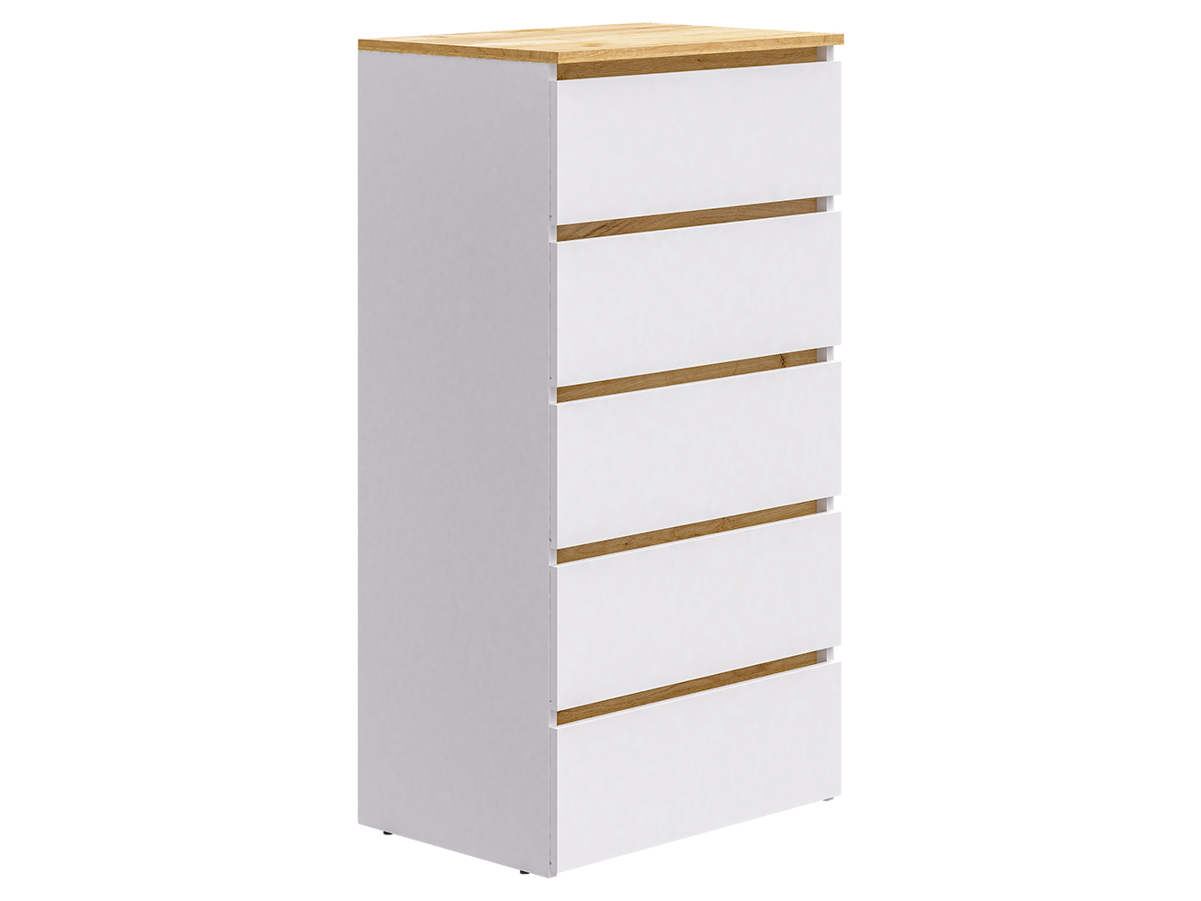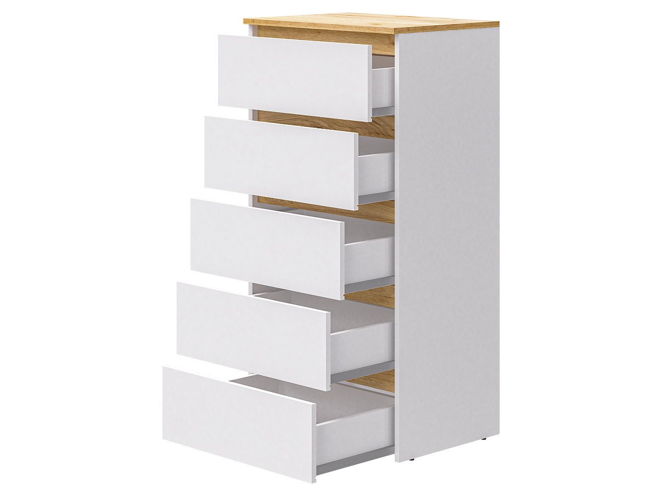 Комод оснащён пятью выдвижными ящиками с шариковыми направляющими полного выдвижения. Плавный и бесшумный ход обеспечивает комфортное ежедневное использование, а удобный доступ ко всему содержимому делает хранение максимально практичным и организованным.
