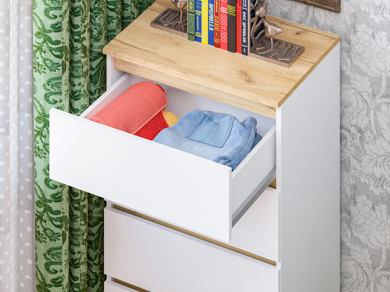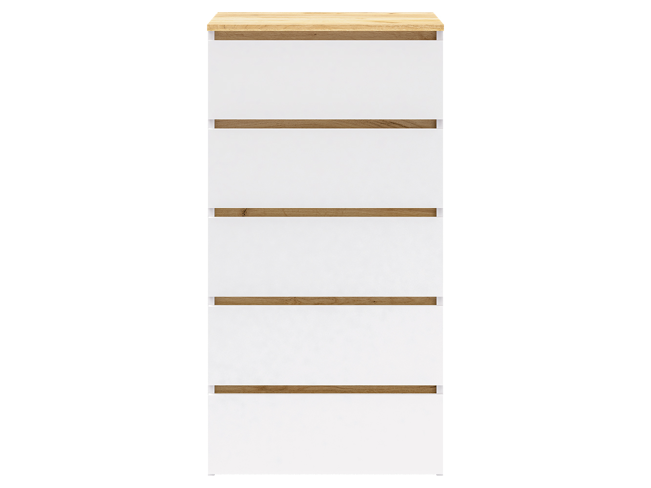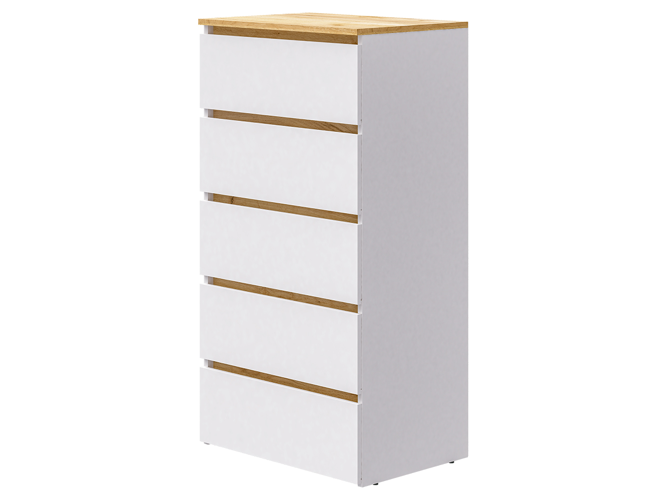 Комод оснащён пятью выдвижными ящиками с шариковыми направляющими полного выдвижения. Плавный и бесшумный ход обеспечивает комфортное ежедневное использование, а удобный доступ ко всему содержимому делает хранение максимально практичным и организованным.