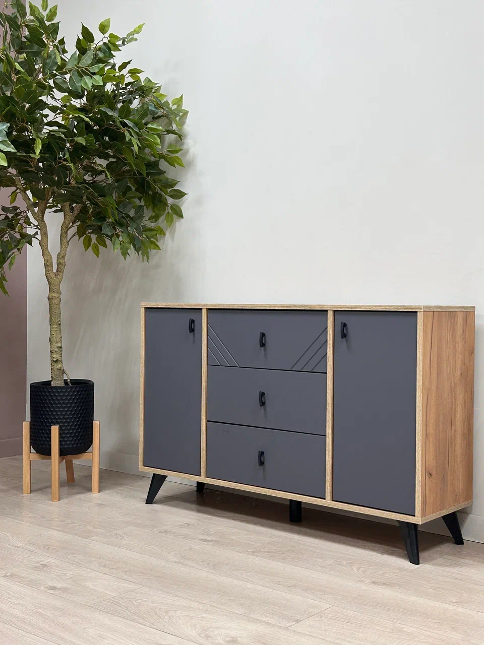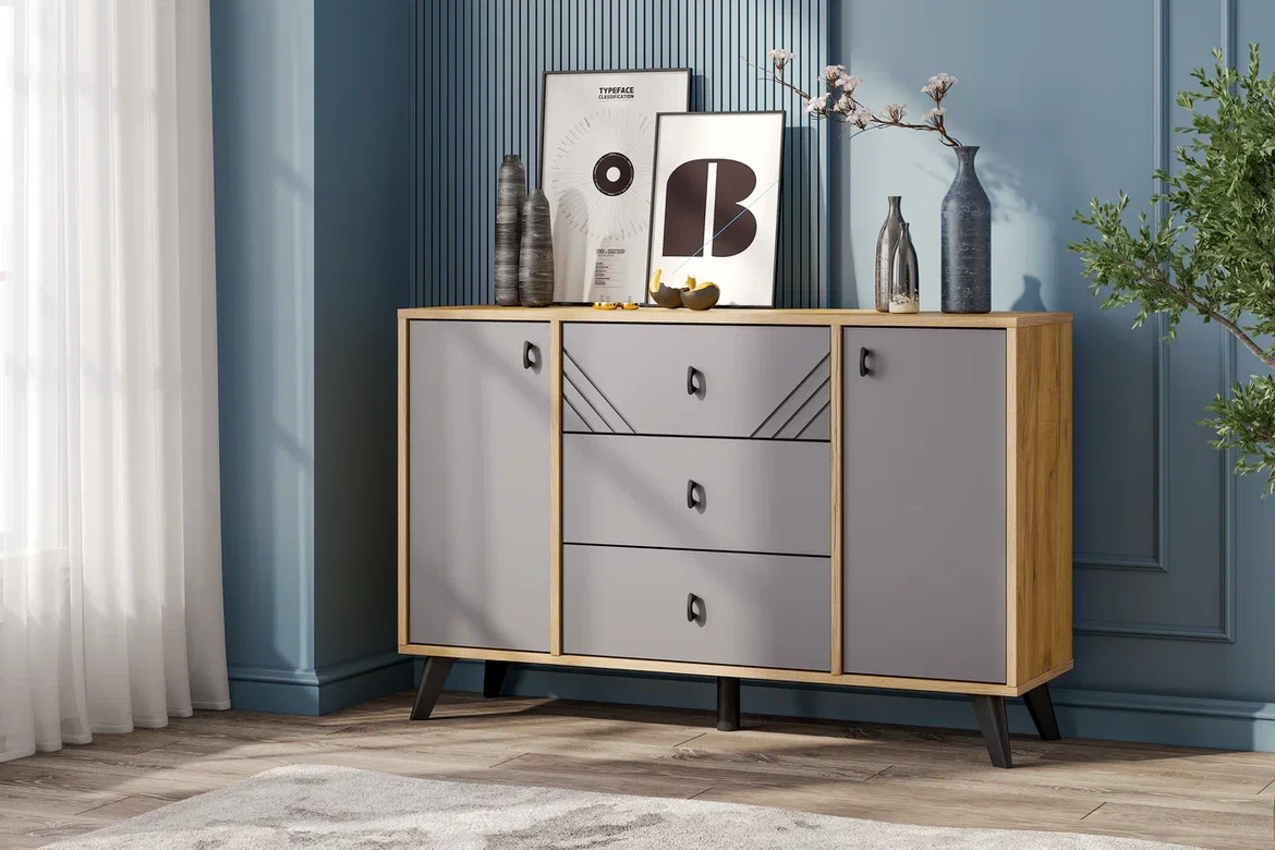Тёмный графитовый фасад из МДФ с выразительной фрезеровкой подчёркивает матовую текстуру и делает модель визуально глубокой и стильной. Чёрные ручки гармонично дополняют общий образ. Комод оснащён тремя ящиками в центральной части на шариковых направляющих полного выдвижения, а также двумя боковыми секциями со створками и полками. Благодаря высоким ножкам, под мебелью легко убирать, в том числе с помощью робота-пылесоса. Эта модель сочетает в себе продуманную эргономику и яркий характер-отличный выбор как для спальни, так и для гостиной.