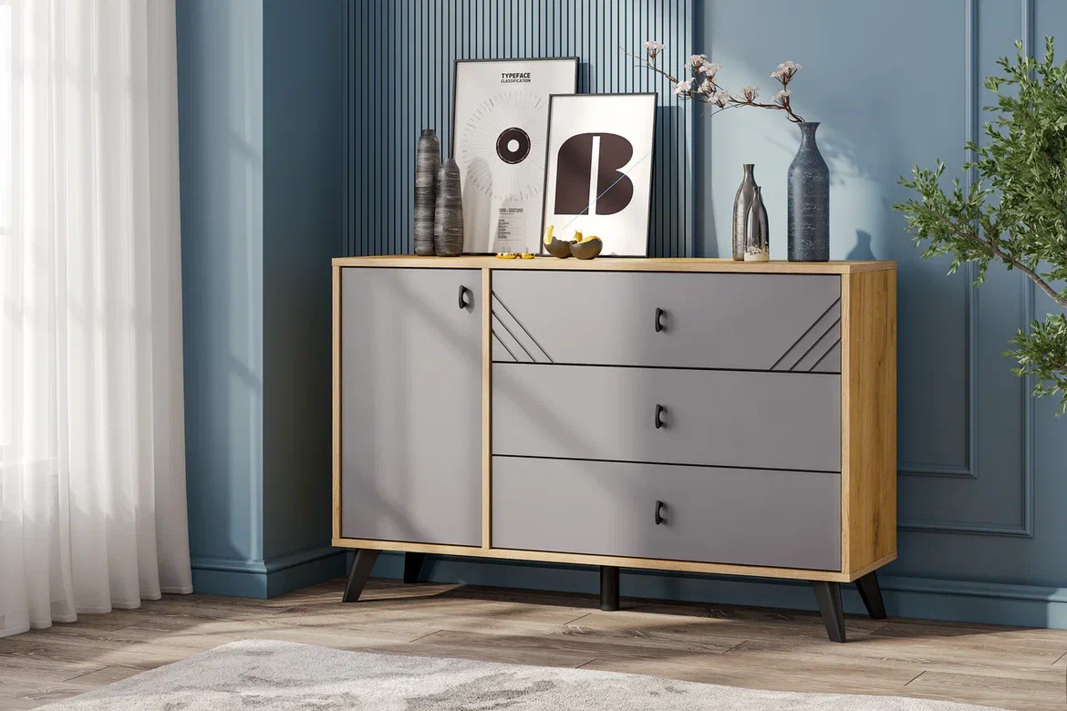 Современный и практичный комод из коллекции «Байкал» станет эффектным акцентом интерьера. Модель включает три вместительных ящика на шариковых направляющих полного выдвижения и одну секцию со створкой, за которой находятся полки для удобного хранения. Конструкция с универсальной сборкой позволяет разместить створку как слева, так и справа от ящиков. Графитовый фасад из МДФ подчёркнут выразительной фрезеровкой,черные ручки дополняют лаконичный дизайн.Комод установлен на пять изящных высоких ножек — уборка под ним не вызывает трудностей, даже при использовании робота-пылесоса. Отличный выбор для современных интерьеров