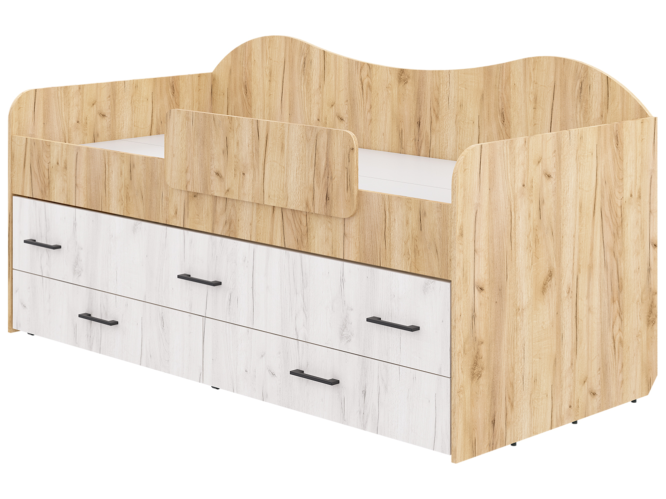 Изготовлена кровать из качественного ламинированного ДСП толщиной 16 мм класса Е1 - самого популярного материала для производства корпусной мебели, обеспечивающего необходимую прочность и долговечность деталей. Все края обработаны ударопрочной кромкой ПВХ, которая значительно увеличивает срок эксплуатации изделия. Для сборки используется фурнитура ведущих мировых производителей.