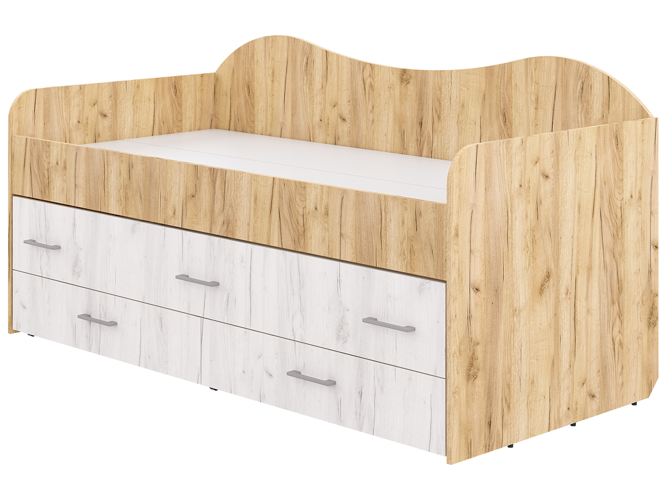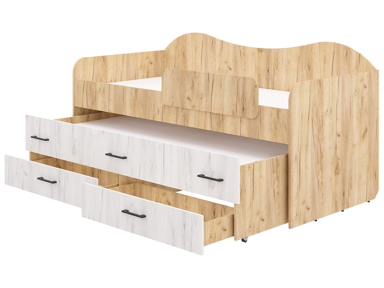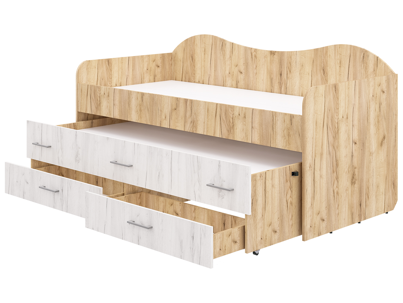Детская кровать НИМФА – удачно приобретение для небольшой детской. Это компактная двухуровневая кровать со спальными местами 200х90 см. (верхнее место) и 190х90 см. (нижнее место). Особенность данной модели состоит в том, что нижний ярус кровати выполнен независимым блоком. Нижняя часть кровати полностью выдвигается, а при необходимости задвигается под верхний ярус. Таким образом освобождается место для игр и занятий детей. К тому же, благодаря роликам на нижнем ящике, поверхность пола не повреждается. Также кровать оборудована двумя выдвижными ящиками, куда можно поместить постельное бельё и игрушки.