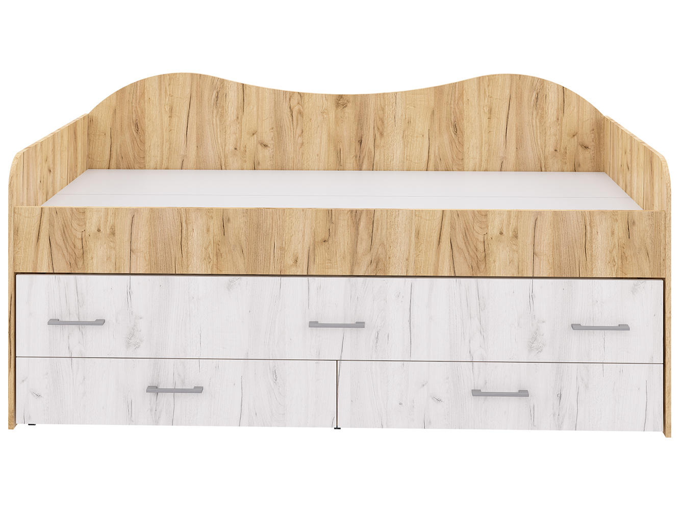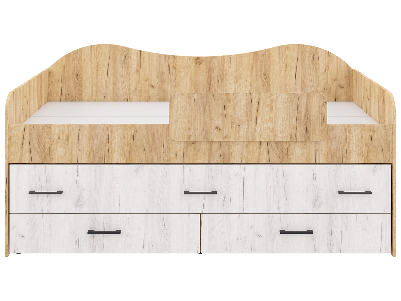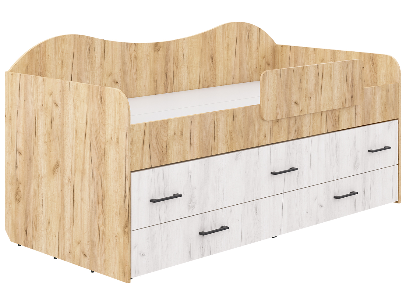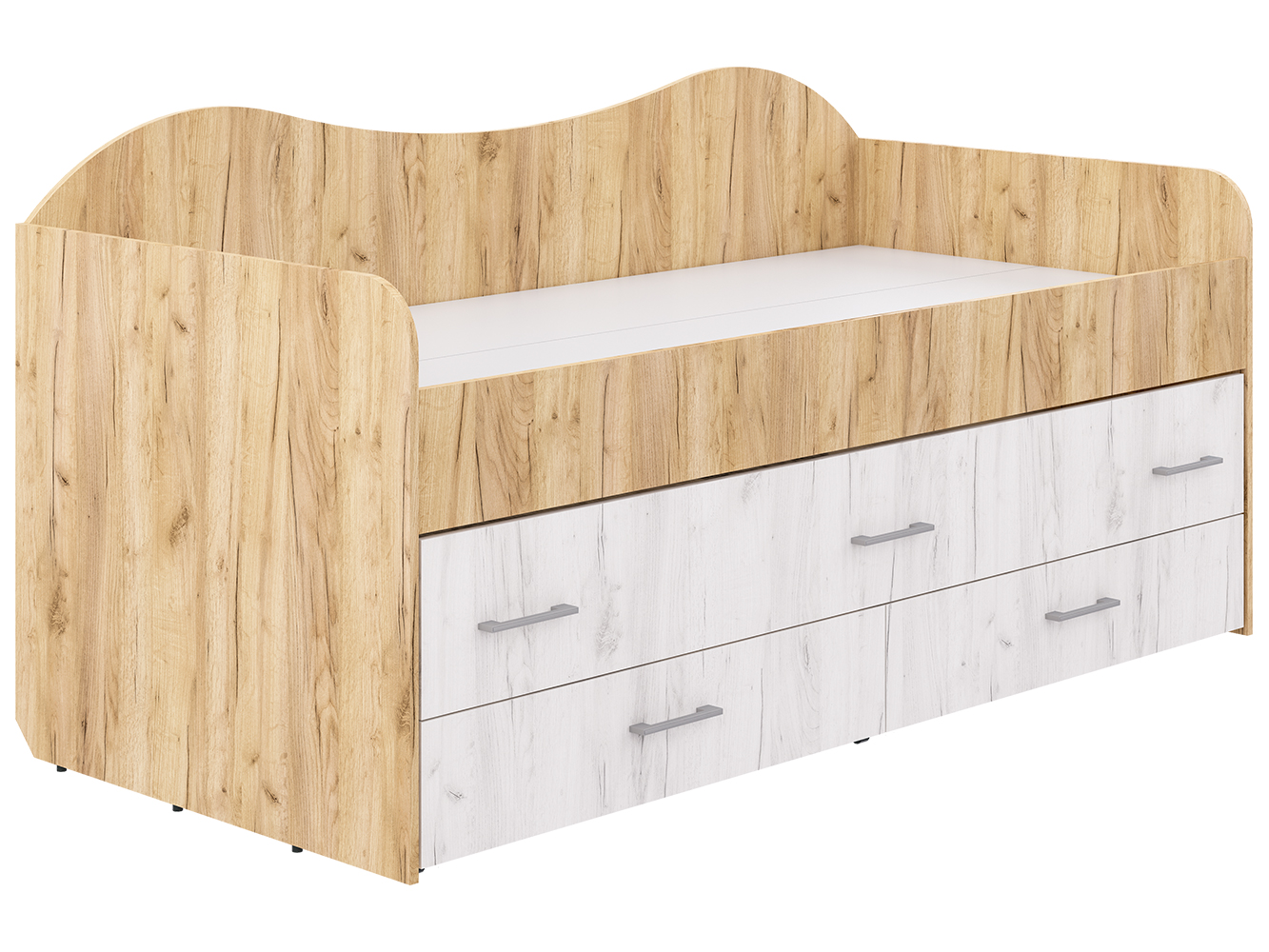 Детская кровать НИМФА – удачно приобретение для небольшой детской. Это компактная двухуровневая кровать со спальными местами 200х90 см. (верхнее место) и 190х90 см. (нижнее место). Особенность данной модели состоит в том, что нижний ярус кровати выполнен независимым блоком. Нижняя часть кровати полностью выдвигается, а при необходимости задвигается под верхний ярус. Таким образом освобождается место для игр и занятий детей. К тому же, благодаря роликам на нижнем ящике, поверхность пола не повреждается. Также кровать оборудована двумя выдвижными ящиками, куда можно поместить постельное бельё и игрушки.