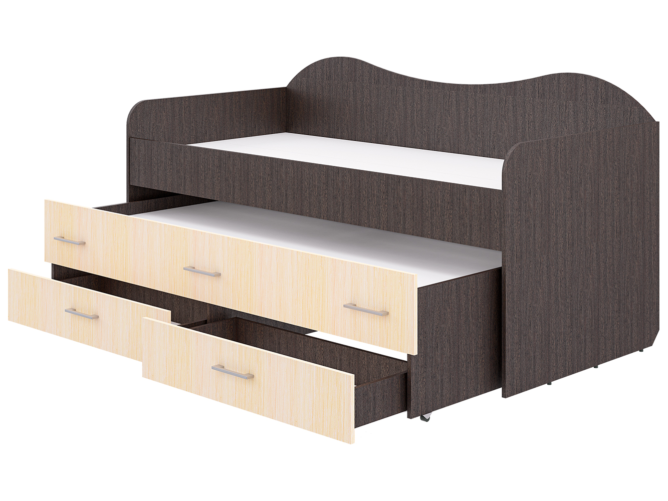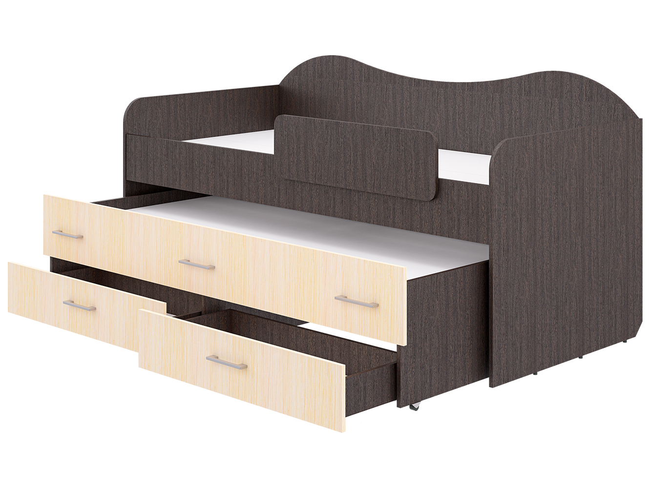 Детская кровать НИМФА – удачно приобретение для небольшой детской. Это компактная двухуровневая кровать со спальными местами 200х90 см. (верхнее место) и 190х90 см. (нижнее место). Особенность данной модели состоит в том, что нижний ярус кровати выполнен независимым блоком. Нижняя часть кровати полностью выдвигается, а при необходимости задвигается под верхний ярус. Таким образом освобождается место для игр и занятий детей. К тому же, благодаря роликам на нижнем ящике, поверхность пола не повреждается. Также кровать оборудована двумя выдвижными ящиками, куда можно поместить постельное бельё и игрушки.