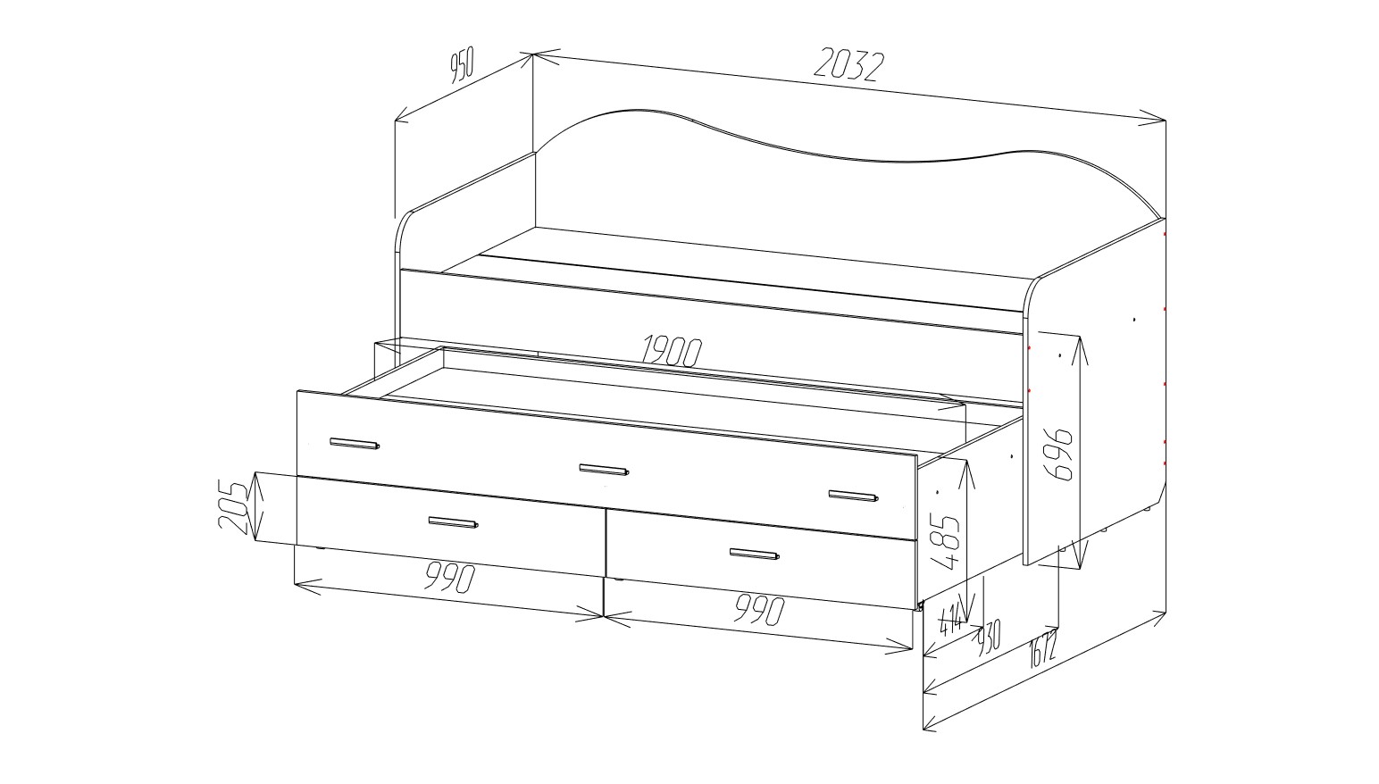 Спальные места 200х90 см. (верхнее), 190х90 см. (нижнее).