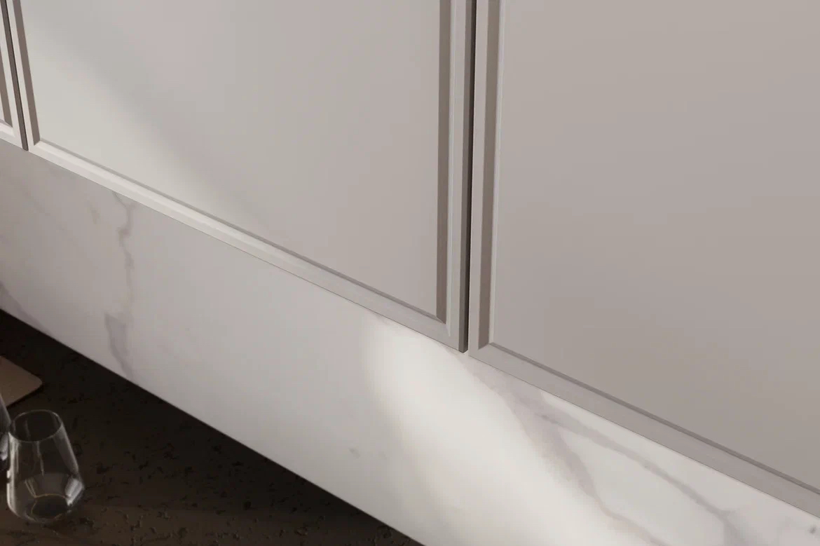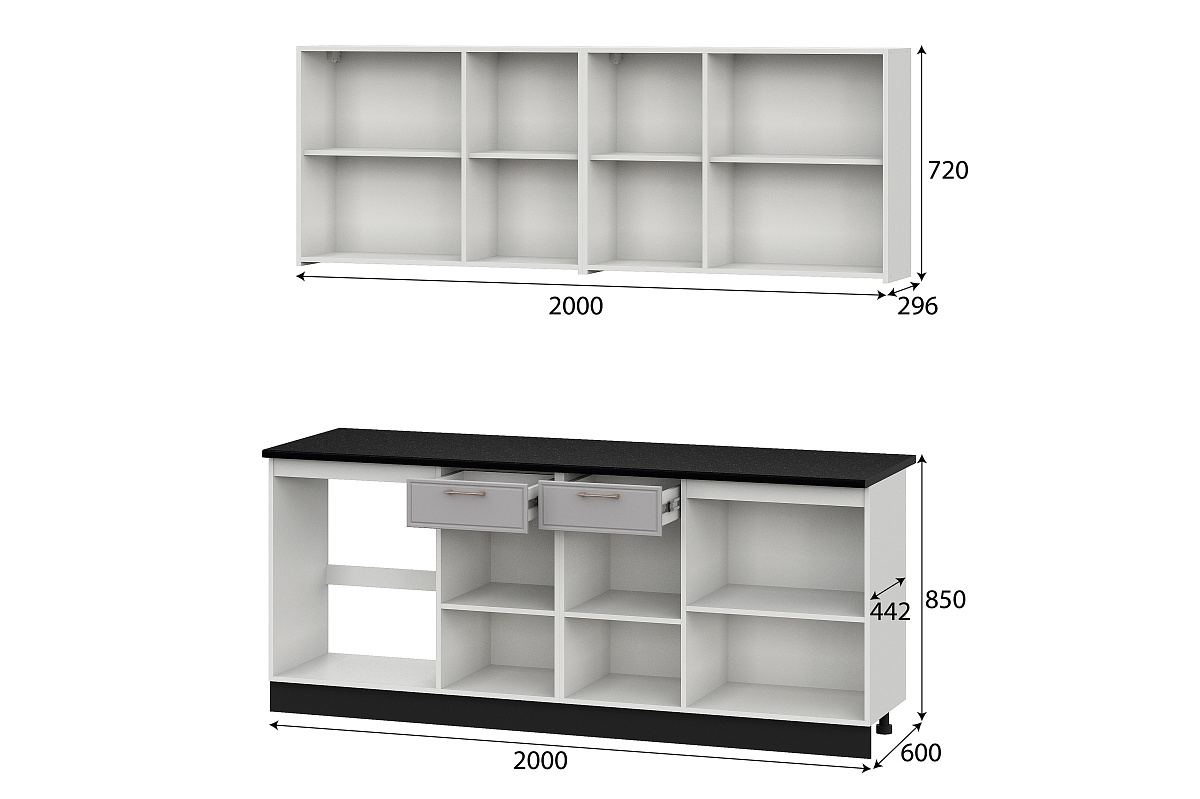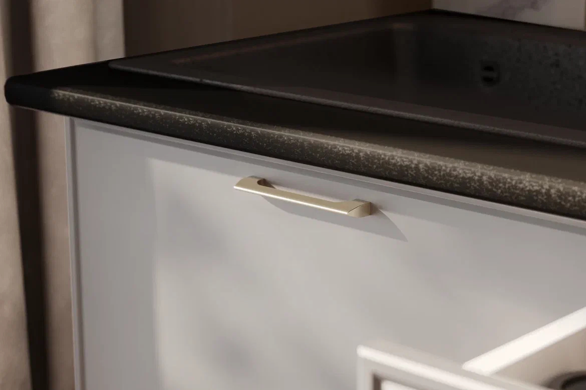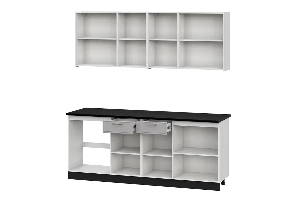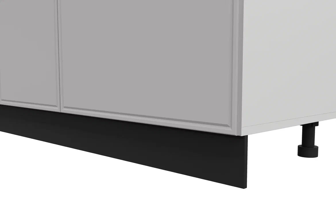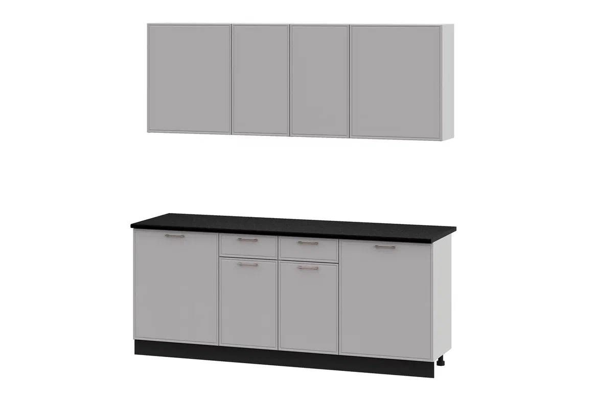 Кухня комплектуется чёрной столешницей длиной 200 см и толщиной 26 мм, которая подчёркивает современный характер модели и устойчива к повседневным нагрузкам. Завершает образ чёрный цоколь, создающий цельный и аккуратный внешний вид гарнитура.