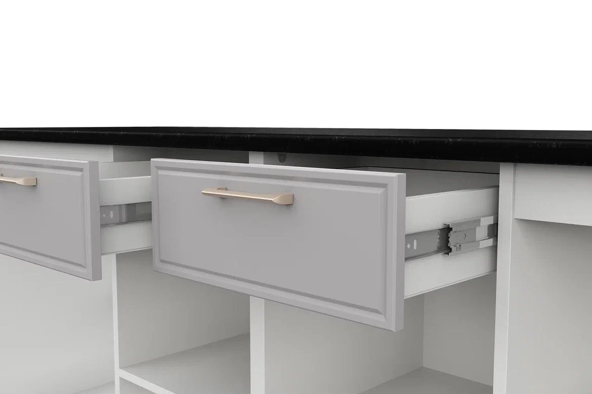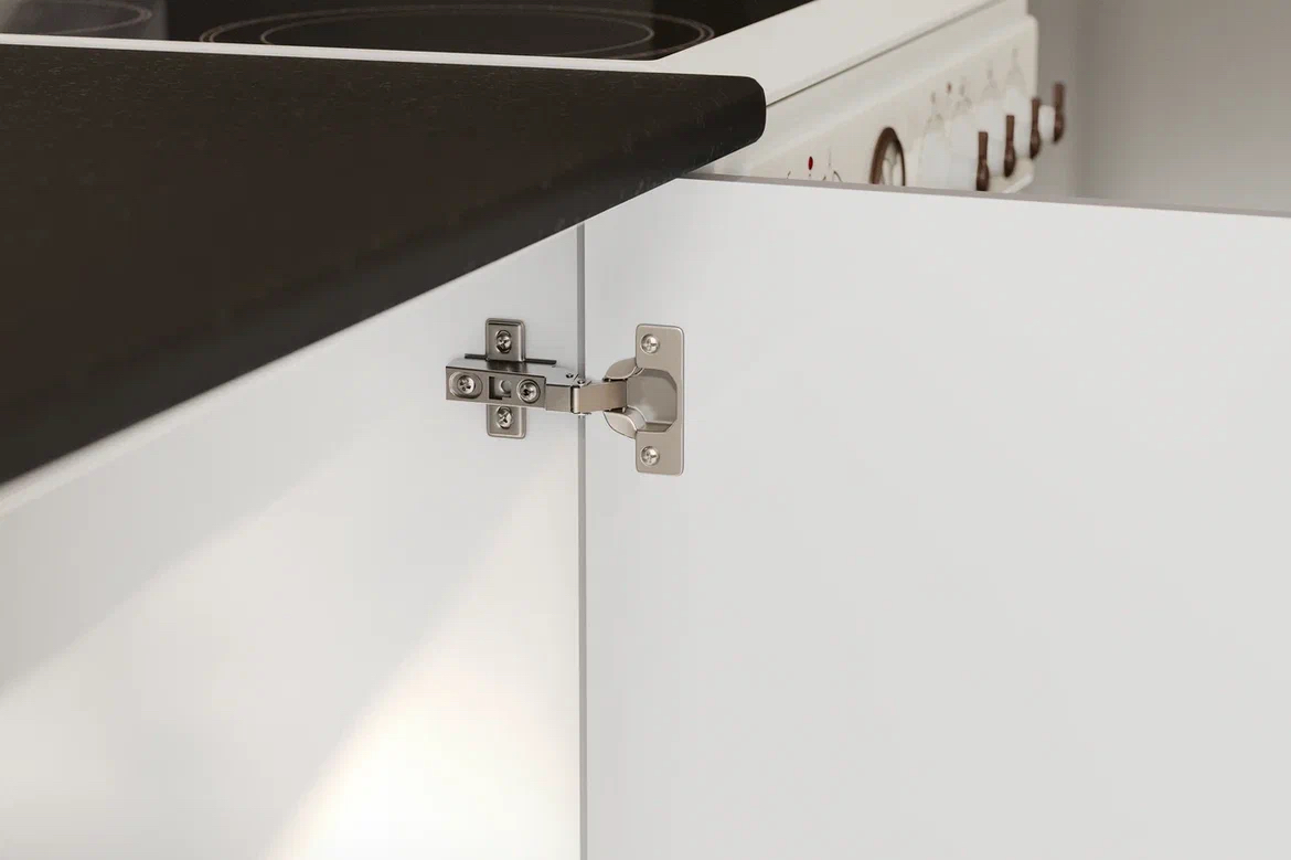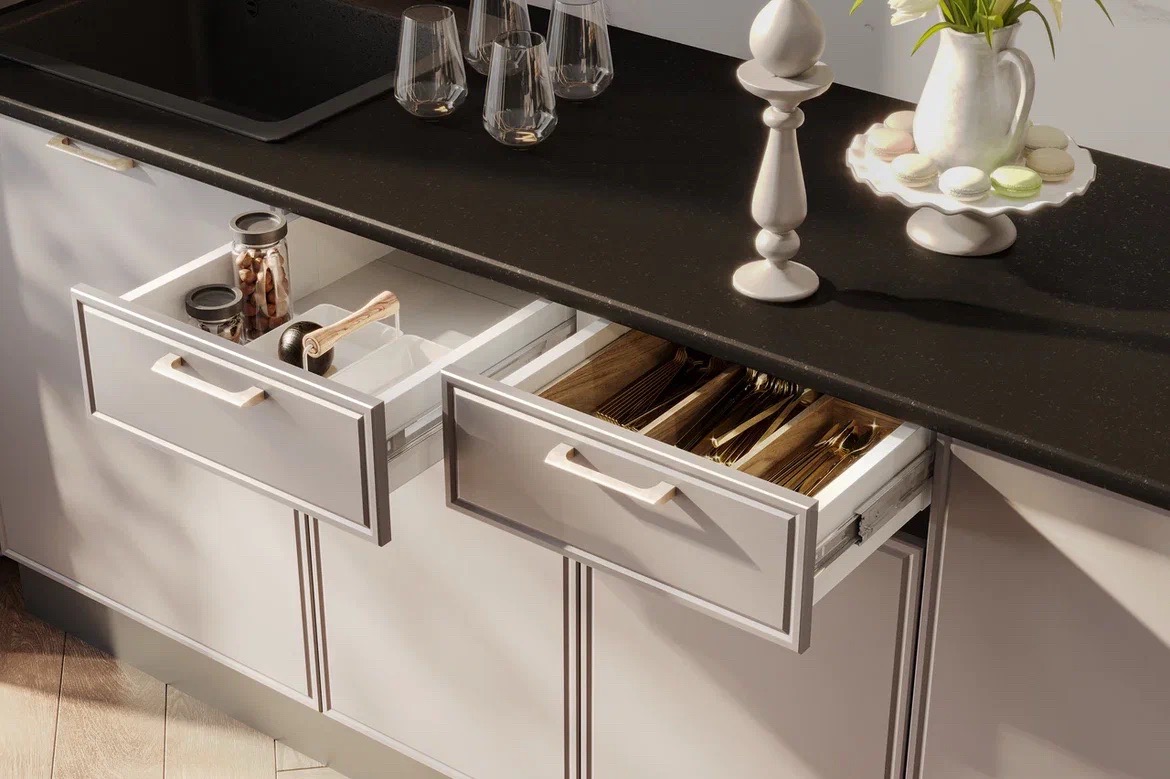 Функциональность продумана для удобного использования: кухня оснащена двумя выдвижными ящиками с шариковыми направляющими полного выдвижения, обеспечивающими плавный ход и быстрый доступ к содержимому. Верхние шкафы высотой 720 мм позволяют эффективно использовать пространство и разместить всё необходимое для хранения.