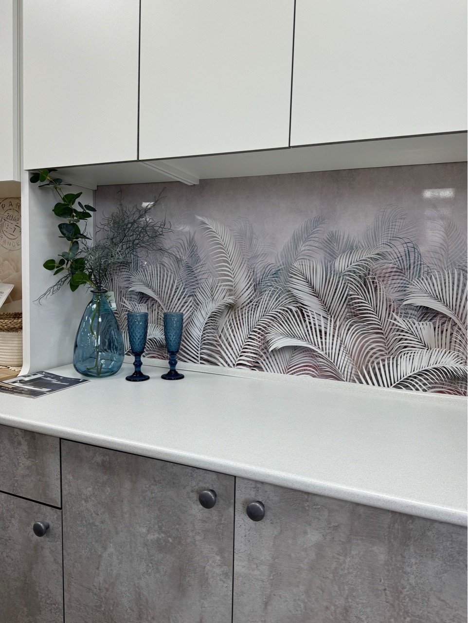 Гарнитур создаёт уютную и эргономичную рабочую зону, обеспечивая достаточно места для хранения и готовки даже в небольшой кухне.