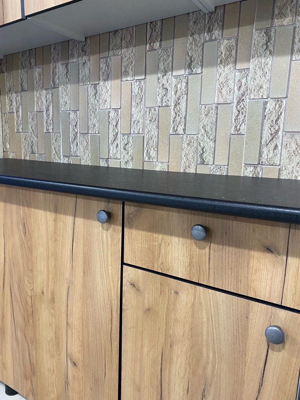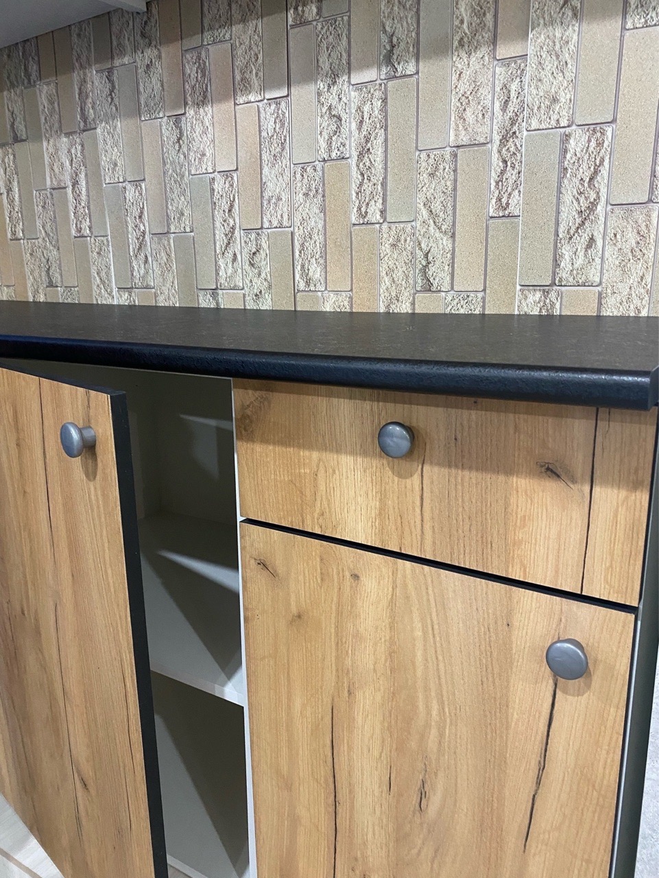 Гарнитур создаёт уютную и эргономичную рабочую зону, обеспечивая достаточно места для хранения и готовки даже в небольшой кухне.