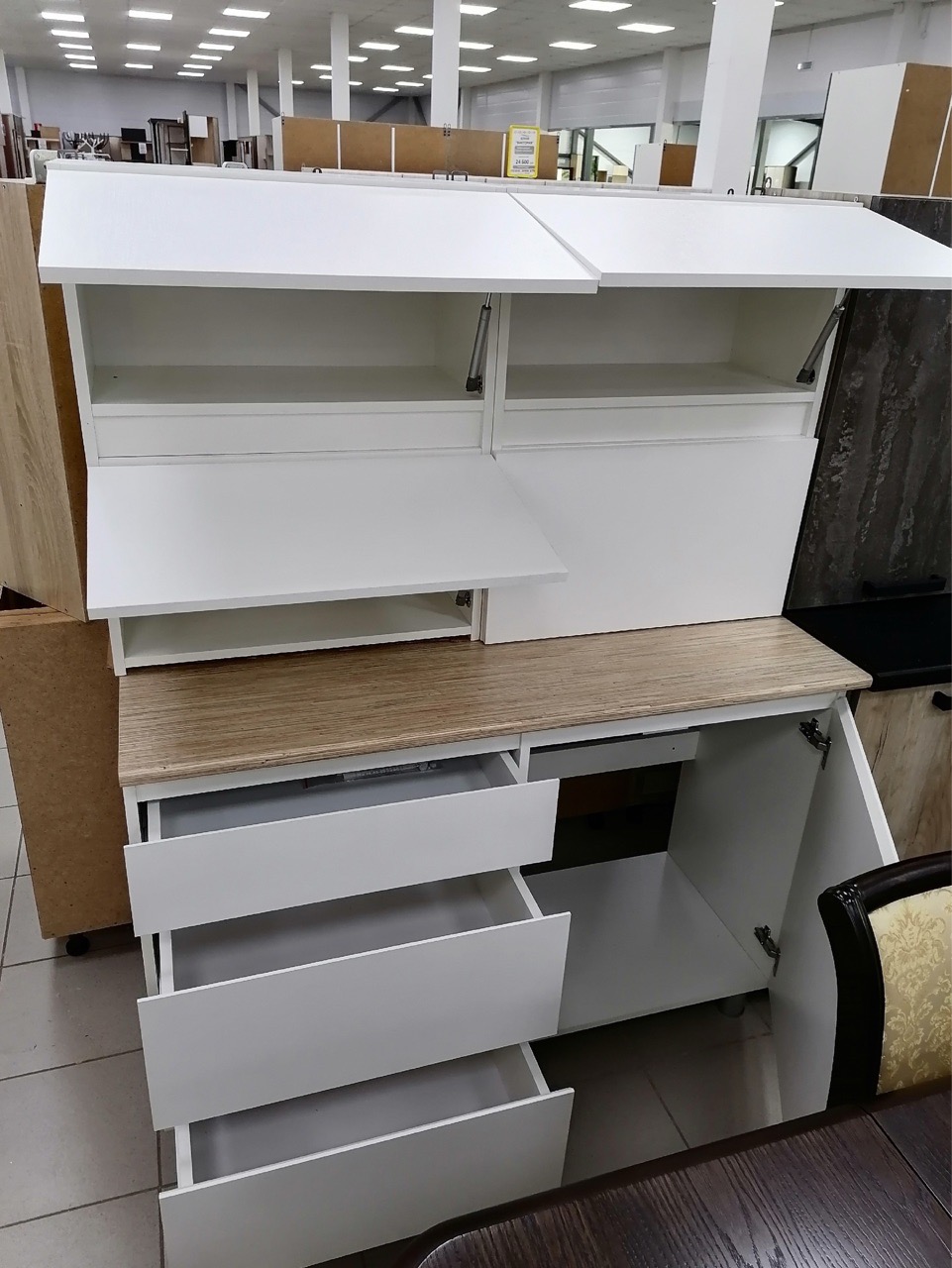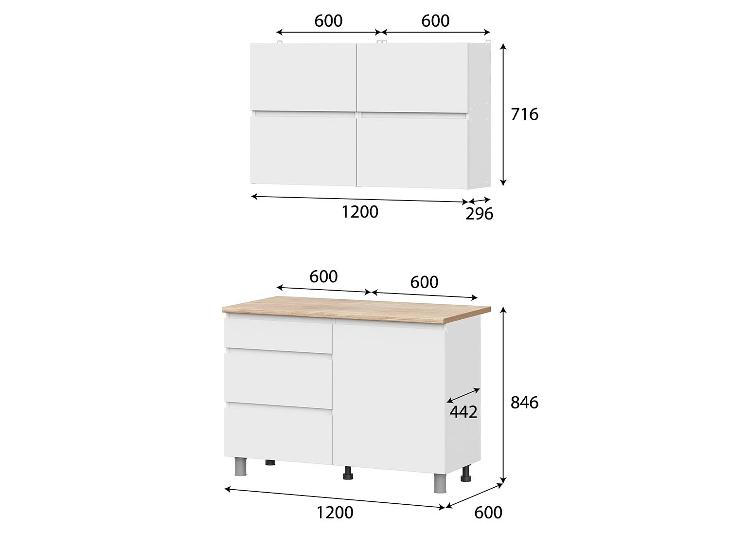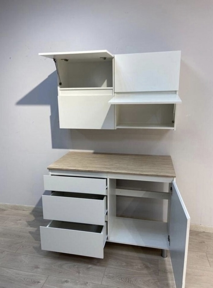 Кухня «Токио» 1,2 м — готовая кухня в белом цвете со столешницей. Кухонный гарнитур не имеет ручек, их роль выполняют скосы под 45 градусов на нижних модулях и выступы на фасадах навесных шкафов. Это позволяет сэкономить пространство, а также придаёт кухне более целостный вид.