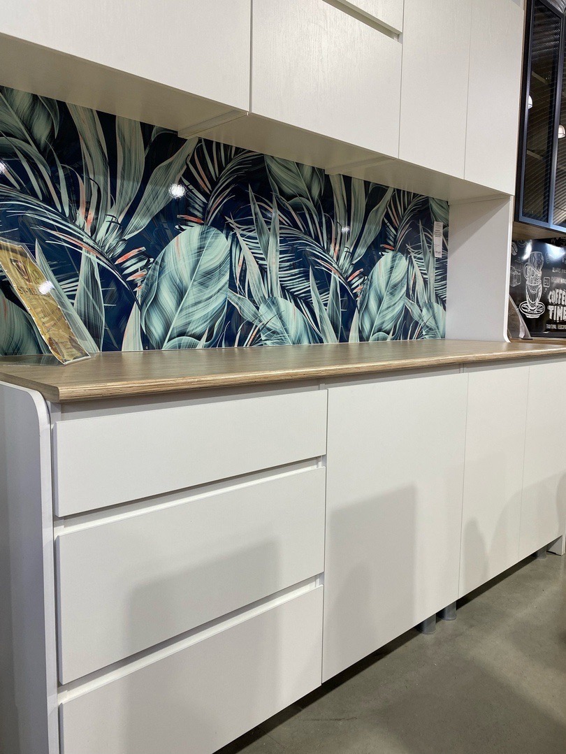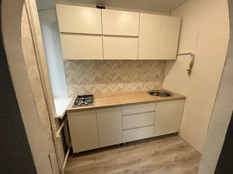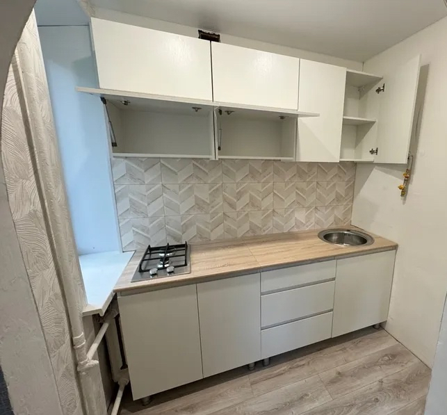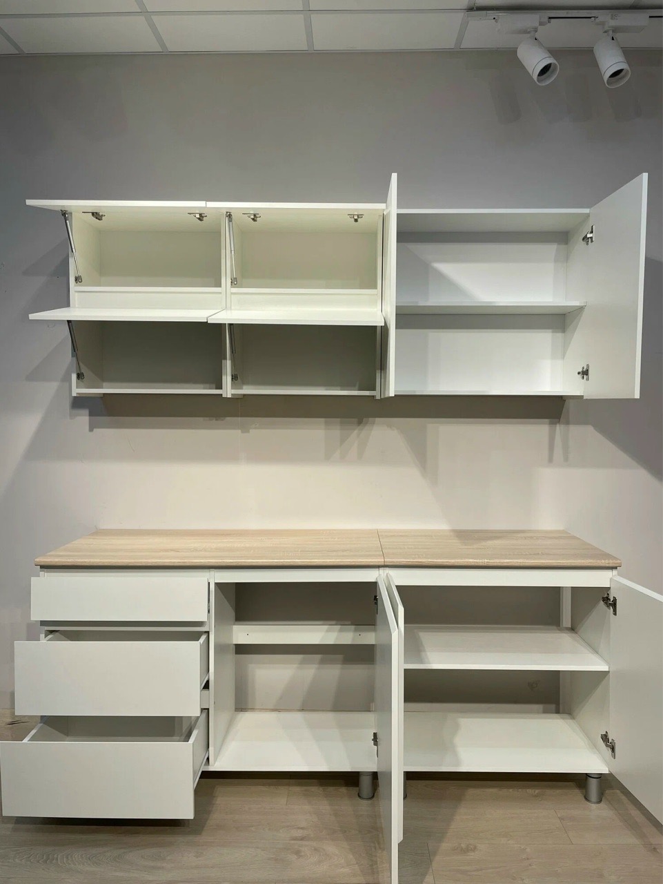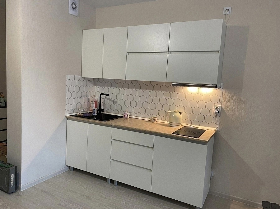 Кухня «Токио» 2 м — готовая кухня в белом цвете со столешницей. Кухонный гарнитур не имеет ручек, их роль выполняют скосы под 45 градусов на нижних модулях и выступы на фасадах навесных шкафов. Это позволяет сэкономить пространство, а также придаёт кухне более целостный вид.