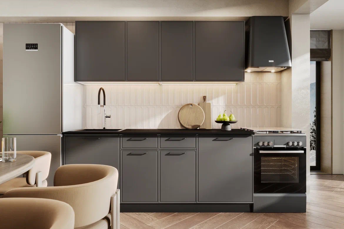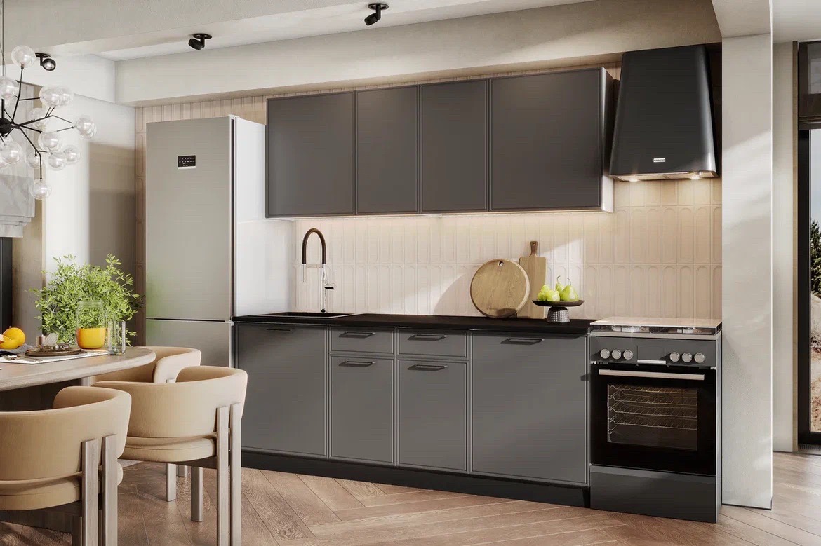 Кухонный гарнитур «Арнуво» Графит 200 см — практичное решение для современной кухни. Комплект включает верхние и нижние шкафы со столешницей, обеспечивая удобную организацию хранения кухонной посуды, продуктов и аксессуаров. Продуманная конструкция модулей, вместительные ящики и стандартные размеры делают гарнитур удобным для ежедневного использования и легким для размещения в большинстве кухонных помещений.