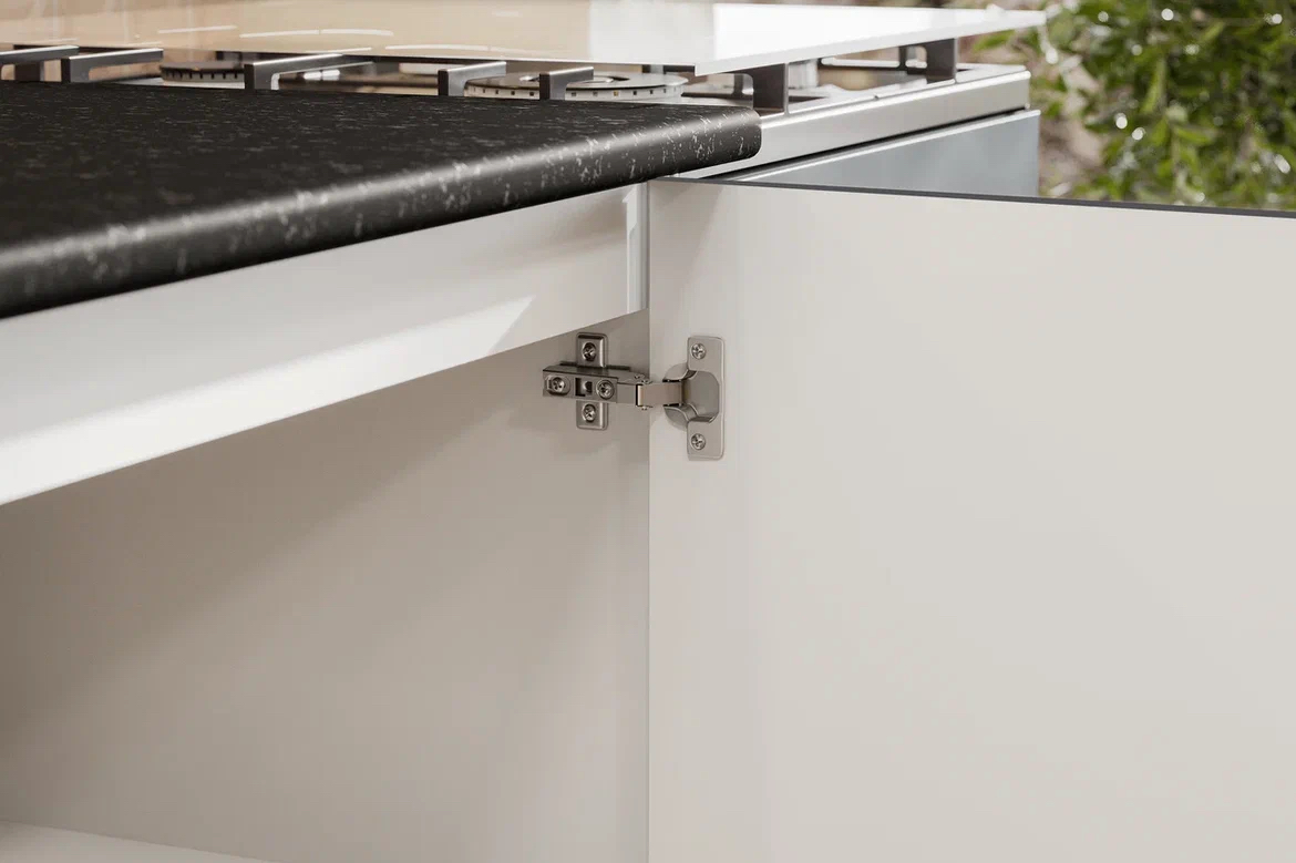 Верхние створки не имеют ручек.Вязки верхних шкафов подняты выше края фасадов,что создает возможность сформировать зацеп для открывания. Можно установить мойку как в левом модуле так и в правом. Мойка должна быть шириной до 60 см.
