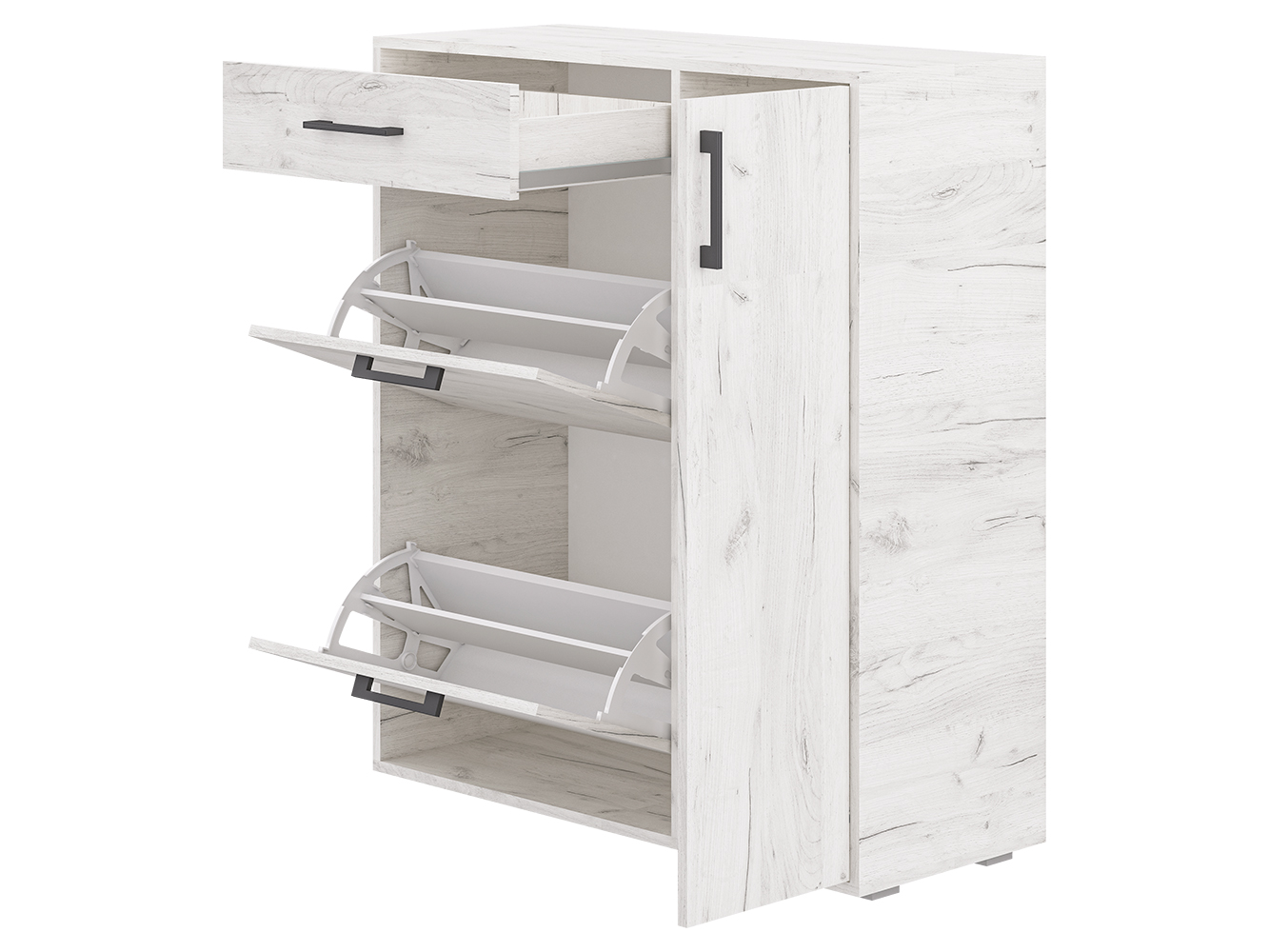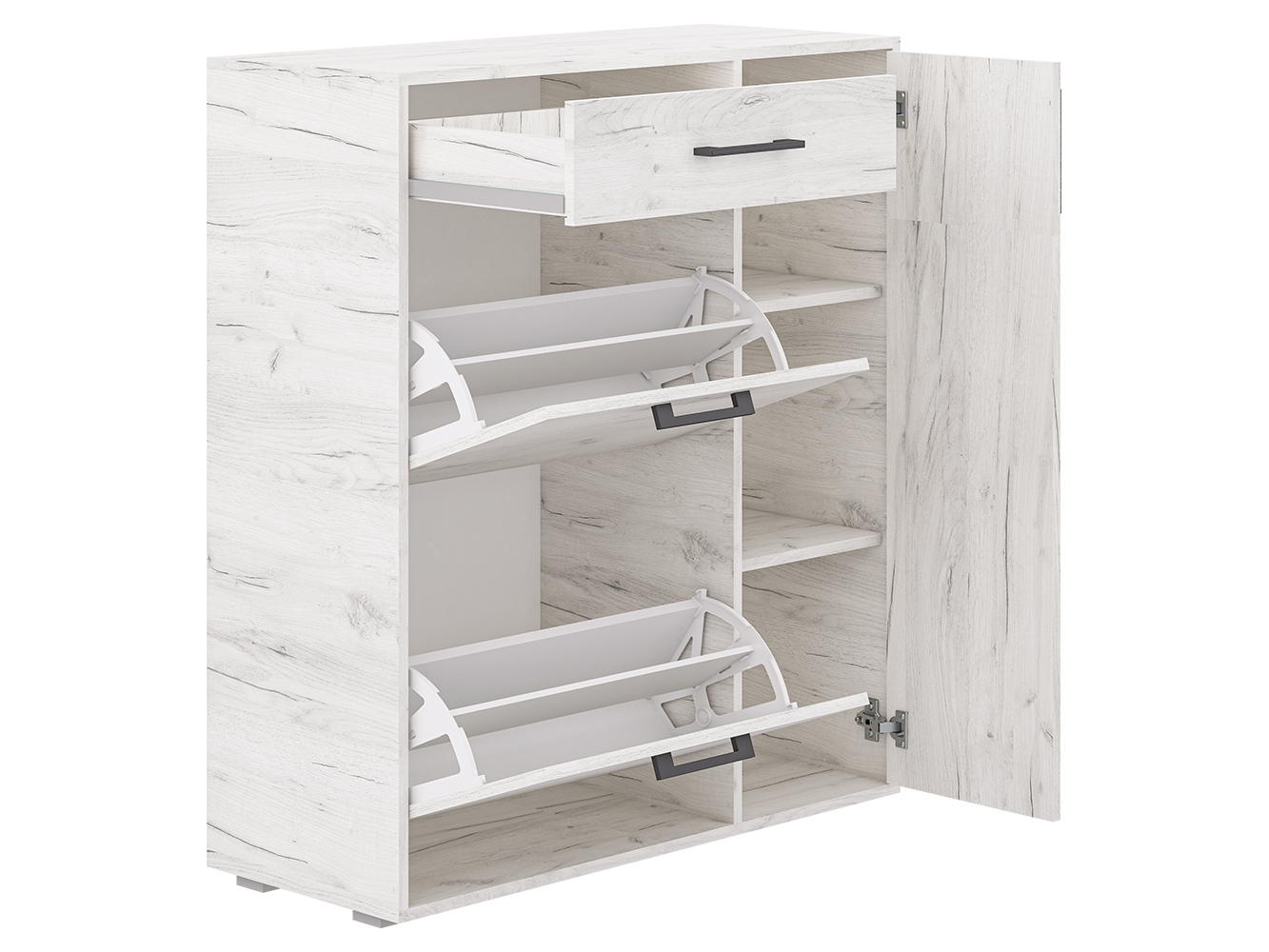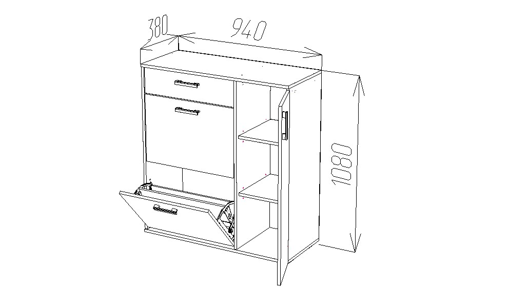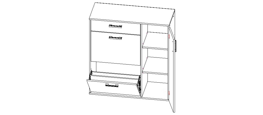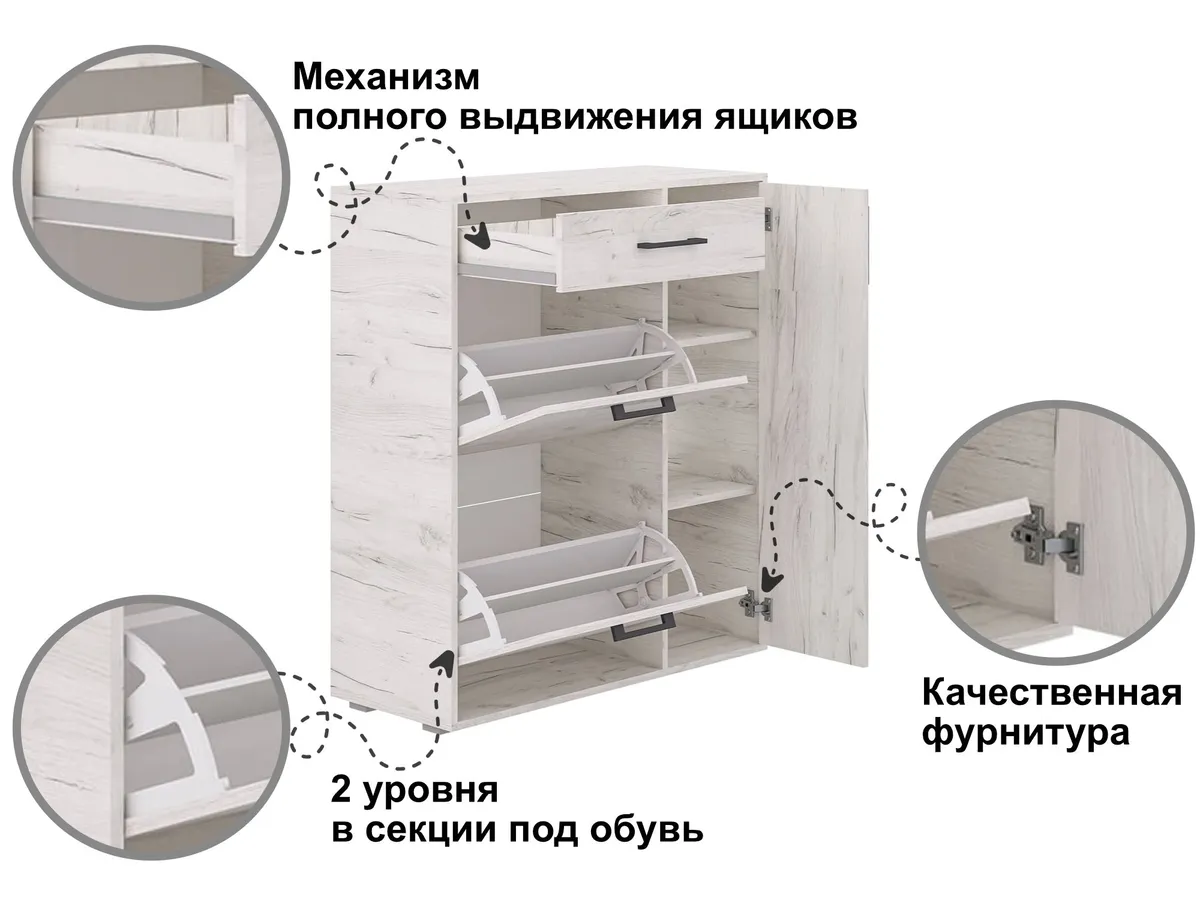 Закрытая тумба для обуви с выдвижным ящиком снабжена: двумя вместительными откидными ящиками приспособленных под хранение, по две секции в каждом, тремя вместительными нишами за распашной дверью. Регулируемые скрытые опоры цвета «хром» компенсируют возможные неровности пола, верхний ящик имеет полное выдвижение