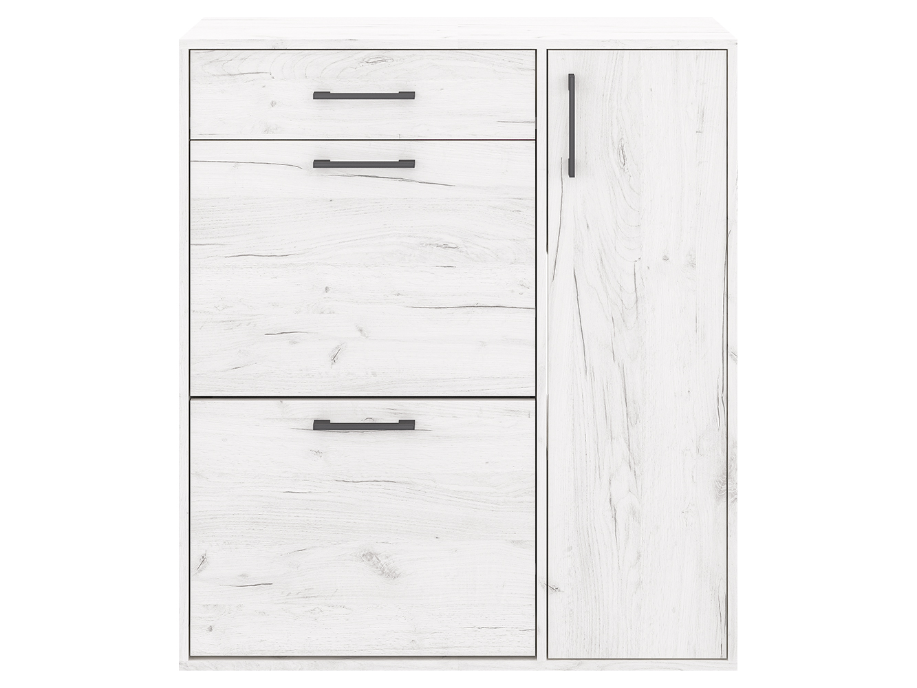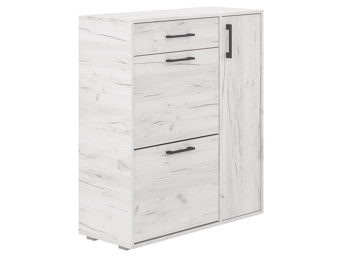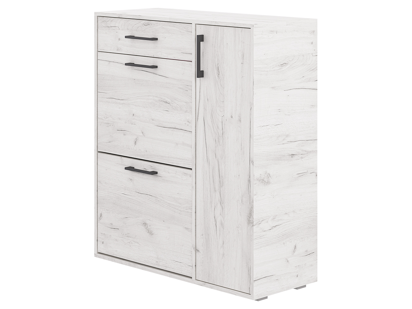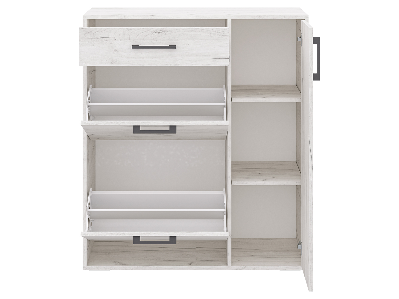 Закрытая тумба для обуви с выдвижным ящиком снабжена: двумя вместительными откидными ящиками приспособленных под хранение, по две секции в каждом, тремя вместительными нишами за распашной дверью. Регулируемые скрытые опоры цвета «хром» компенсируют возможные неровности пола, верхний ящик имеет полное выдвижение