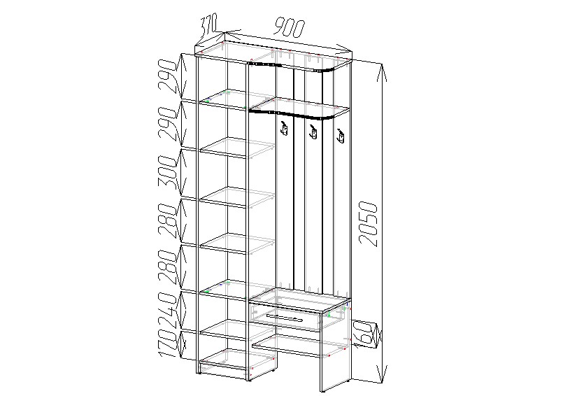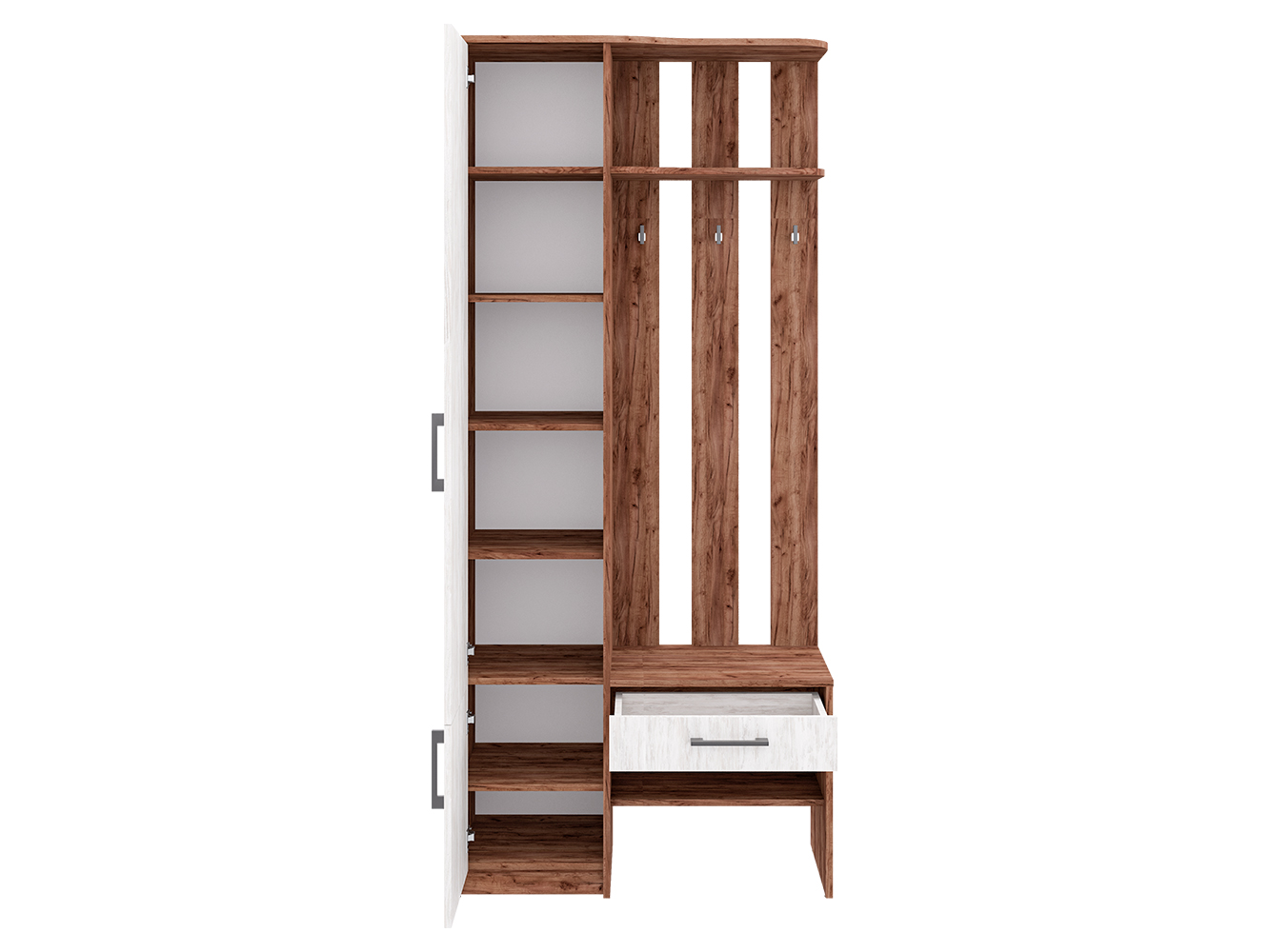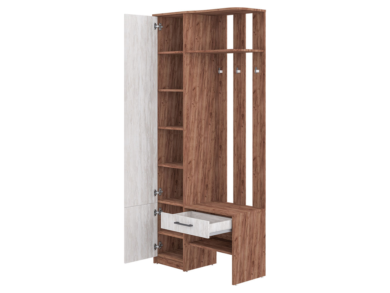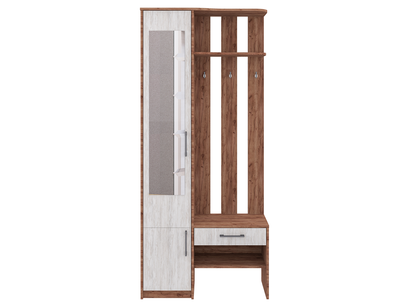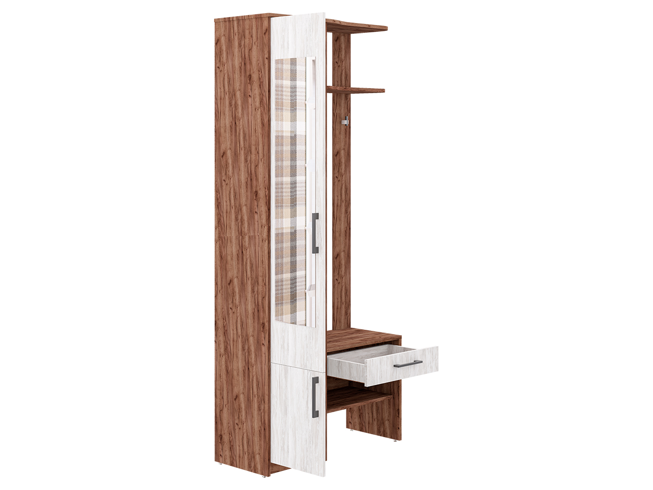 В левой части она выполнена в виде закрытого пенала – внизу за распашной дверью имеются 2 ниши. Верхняя часть за распашной дверью с зеркалом скрывает еще 5 вместительных удобных ниш. Правая часть прихожей открыта и содержит выдвижной ящик для ключей, перчаток и нужных мелочей, 3 крючка для одежды и шляпницу. Конструкция прихожей в нижней правой части представляет собой открытую нишу для обуви. Благодаря выдвижному ящику в прихожей имеется дополнительная открытая полка для сумочек. Благодаря современному дизайну и цветовой гамме изделие станет функциональным и стильным помощником вашего дома.
