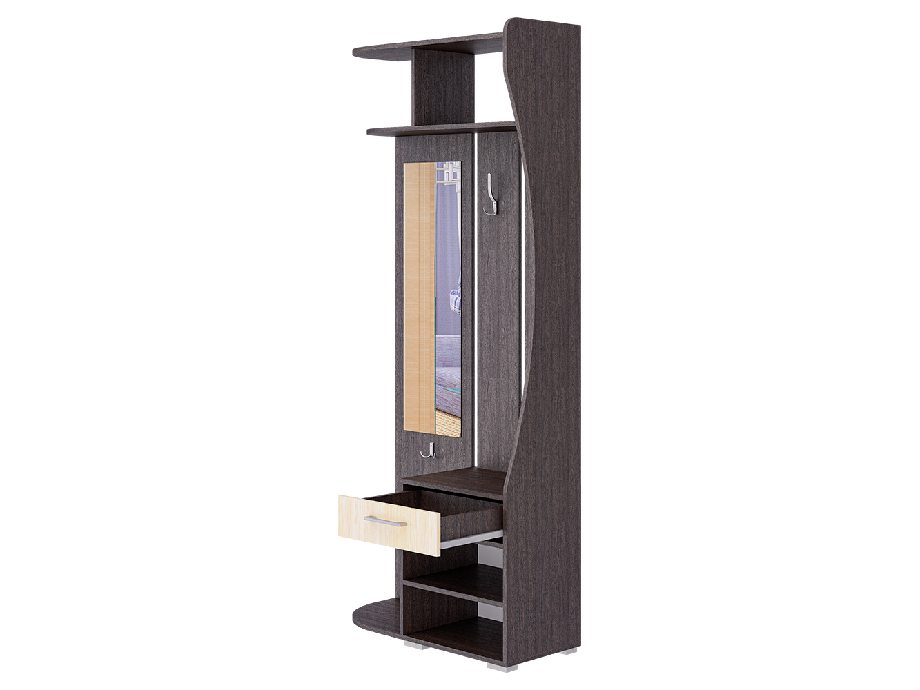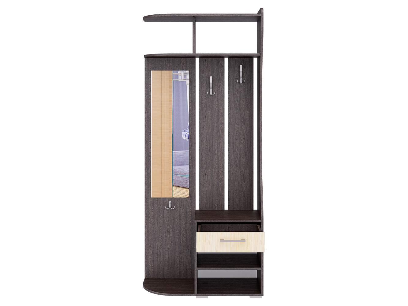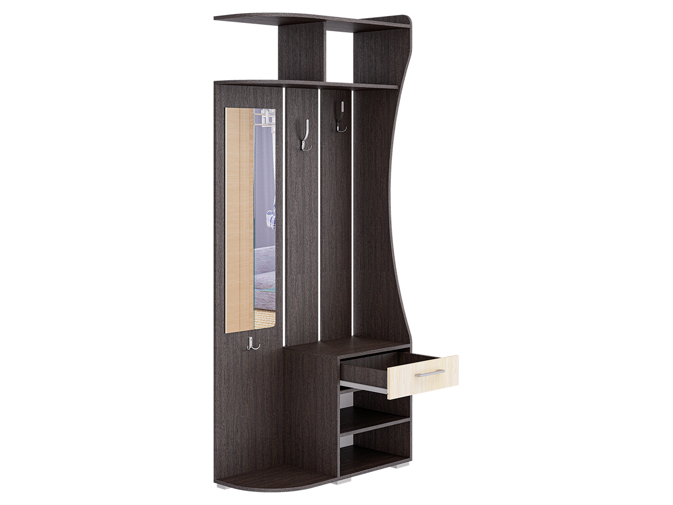 Прихожая ПР-2 вместительна и эргономична одновременно – она имеет достаточное количество крючков и полок для удобства размещения вещей. Вместе с тем, плавные радиусные формы некоторых значимых деталей превращают ее в современное решение. В правой части прихожей расположен выдвижной ящик для ключей, перчаток и других необходимых мелочей. Под ящиком имеются две открытые ниши для обуви, чтобы без лишних движений скинуть любимые туфли и пойти отдыхать. Своей конструкцией выдвижной ящик создает дополнительную открытую полку - здесь удобно размещать сумки и пакеты. Ну и какая прихожая без зеркала? Этот важный элемент учтен в представленной модели. Также большим преимуществом открытой прихожей является наличие крючков, количество которых можно увеличить. Крыша прихожей удачно образует две дополнительные полки для хранения головных уборов и шарфов. Таким образом, прихожая будет уместна не только дома, но и в офисе.