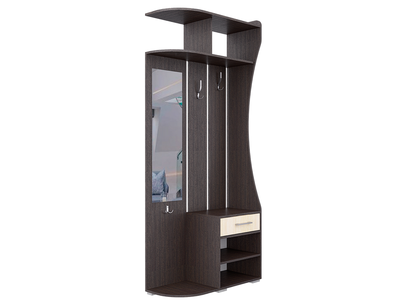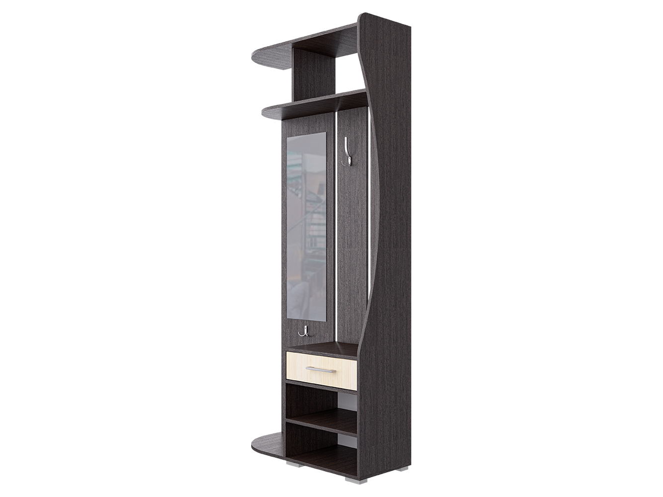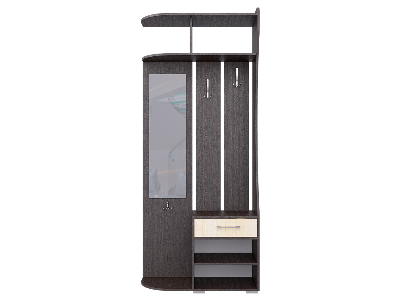 Прихожая ПР-2 вместительна и эргономична одновременно – она имеет достаточное количество крючков и полок для удобства размещения вещей. Вместе с тем, плавные радиусные формы некоторых значимых деталей превращают ее в современное решение. В правой части прихожей расположен выдвижной ящик для ключей, перчаток и других необходимых мелочей. Под ящиком имеются две открытые ниши для обуви, чтобы без лишних движений скинуть любимые туфли и пойти отдыхать. Своей конструкцией выдвижной ящик создает дополнительную открытую полку - здесь удобно размещать сумки и пакеты. Ну и какая прихожая без зеркала? Этот важный элемент учтен в представленной модели. Также большим преимуществом открытой прихожей является наличие крючков, количество которых можно увеличить. Крыша прихожей удачно образует две дополнительные полки для хранения головных уборов и шарфов. Таким образом, прихожая будет уместна не только дома, но и в офисе.