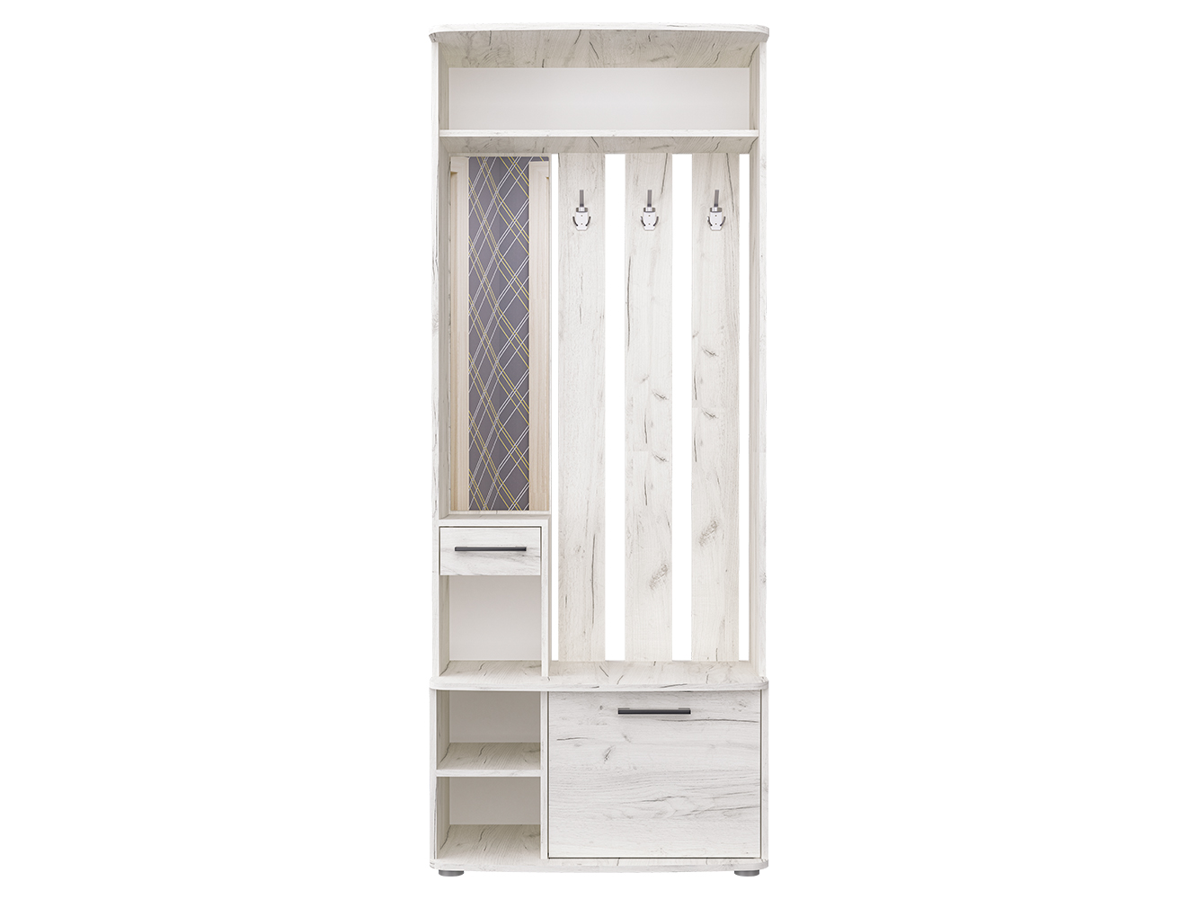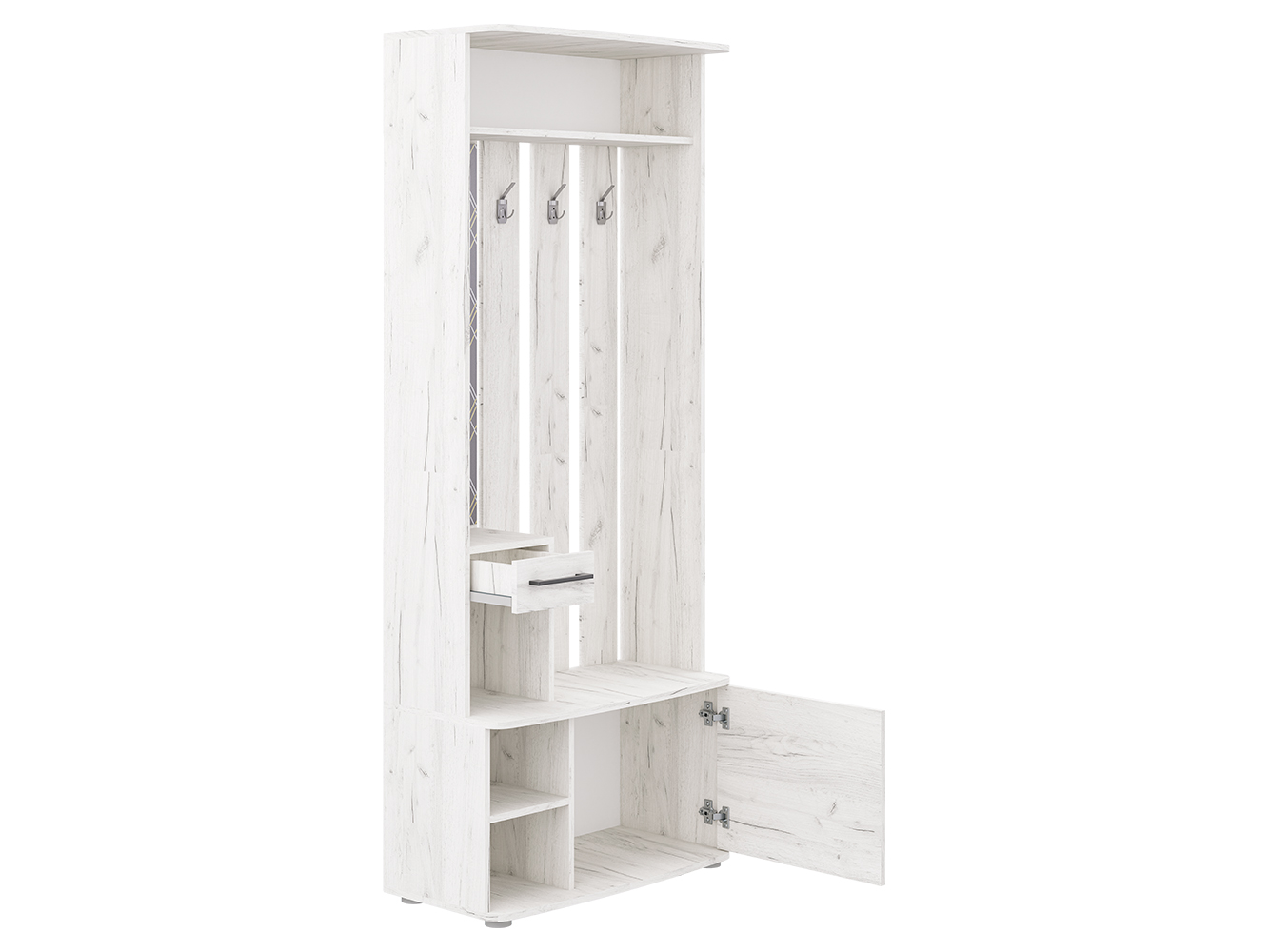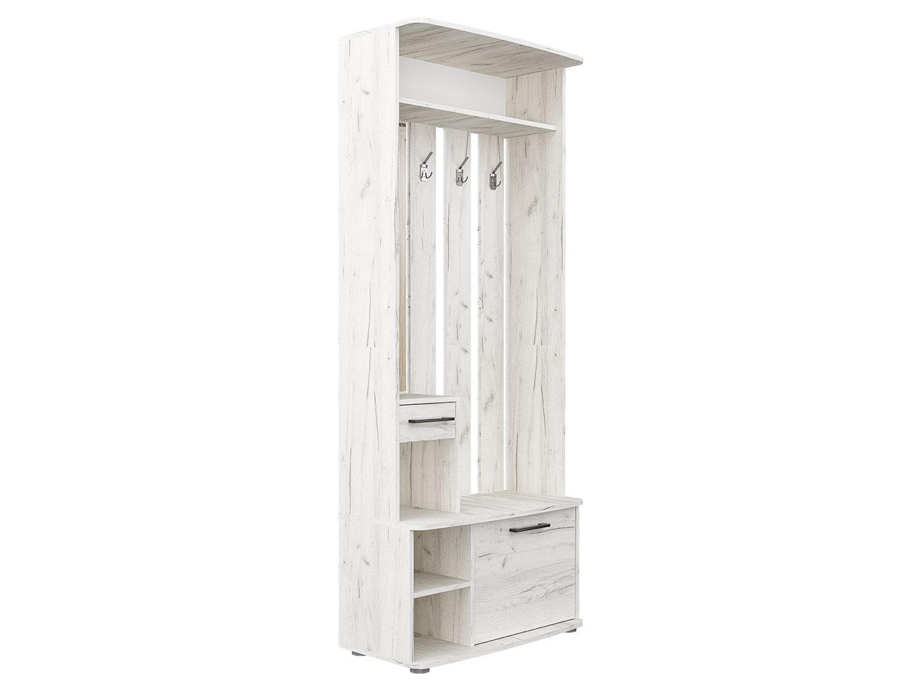 Меньше метра в длину, она впишется в любой интерьер и станет незаменимым домашним помощником. Несмотря на небольшие размеры, модель может вместить в себя немало одежды, обуви и головных уборов. Для этого в правой части ПР-10 есть открытая вешалка с крючками. Под ней – ящик для обуви с откидной дверцей, который также служит полкой для сумок, портфелей, зонтов. Кроме того, в верхней части прихожей оборудована полка для головных уборов и шарфов. Прихожая ПР-10 миниатюрна и эргономична, в ней нет ничего лишнего.