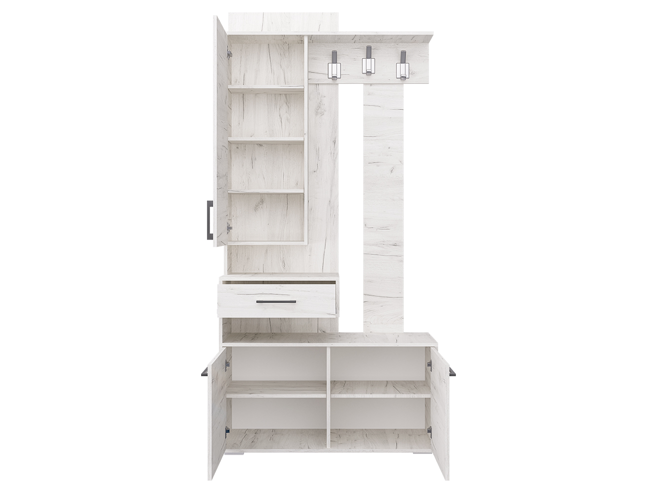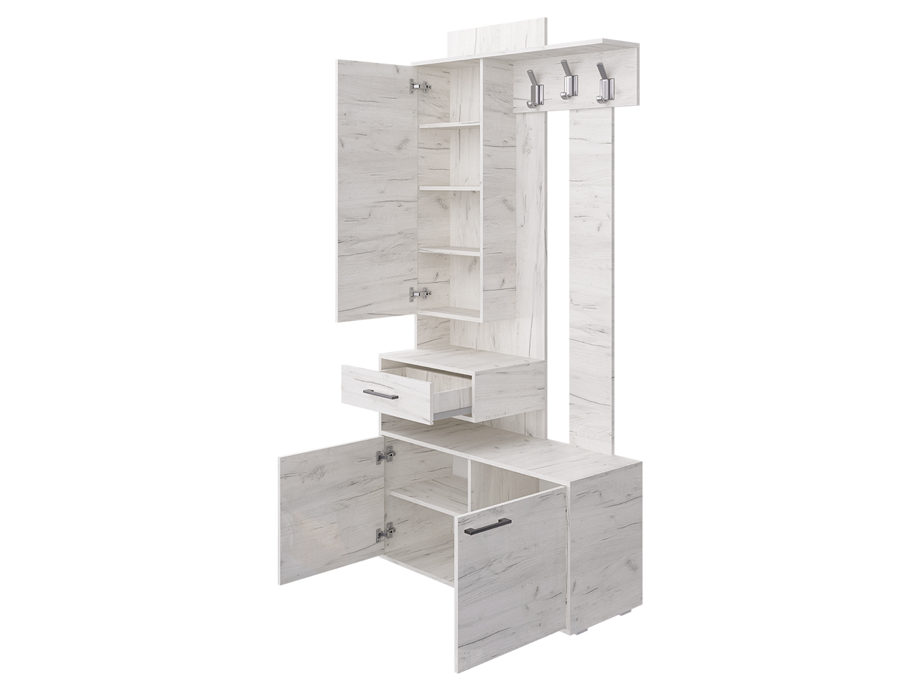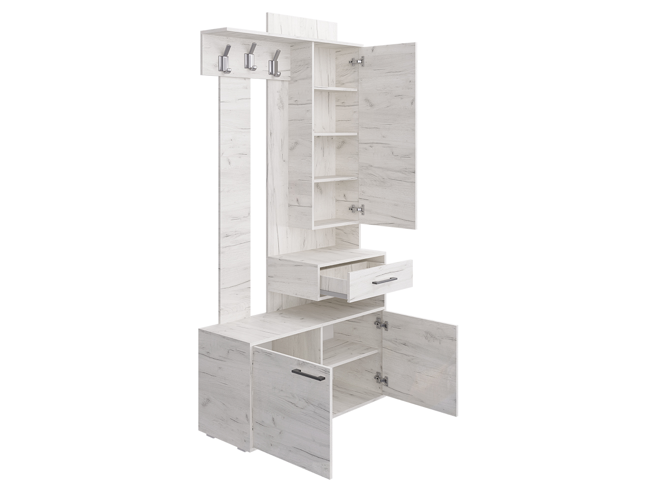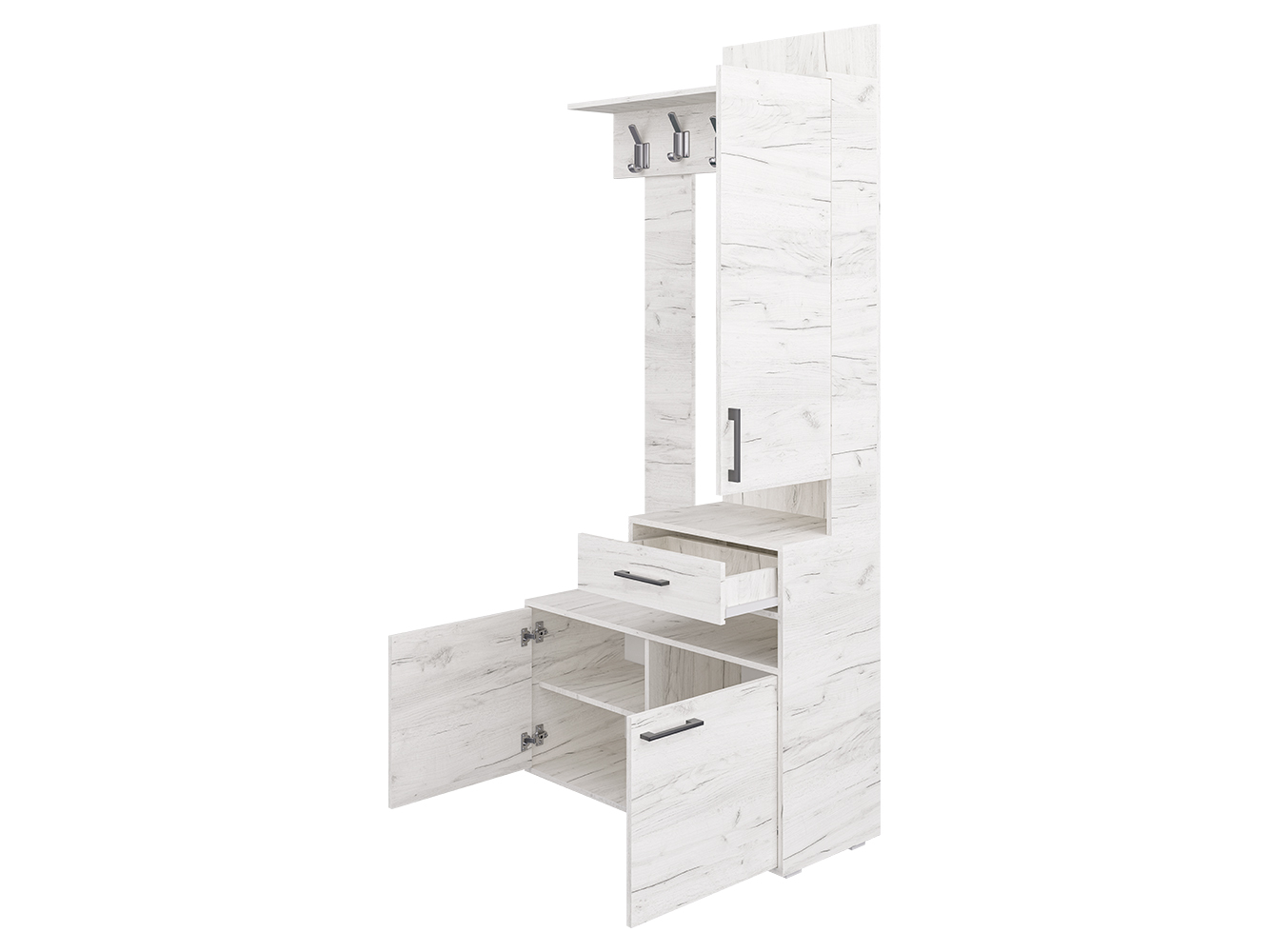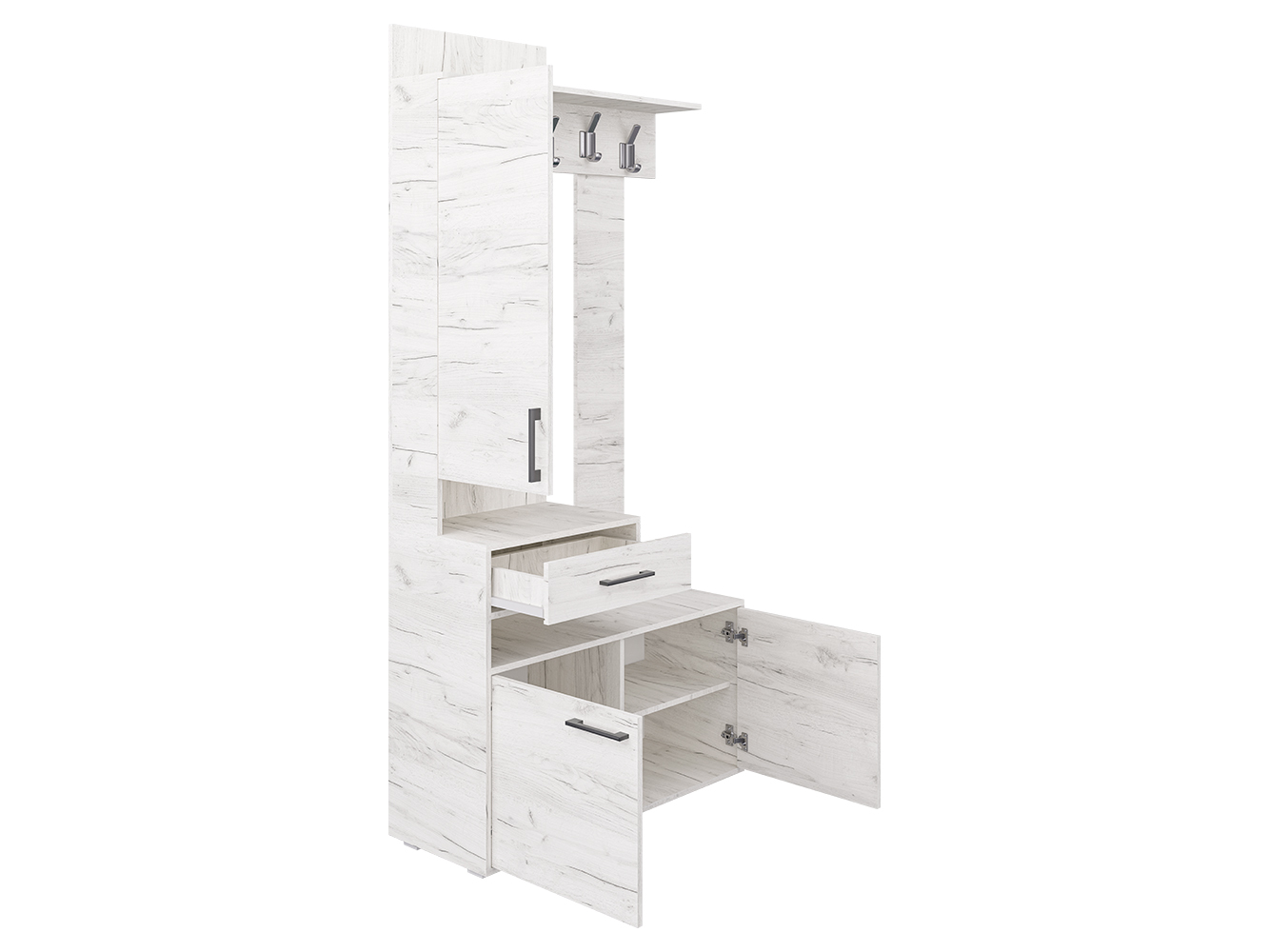 Прихожая ПР-11 придётся по вкусу даже самому притязательному покупателю. Ведь прихожая экономит место, придаёт помещению современный вид и создаёт уют. ПР-11 включает в себя открытую вешалку с крючками, навесной шкаф с зеркалом и полочками и вместительную тумбу для обуви. А навесной ящик для мелочей с создаёт эффект парения, образуя под собой открытую нишу. Такой приём свойственен современному дизайну. Отметим, что все элементы прихожей не существуют сами по себе, они создают собой дополнительные полки и тем самым образуют единый ансамбль.