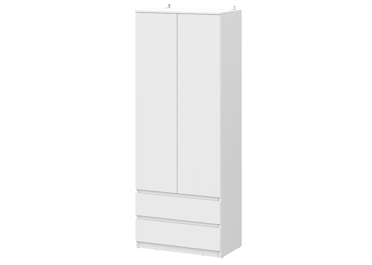 За двумя распашными створками скрывается удобное отделение с металлической штангой для одежды на вешалках и двумя полками для аккуратного хранения белья и аксессуаров.В нижней части расположены два выдвижных ящика,которые отлично подойдут для хранения повседневных вещей.