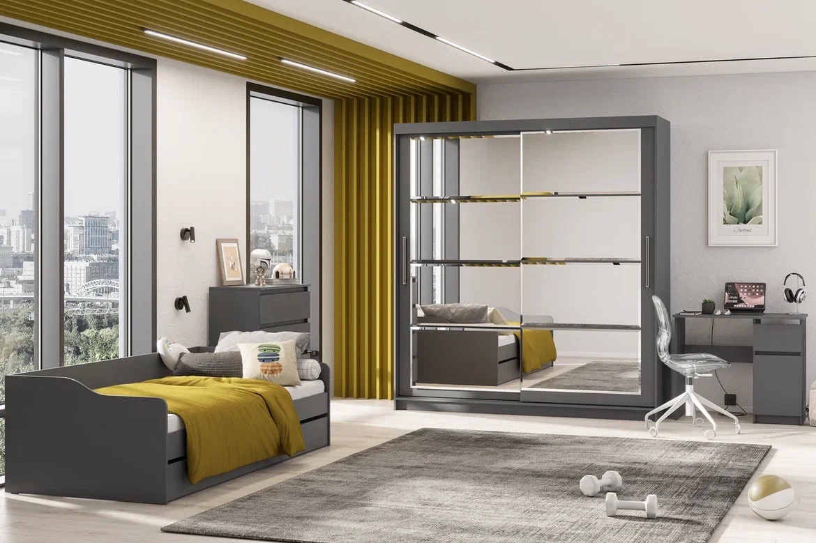 Шкаф-купе «ШКП 3» Макс Графит в элегантном сером оттенке — это не только удобное место для хранения, но и эффектная деталь интерьера. Модель украшена восемью большими зеркалами с фацетом, которые визуально расширяют пространство и добавляют комнате света. Раздвижные дверцы шкафа с универсальными створками позволяют экономить место, что делает его отличным выбором даже для небольших комнат.
