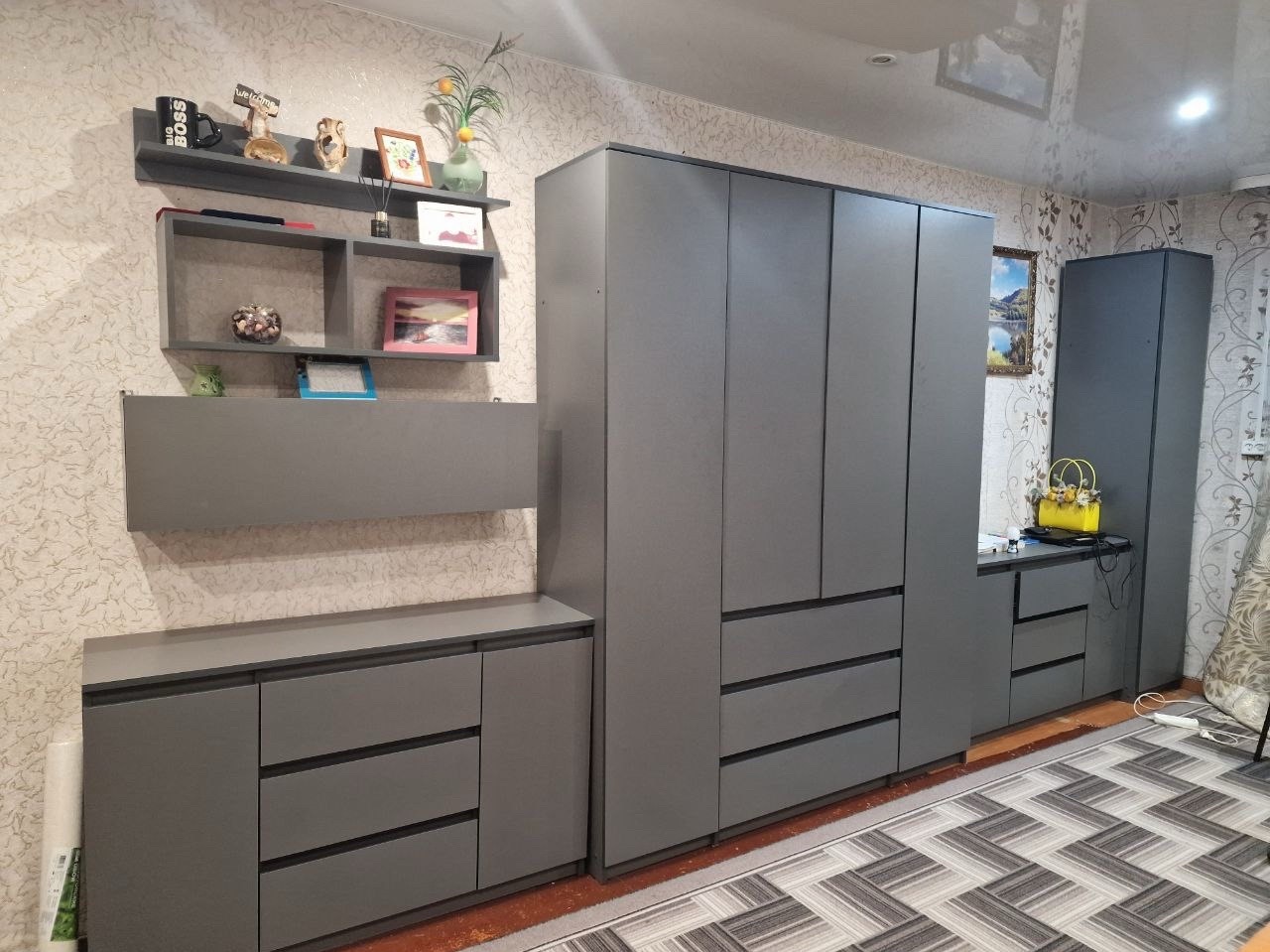 Шкаф изготовлен из высококачественного ЛДСП в цвете «Графит серый» и выполнен в минималистичном стиле, поэтому створка не имеет ручки и открывается за выступающий торец фасада.