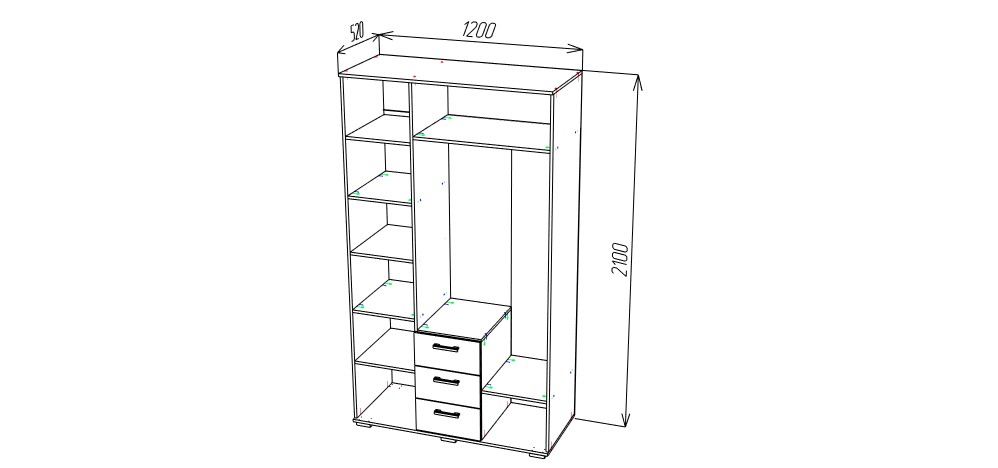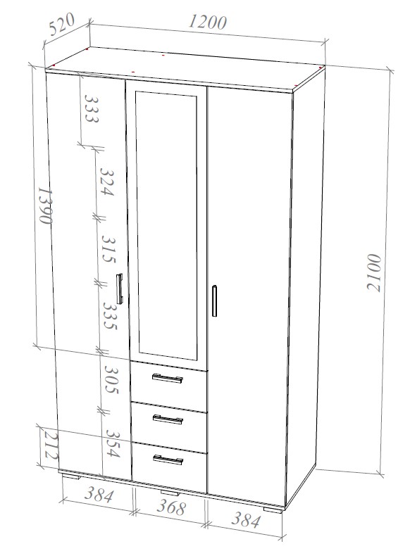 Модель удивляет своим изяществом, несмотря на габариты. И всё это благодаря особой конструкции: за распашными дверцами скрываются штанга и вместительные полки. Также шкаф оборудован тремя выдвижными ящиками по центру и дверцей с зеркалом. Изюминка изделия состоит в том, что ящики не скрыты внутри, а составляют часть фасада модели. Именно это делает облик шкафа современным и лёгким. Конструкция включает в себя: семь вместительных ниш, продольная полка, штанга для одежды, стационарная тумба с тремя выдвижными ящиками, зеркало. Ящики имеют полное плавное выдвижение за счёт телескопических шариковых направляющих. Регулируемые хромированные опоры компенсируют возможные неровности пола. Изделие выполнено из высококачественного, износостойкого и экологичного материала – ЛДСП класса Е1, толщиной 16мм. Края обработаны ударопрочной кромкой ПВХ, что значительно увеличивает срок эксплуатации изделия. Для сборки используется фурнитура от ведущих мировых производителей. Все изделия фабрики сертифицированы и абсолютно безопасны для здоровья.