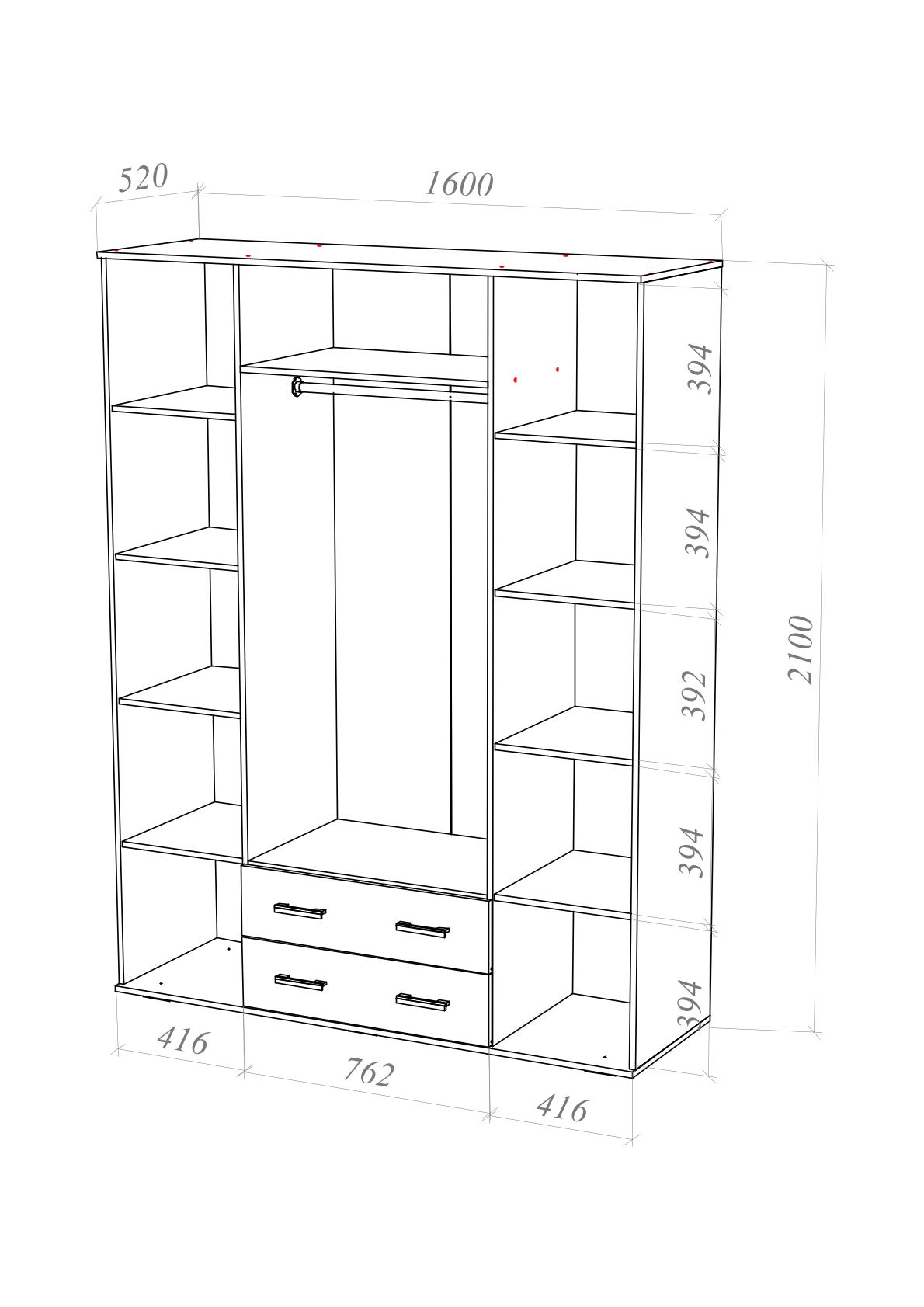 Наличие двух зеркал добавит больше света в помещение и в очередной раз подчеркнет интерьер Вашей комнаты. Шкаф имеет 4 распашные двери, на двух из которых расположены зеркала. В нижней части шкафа по центру предусмотрены два выдвижных ящика для белья. По обеим сторонам модели за распашными дверьми находятся вместительные полки. Центральная часть оснащена штангой для одежды и верхней нишей. Конструкция с четырьмя распашными дверьми включает в себя: десять полок, две вместительные ниши, штанга для одежды, четыре выдвижных ящика, зеркало. Ящики имеют полное плавное выдвижение за счёт телескопических направляющих. Регулируемые скрытые опоры компенсируют возможные неровности пола. Изделие выполнено из высококачественного, износостойкого и экологичного материала – ЛДСП класса Е1, толщиной 16мм. Края обработаны ударопрочной кромкой ПВХ, что значительно увеличивает срок эксплуатации изделия. Для сборки используется фурнитура от ведущих мировых производителей. Все изделия фабрики сертифицированы и абсолютно безопасны для здоровья.