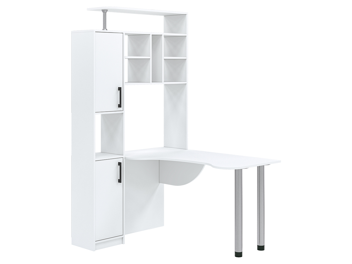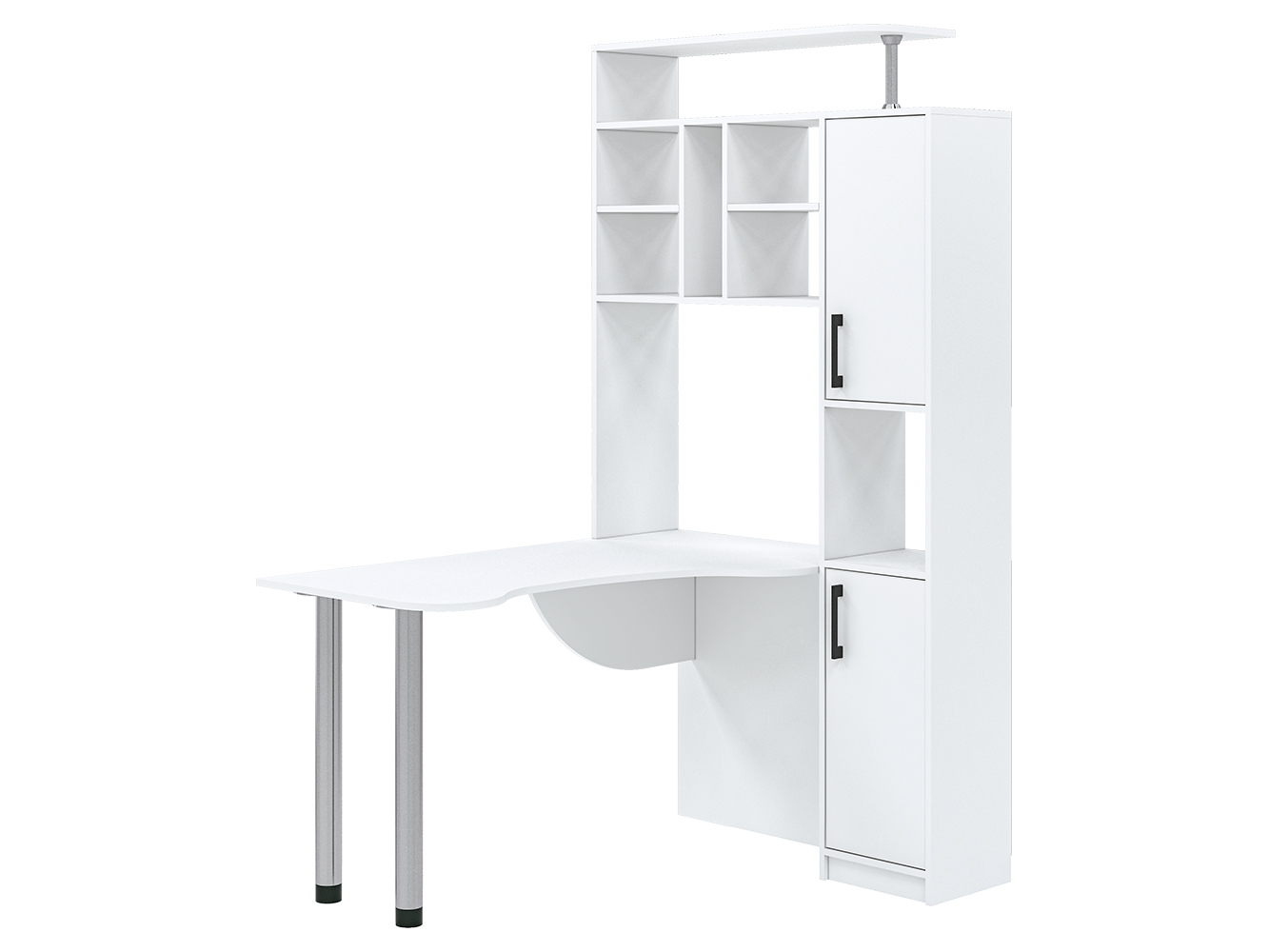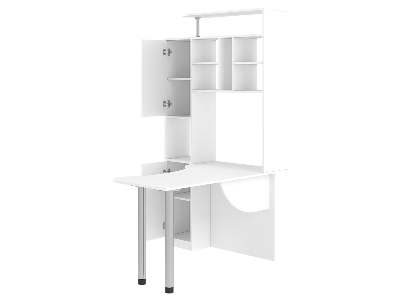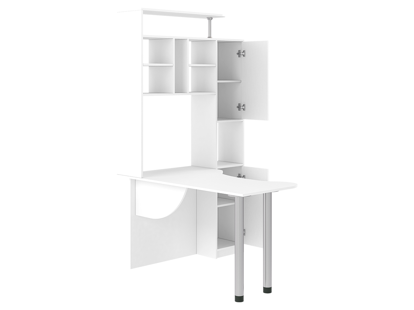 Помимо привычных столешницы и полок, здесь присутствует пенал с распашными дверцами. Его визуально разделяет на две части открытая ниша. Также стол имеет надстройку, образующую удобную конструкцию с множеством открытых полок и места для CD-дисков. На крыше надстройки можно разместить акустическую систему или дополнительную технику, документы и сувениры. Если говорить об основном элементе, столешнице, то она имеет фигурную форму, благодаря чему рабочее пространство является большим и удобным. Столешница с одной стороны опирается на две металлические регулируемые по высоте ножки цвета хром. Эти элементы делают конструкцию современной и эстетически привлекательной. Данная модель стола будет интересна как для дома, так и для офиса.