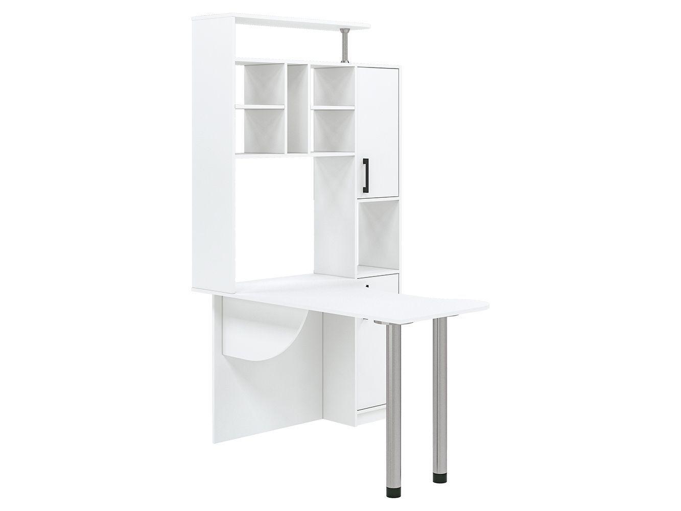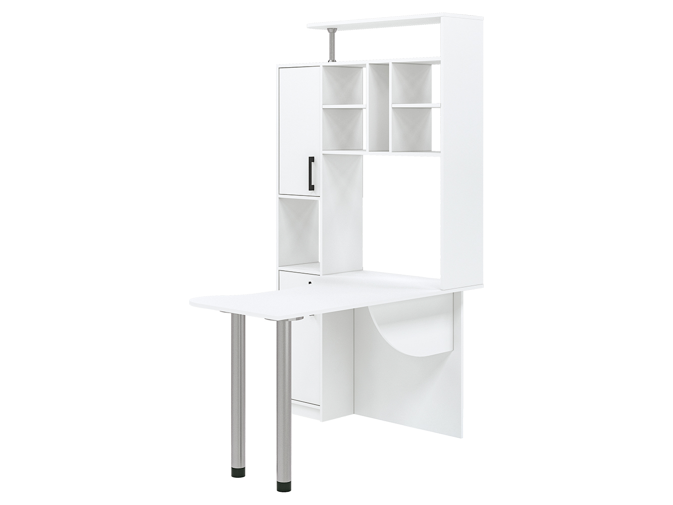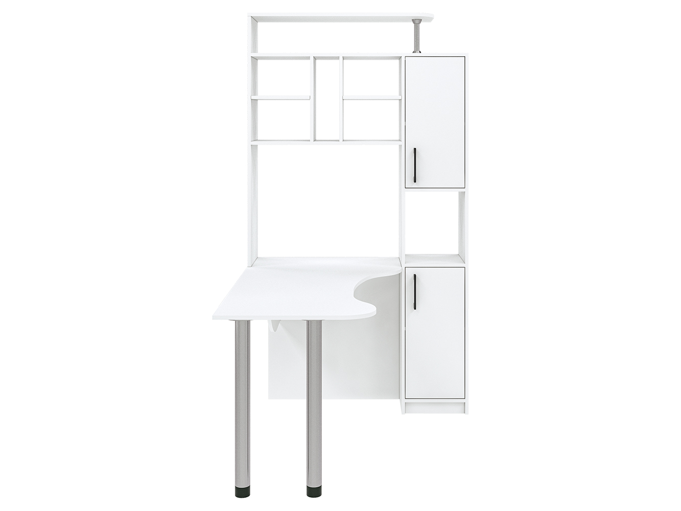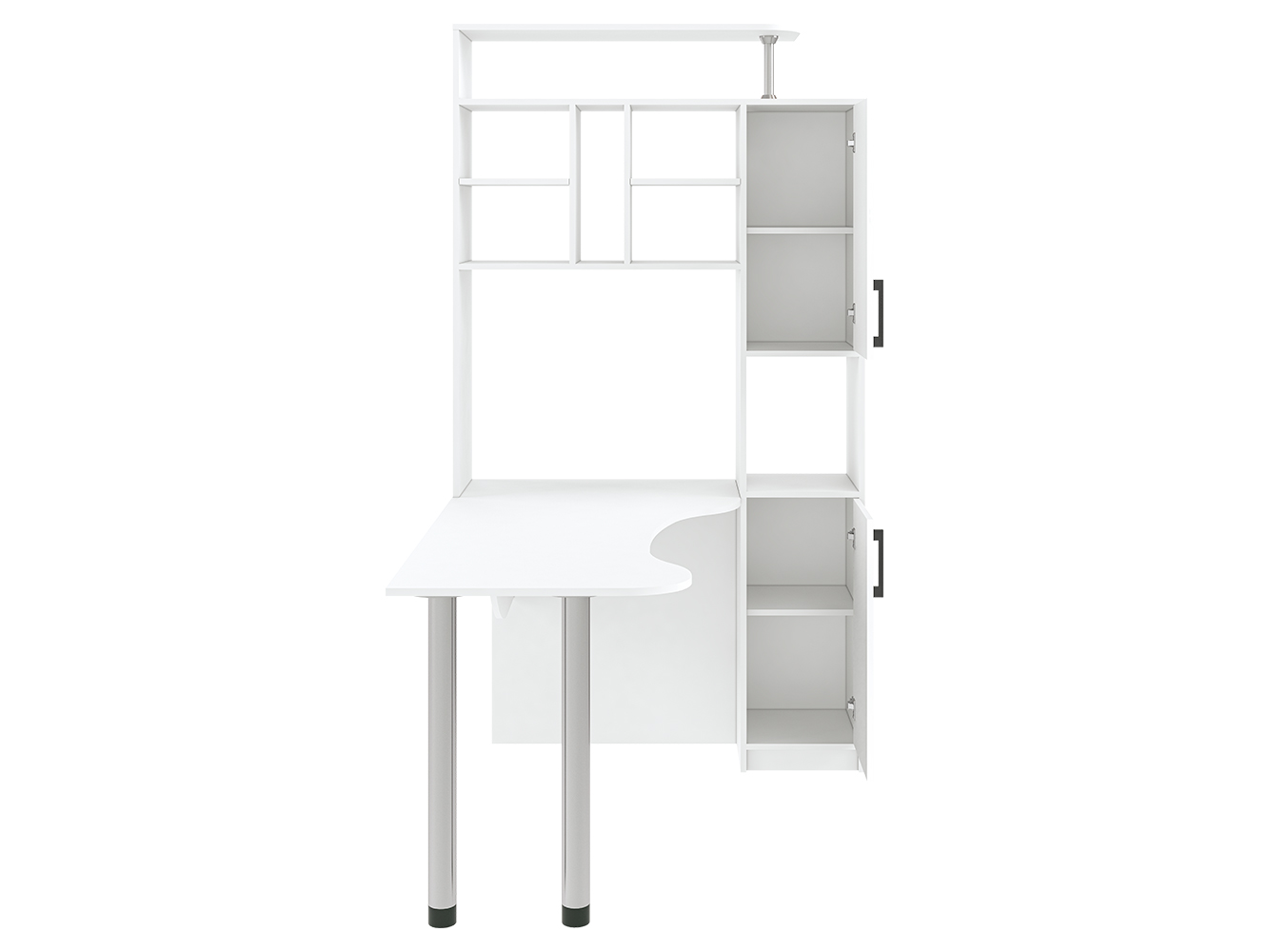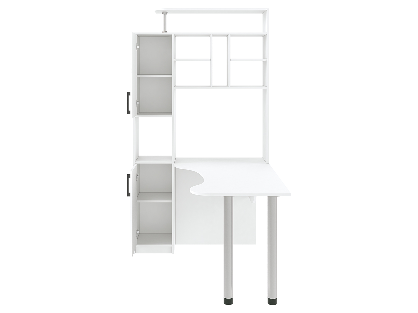 Помимо привычных столешницы и полок, здесь присутствует пенал с распашными дверцами. Его визуально разделяет на две части открытая ниша. Также стол имеет надстройку, образующую удобную конструкцию с множеством открытых полок и места для CD-дисков. На крыше надстройки можно разместить акустическую систему или дополнительную технику, документы и сувениры. Если говорить об основном элементе, столешнице, то она имеет фигурную форму, благодаря чему рабочее пространство является большим и удобным. Столешница с одной стороны опирается на две металлические регулируемые по высоте ножки цвета хром. Эти элементы делают конструкцию современной и эстетически привлекательной. Данная модель стола будет интересна как для дома, так и для офиса.