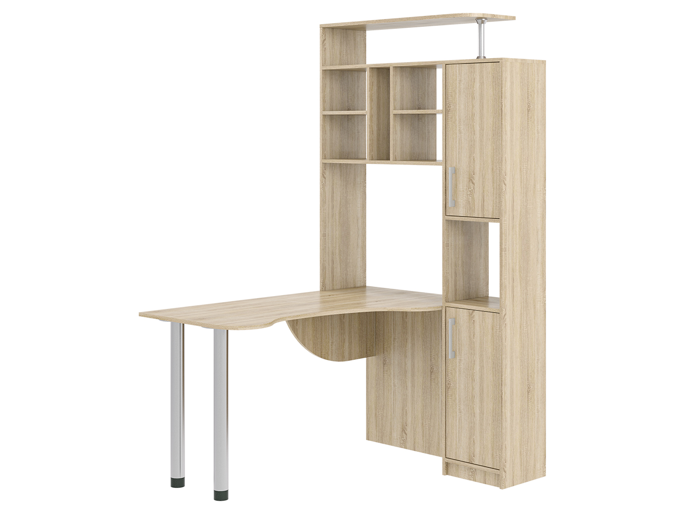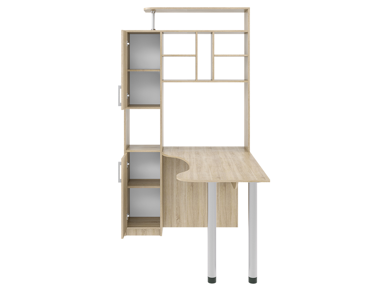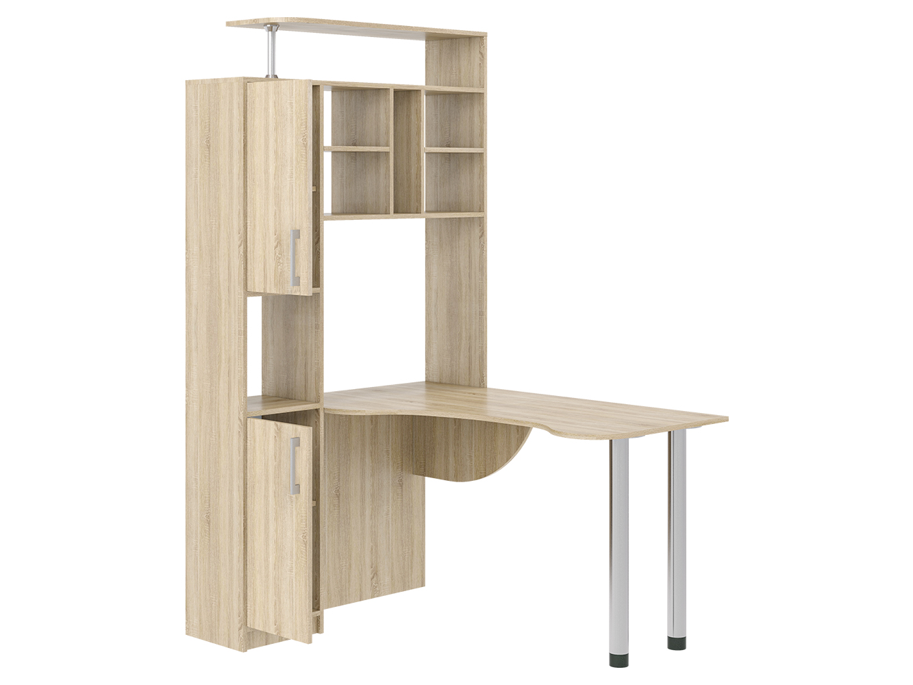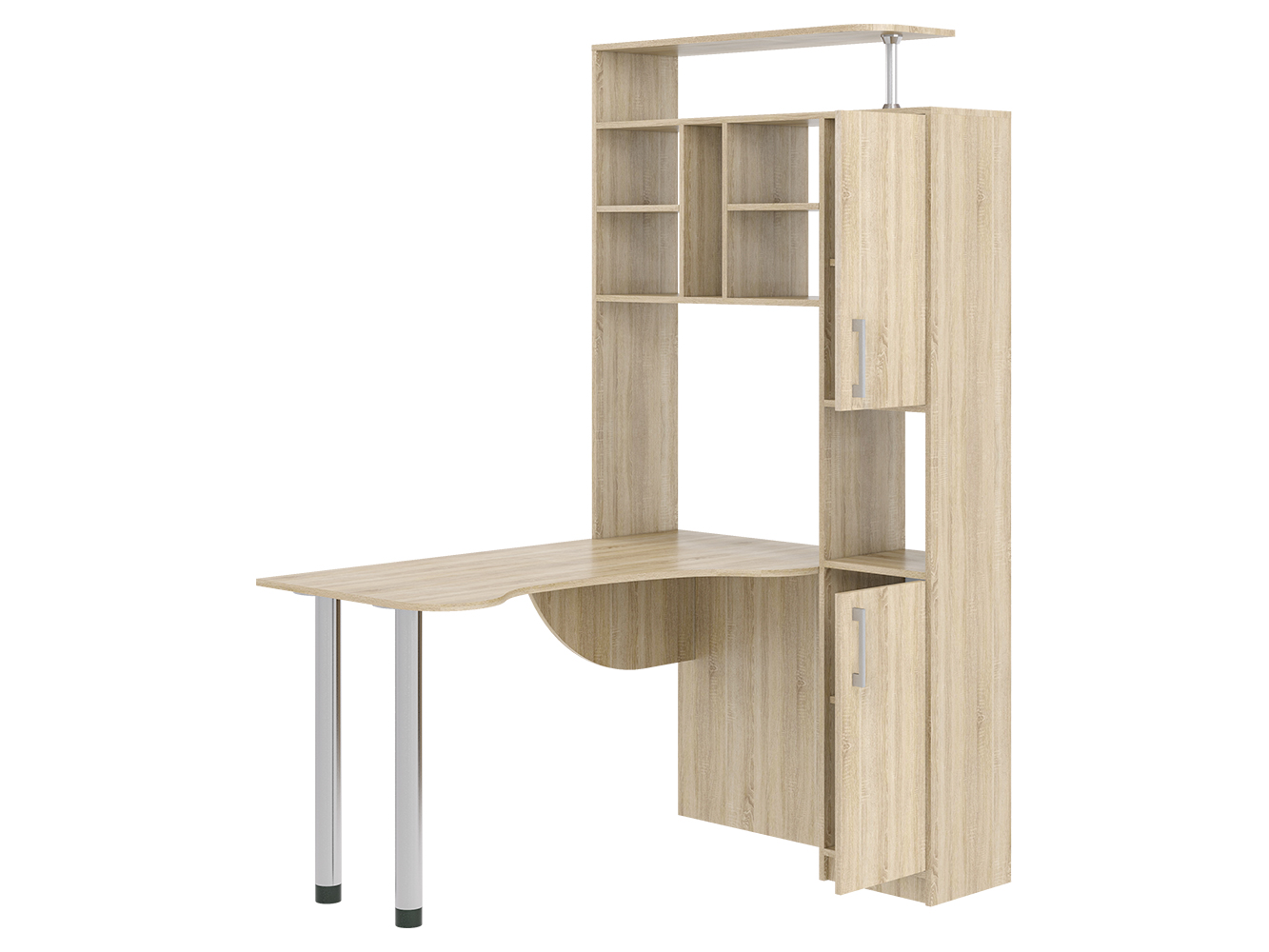 Помимо привычных столешницы и полок, здесь присутствует пенал с распашными дверцами. Его визуально разделяет на две части открытая ниша. Также стол имеет надстройку, образующую удобную конструкцию с множеством открытых полок и места для CD-дисков. На крыше надстройки можно разместить акустическую систему или дополнительную технику, документы и сувениры. Если говорить об основном элементе, столешнице, то она имеет фигурную форму, благодаря чему рабочее пространство является большим и удобным. Столешница с одной стороны опирается на две металлические регулируемые по высоте ножки цвета хром. Эти элементы делают конструкцию современной и эстетически привлекательной. Данная модель стола будет интересна как для дома, так и для офиса.