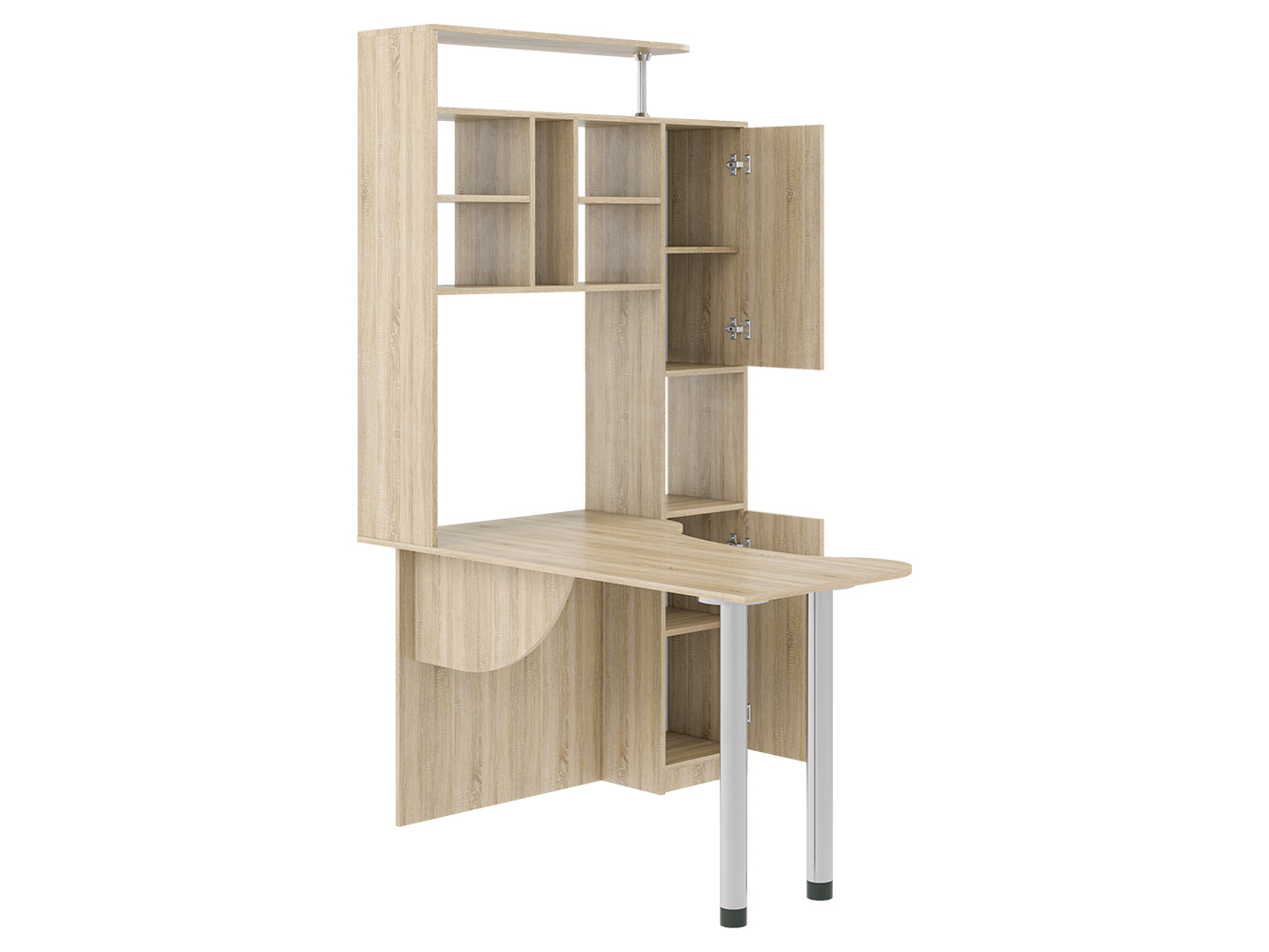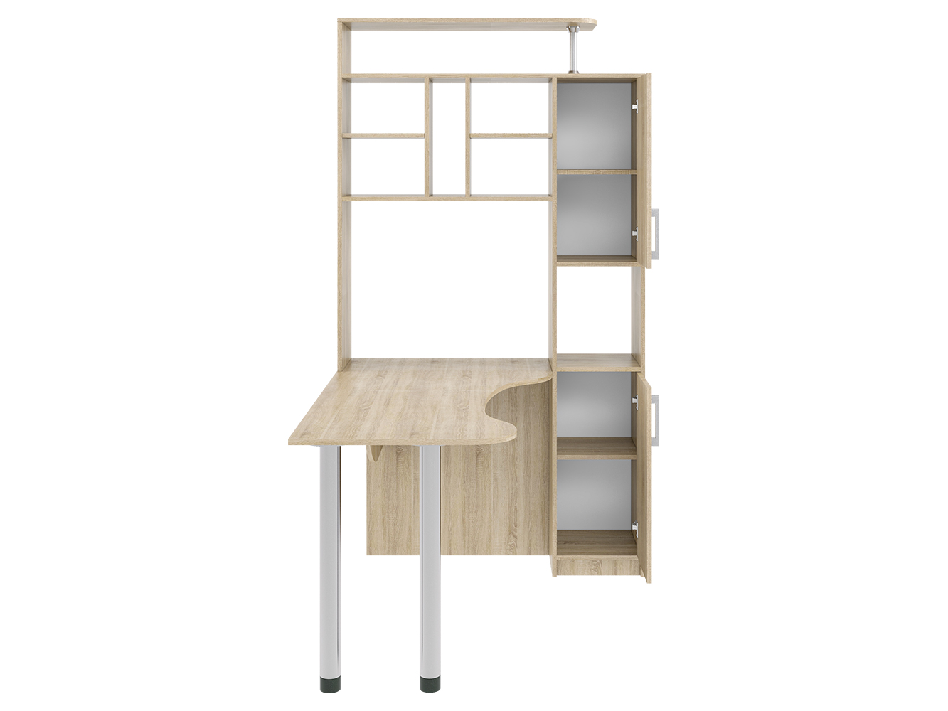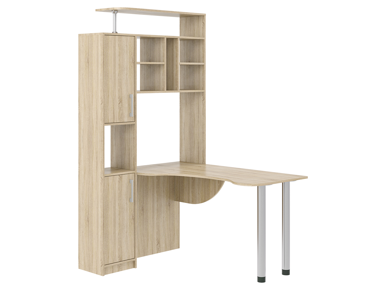 Помимо привычных столешницы и полок, здесь присутствует пенал с распашными дверцами. Его визуально разделяет на две части открытая ниша. Также стол имеет надстройку, образующую удобную конструкцию с множеством открытых полок и места для CD-дисков. На крыше надстройки можно разместить акустическую систему или дополнительную технику, документы и сувениры. Если говорить об основном элементе, столешнице, то она имеет фигурную форму, благодаря чему рабочее пространство является большим и удобным. Столешница с одной стороны опирается на две металлические регулируемые по высоте ножки цвета хром. Эти элементы делают конструкцию современной и эстетически привлекательной. Данная модель стола будет интересна как для дома, так и для офиса.