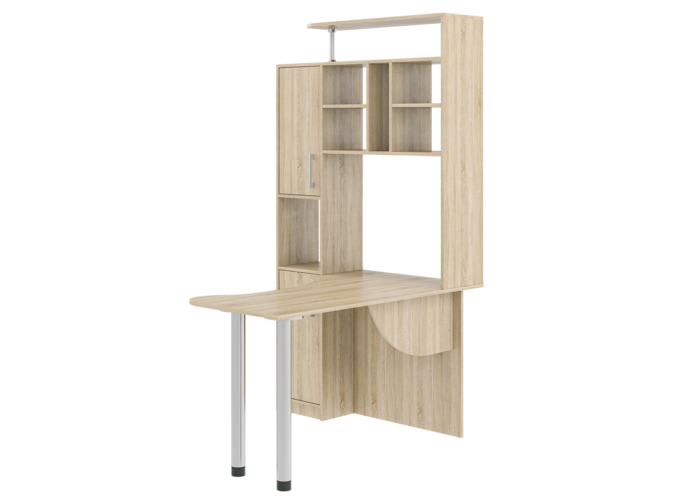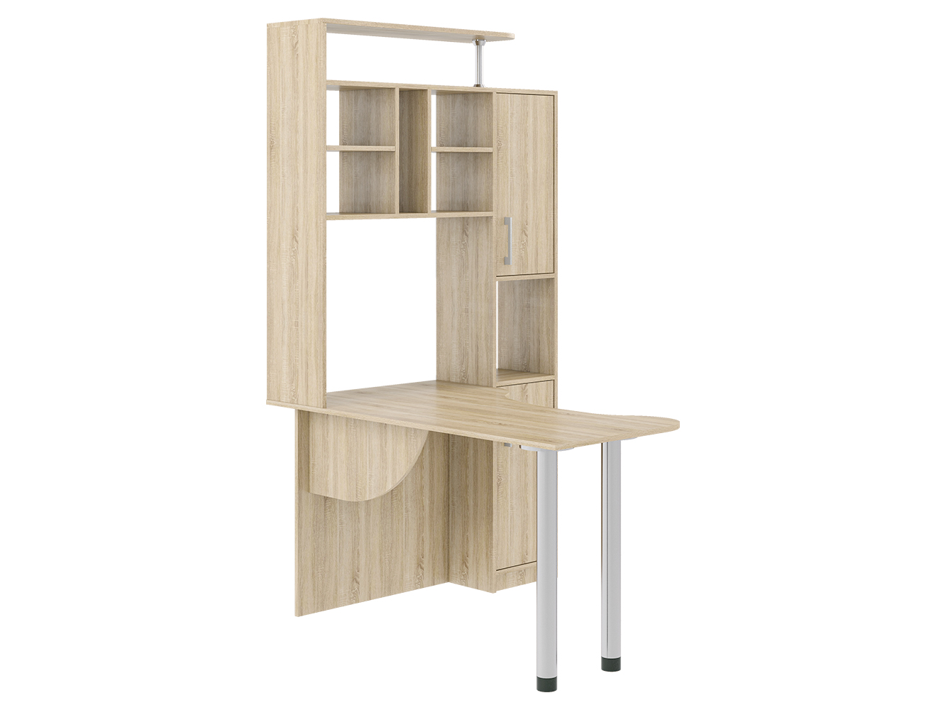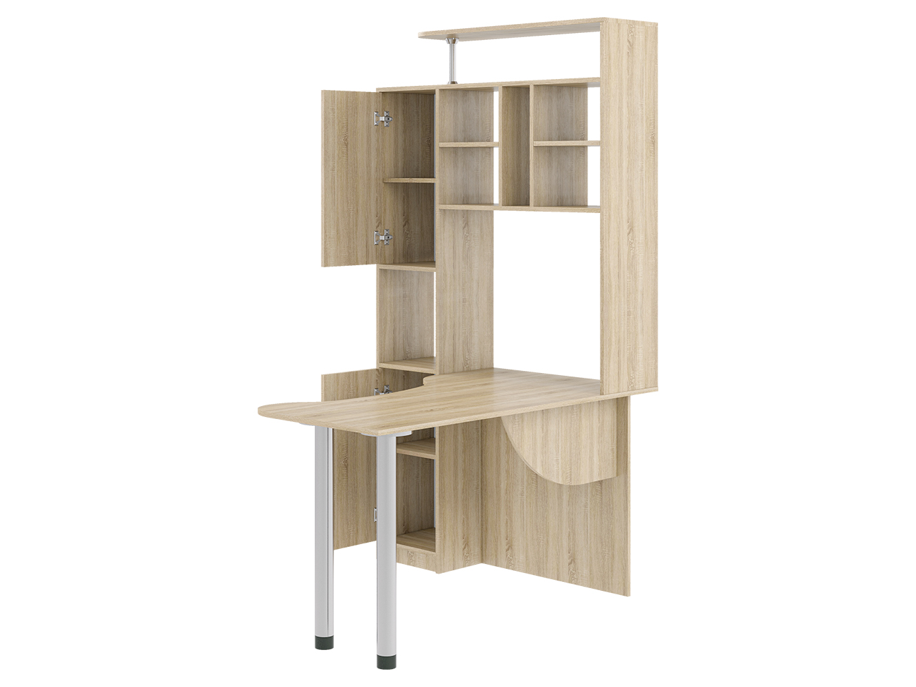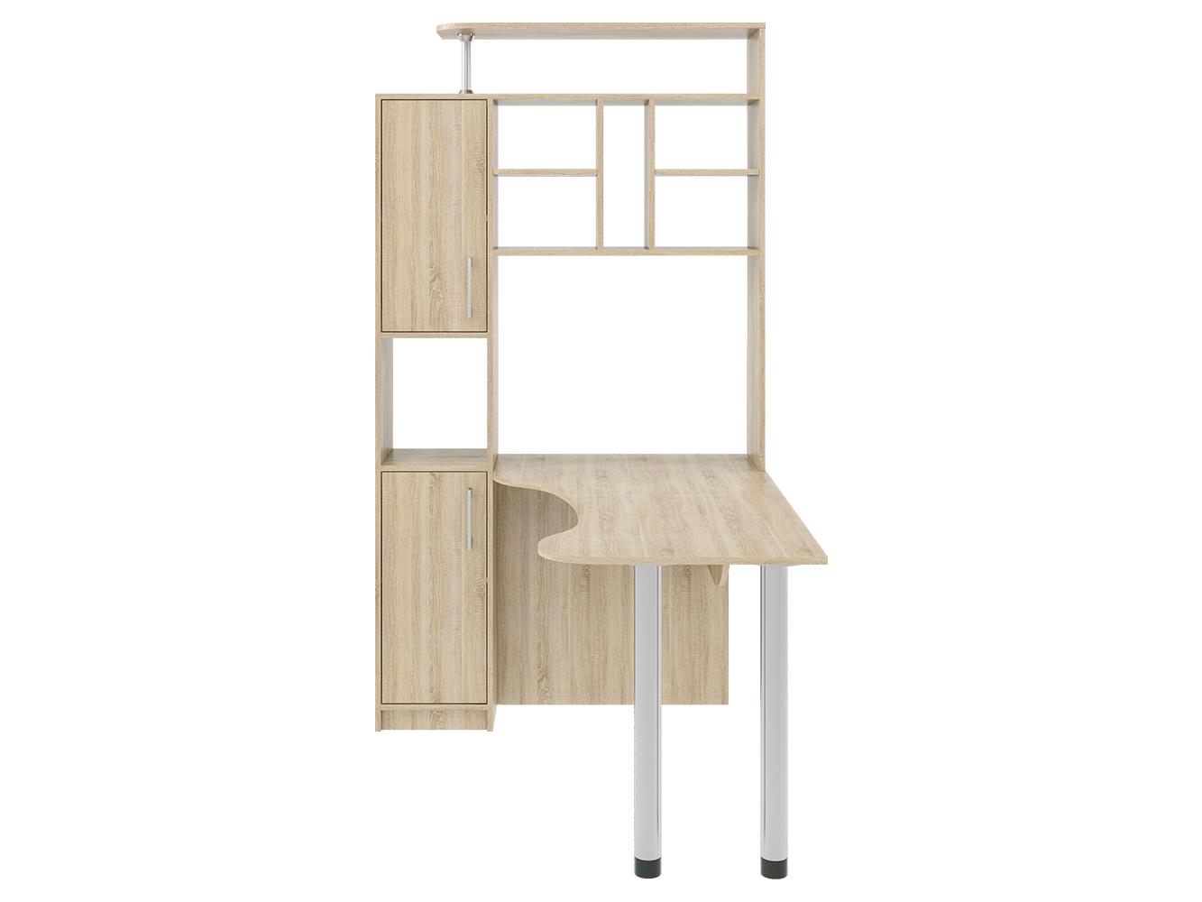 Помимо привычных столешницы и полок, здесь присутствует пенал с распашными дверцами. Его визуально разделяет на две части открытая ниша. Также стол имеет надстройку, образующую удобную конструкцию с множеством открытых полок и места для CD-дисков. На крыше надстройки можно разместить акустическую систему или дополнительную технику, документы и сувениры. Если говорить об основном элементе, столешнице, то она имеет фигурную форму, благодаря чему рабочее пространство является большим и удобным. Столешница с одной стороны опирается на две металлические регулируемые по высоте ножки цвета хром. Эти элементы делают конструкцию современной и эстетически привлекательной. Данная модель стола будет интересна как для дома, так и для офиса.